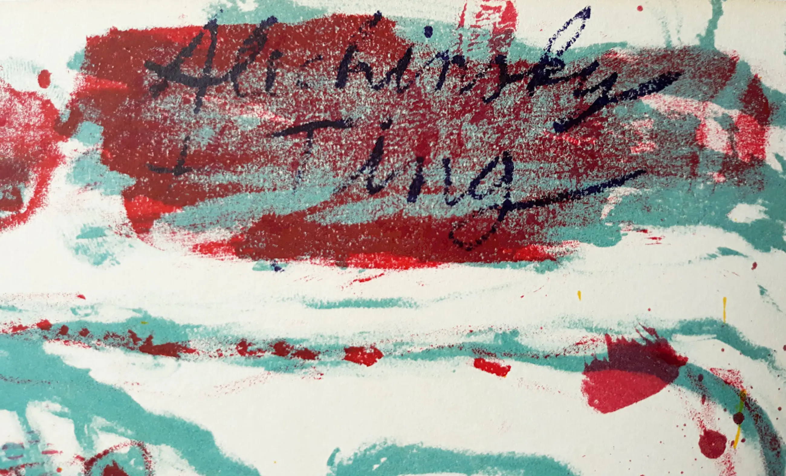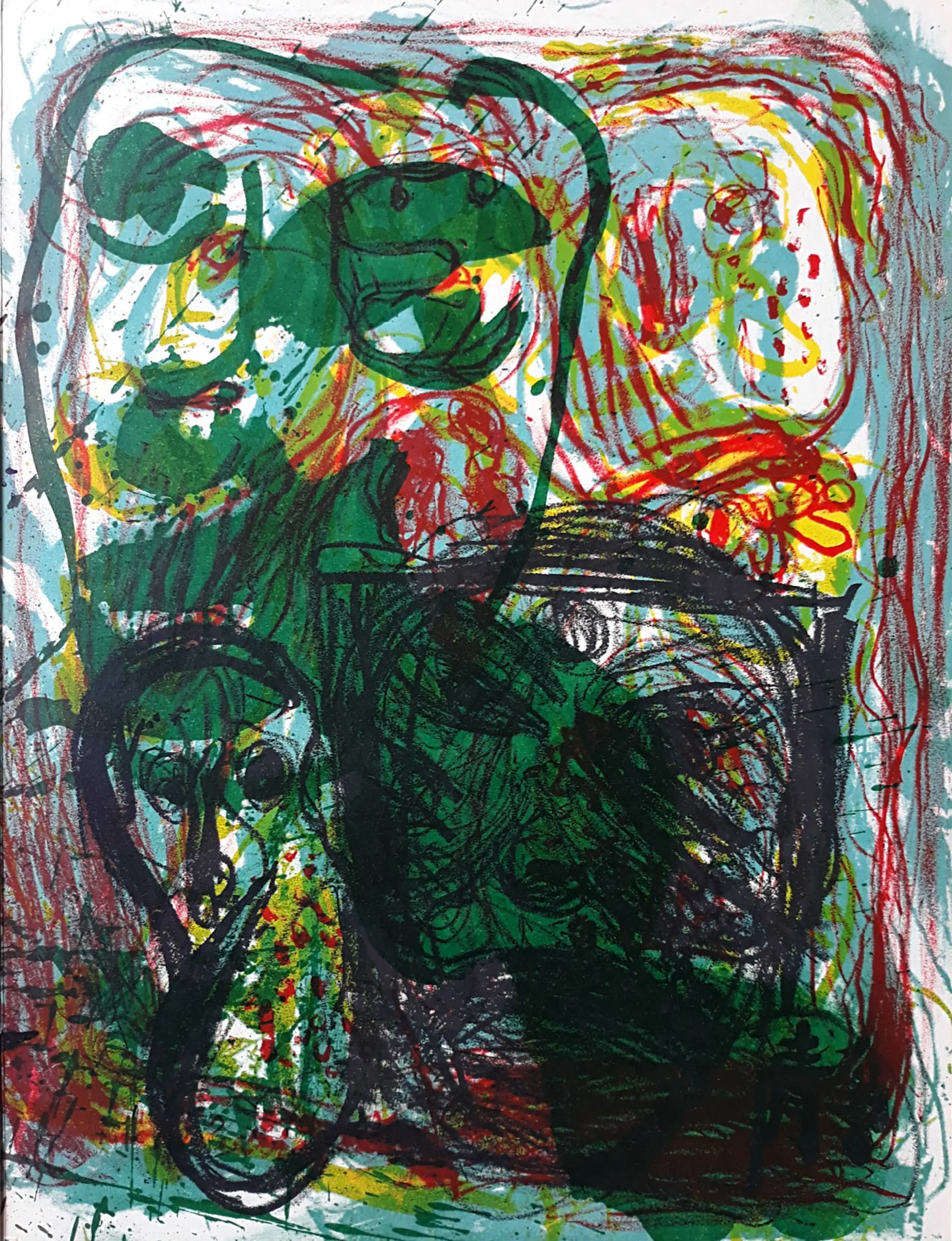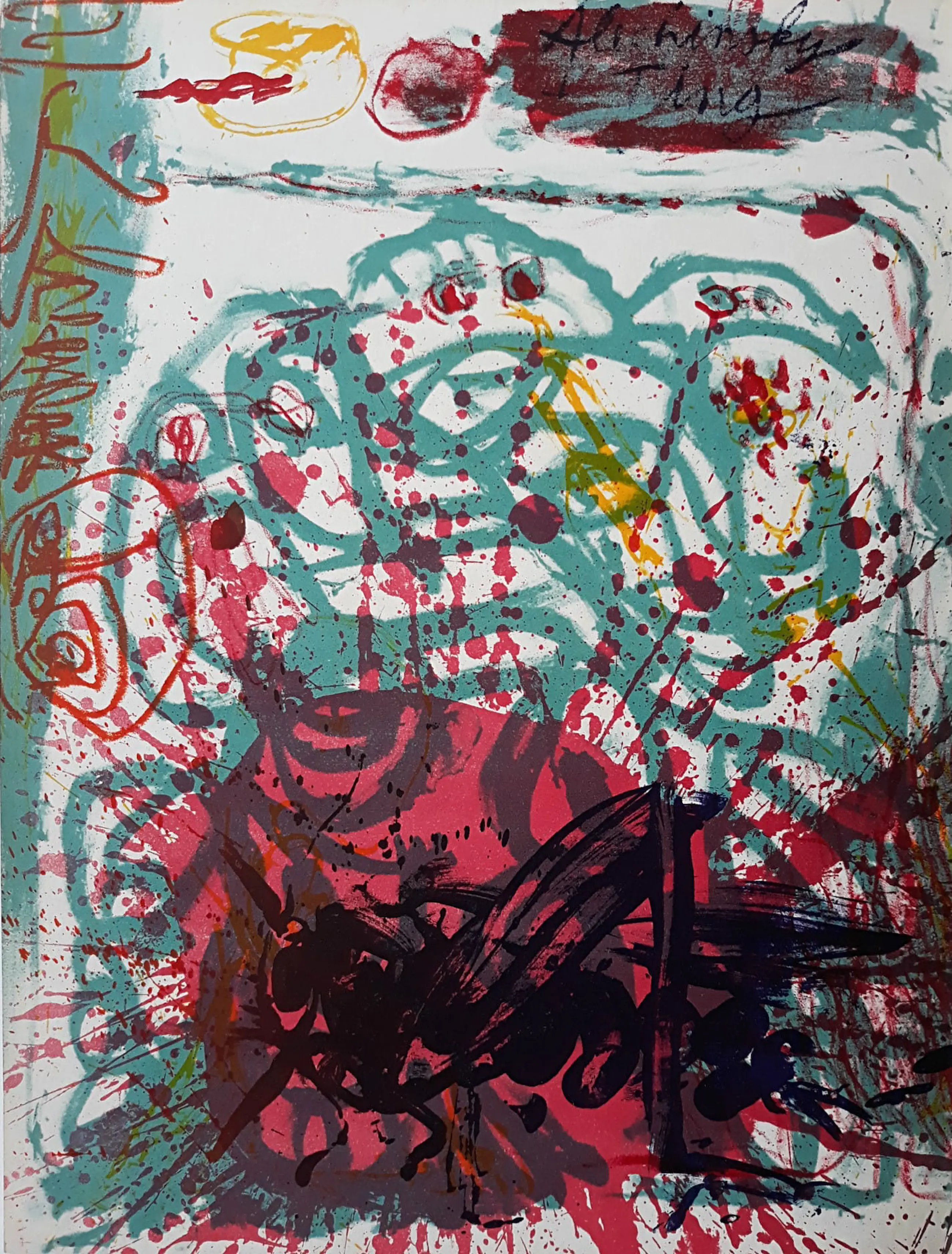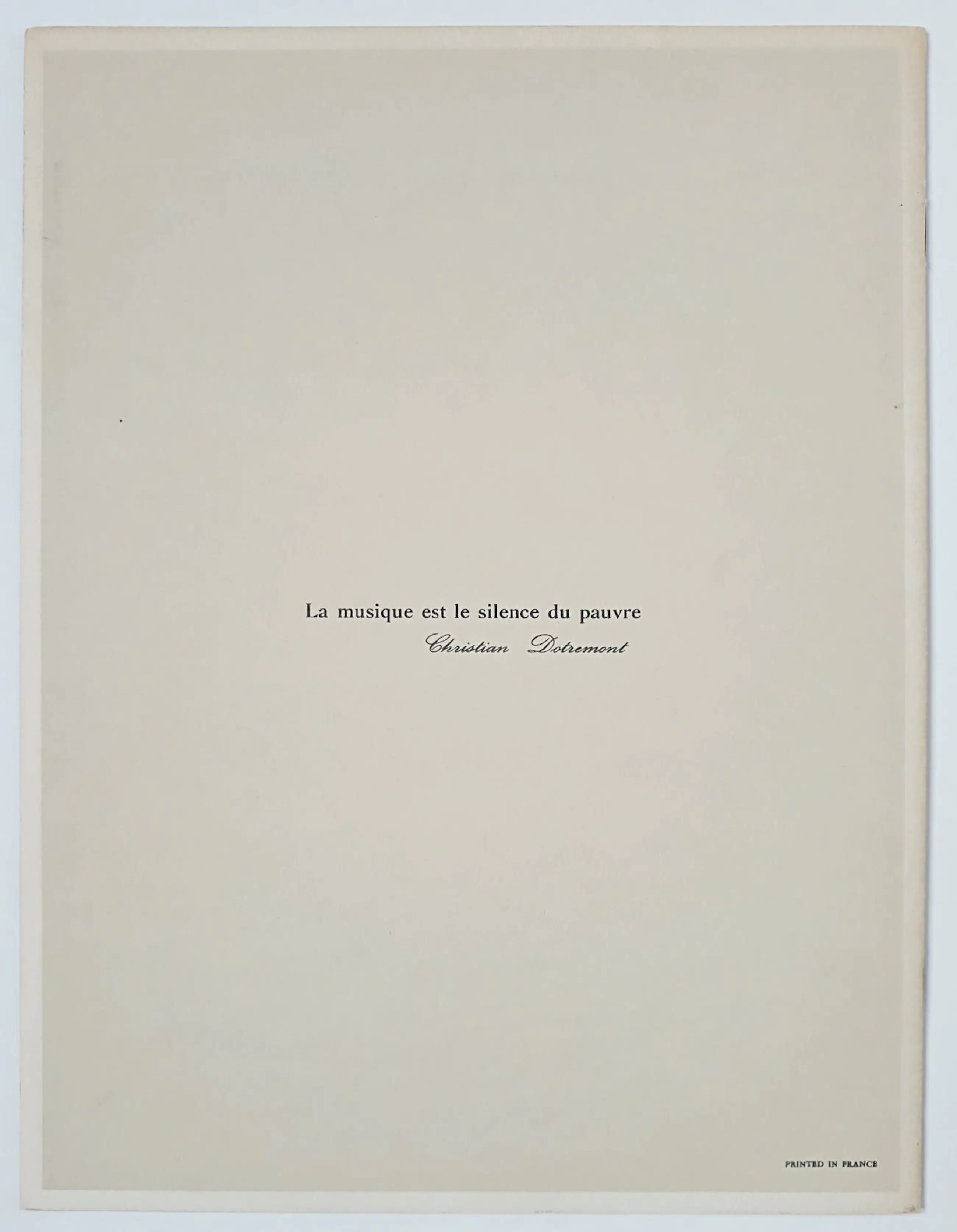 Mooie, historische publicatie ter gelegenheid van een gezamenlijke tentoonstelling van Alechinsky, Walasse Ting en Reinhoud in Galerie de France (1963). Volledige titel: “Solo de Sculpture et Divertissement / arrangé pour peinture de quatre mains”. Het ontwerp van de omslag is met een knipoog geleend van “Breitkopf & Hartel Orchesterbibliothek” (zie laatste foto, item wordt niet meegeleverd). De binnenkant van de omslag is een gezamenlijke dubbelpagina litho van Alechinsky en Ting genaamd Aleching (Literatuur: Rivière 215). Op de achterkant staat een aforisme van Christian Dotremont: “La musique est le silence du pauvre”.