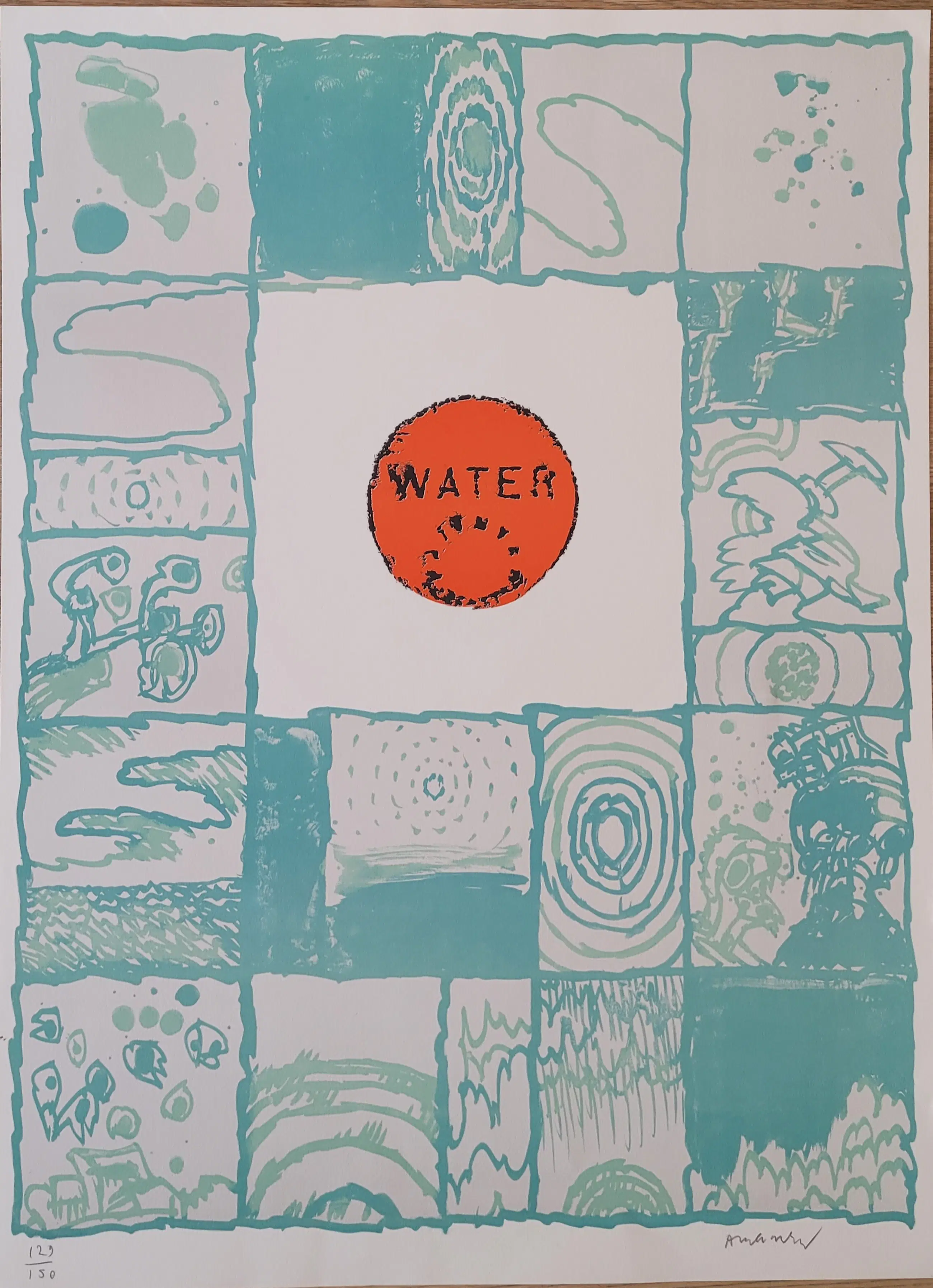 WATER NYC is an original hand drawn lithograph created by Pierre Alechinsky in 1985, printed using hand lithography techniques on Arches paper, 100% acid free. WATER is an abstract brush painting composition exemplifying Alechinsky's expertise as a fine printmaker with his use of expressive loose brushwork and fluid abstract litho washes surrounding an imprint which reads "WATER" taken from an actual wax crayon rubbing of a NYC public water utility manhole cover which then was transferred to a lithographic printing plate. Light aqua colored water-like puddles surround the dark orange central element of this bold graphic image, evoking a very relevant reminder of WATER's importance in all our lives.