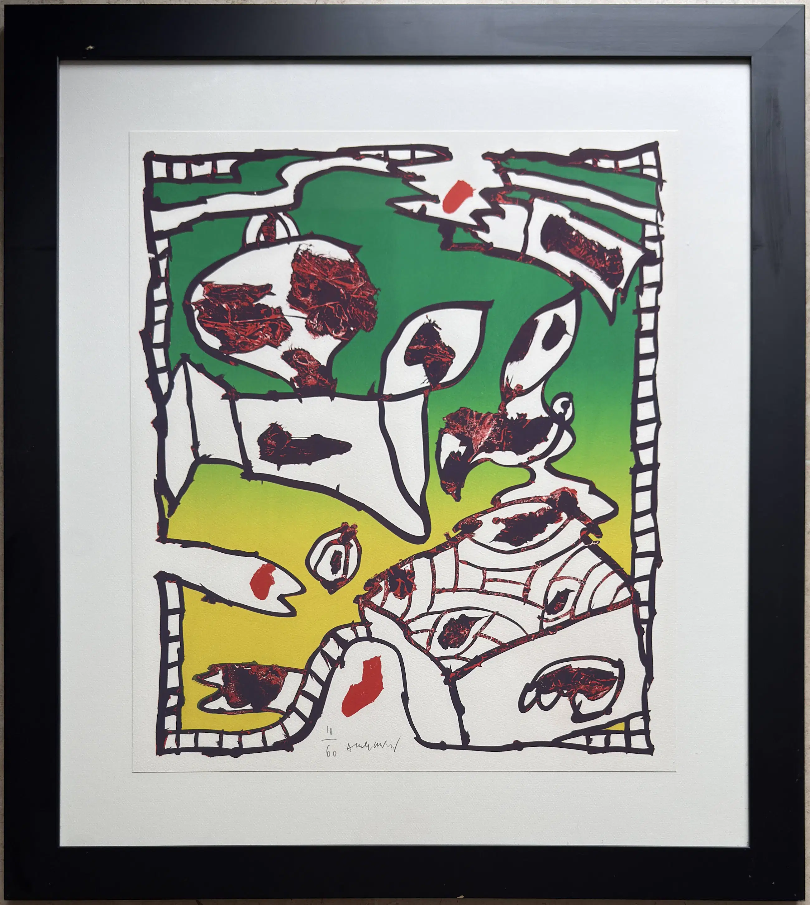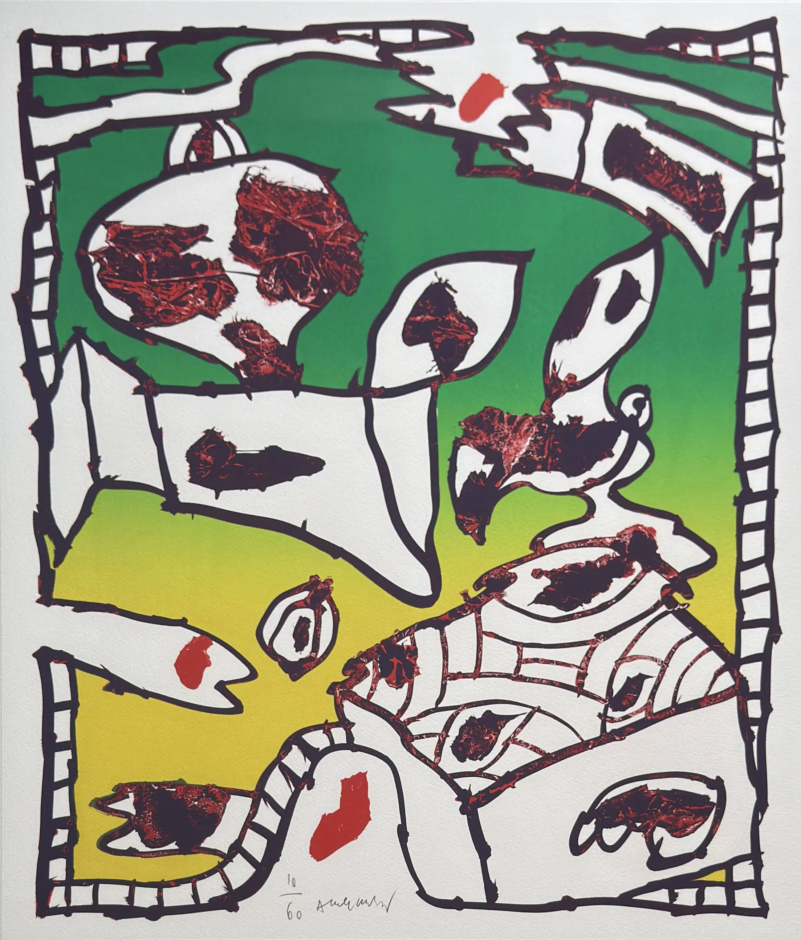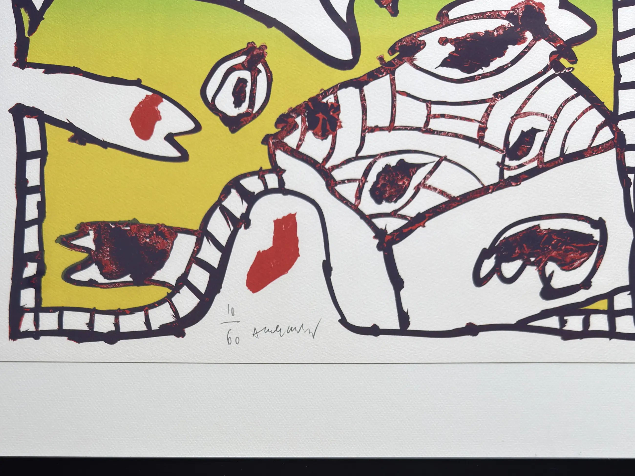 Litho van Pierre Alechinsky met de titel: 'Pour saluer Karel Geirlandt' uit 1999. Het werk is onder met de hand gesigneerd door de kunstenaar.