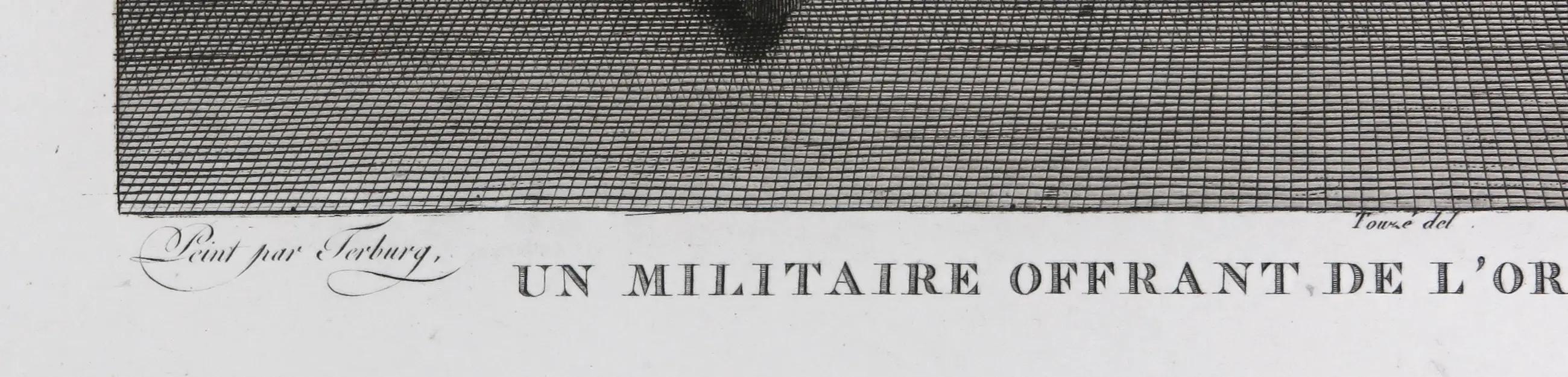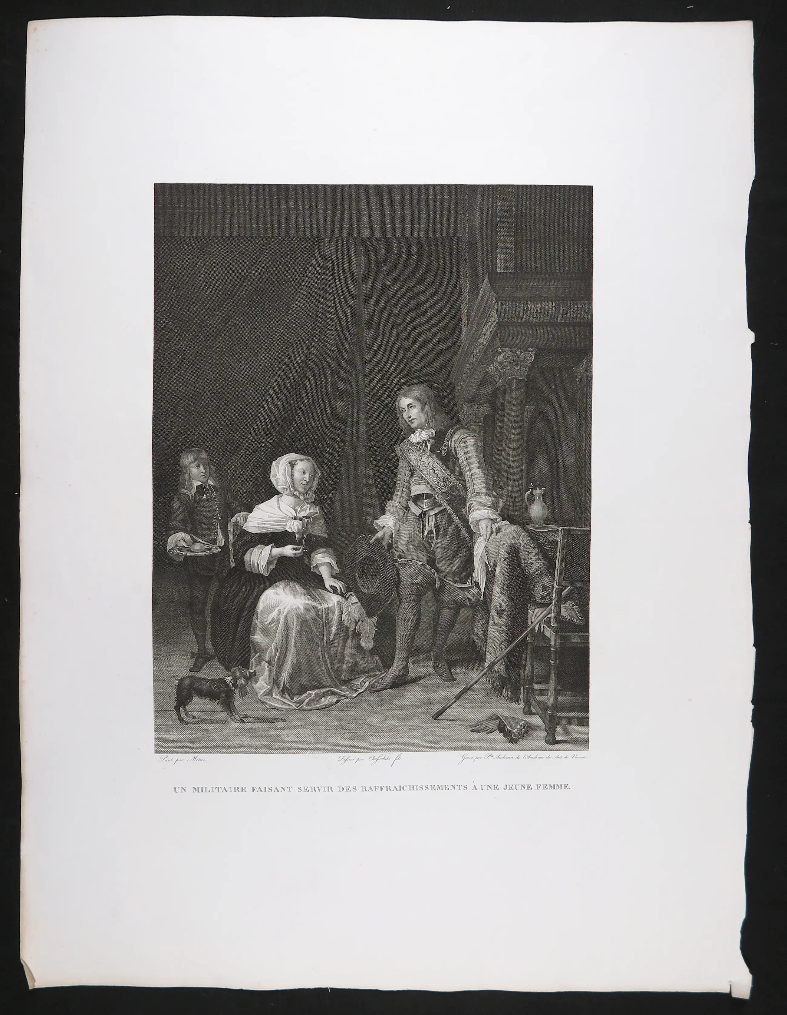 Lot van twee kopergravures, gegraveerd door Pierre Audouin, naar schilderijen van Gabriël Metsu (Een soldaat die een jonge dame bezoekt) en Gerard ter Borch/Terburg (De galante soldaat).
