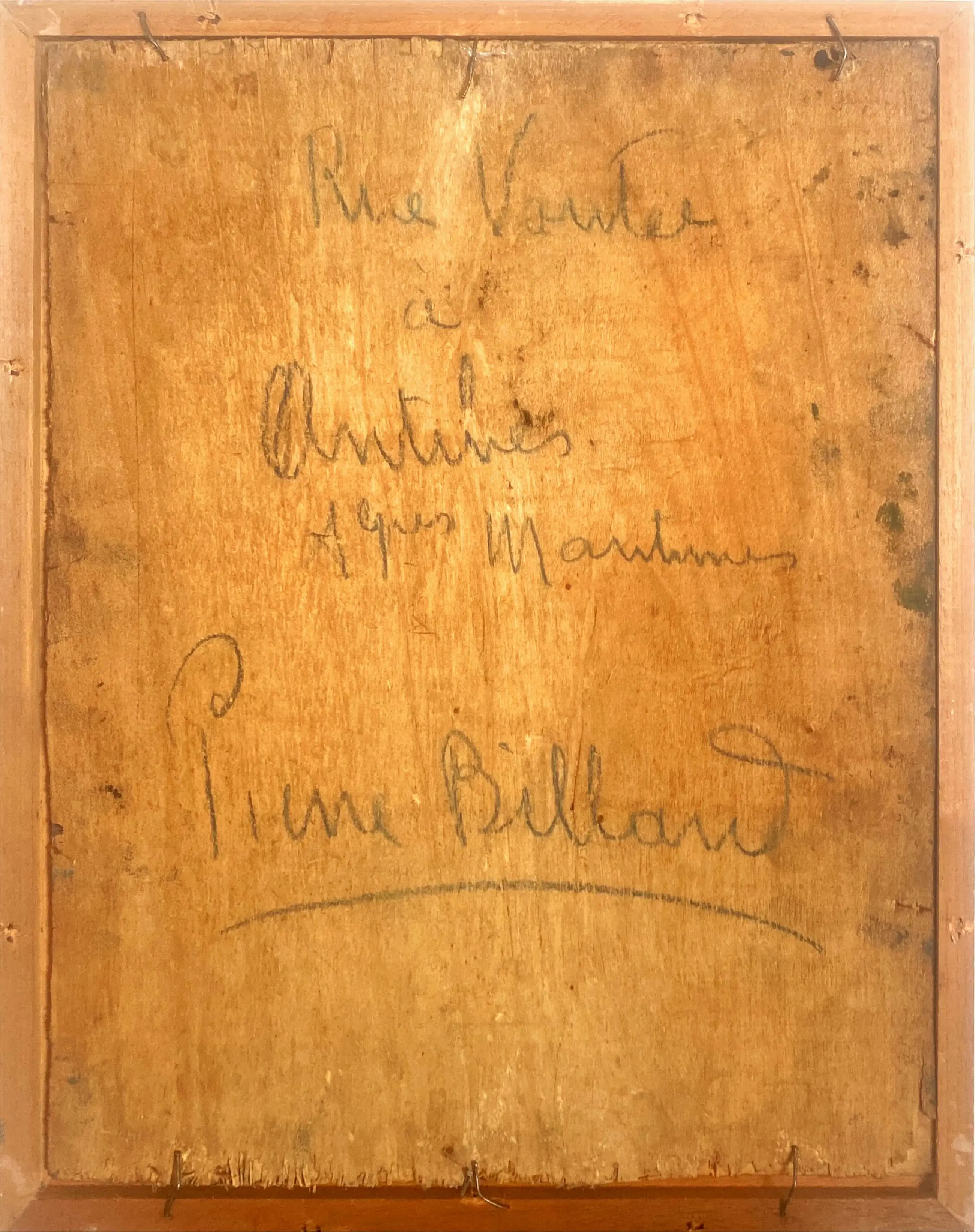 Stadsgezicht van Rue Ventue in Antibes, uitgevoerd in olieverf op houten paneeltje. Gesigneerd door de kunstenaar, op de achterzijde aanduiding van straat en plaatsnaam.