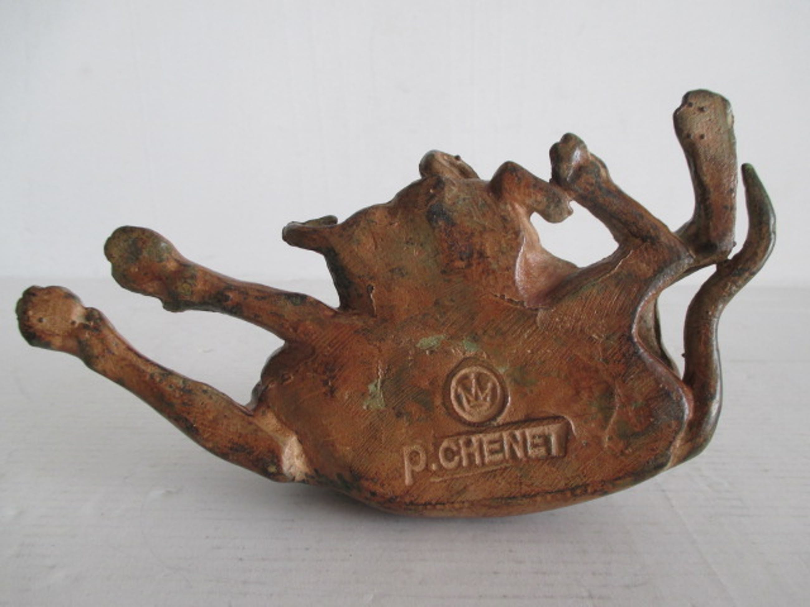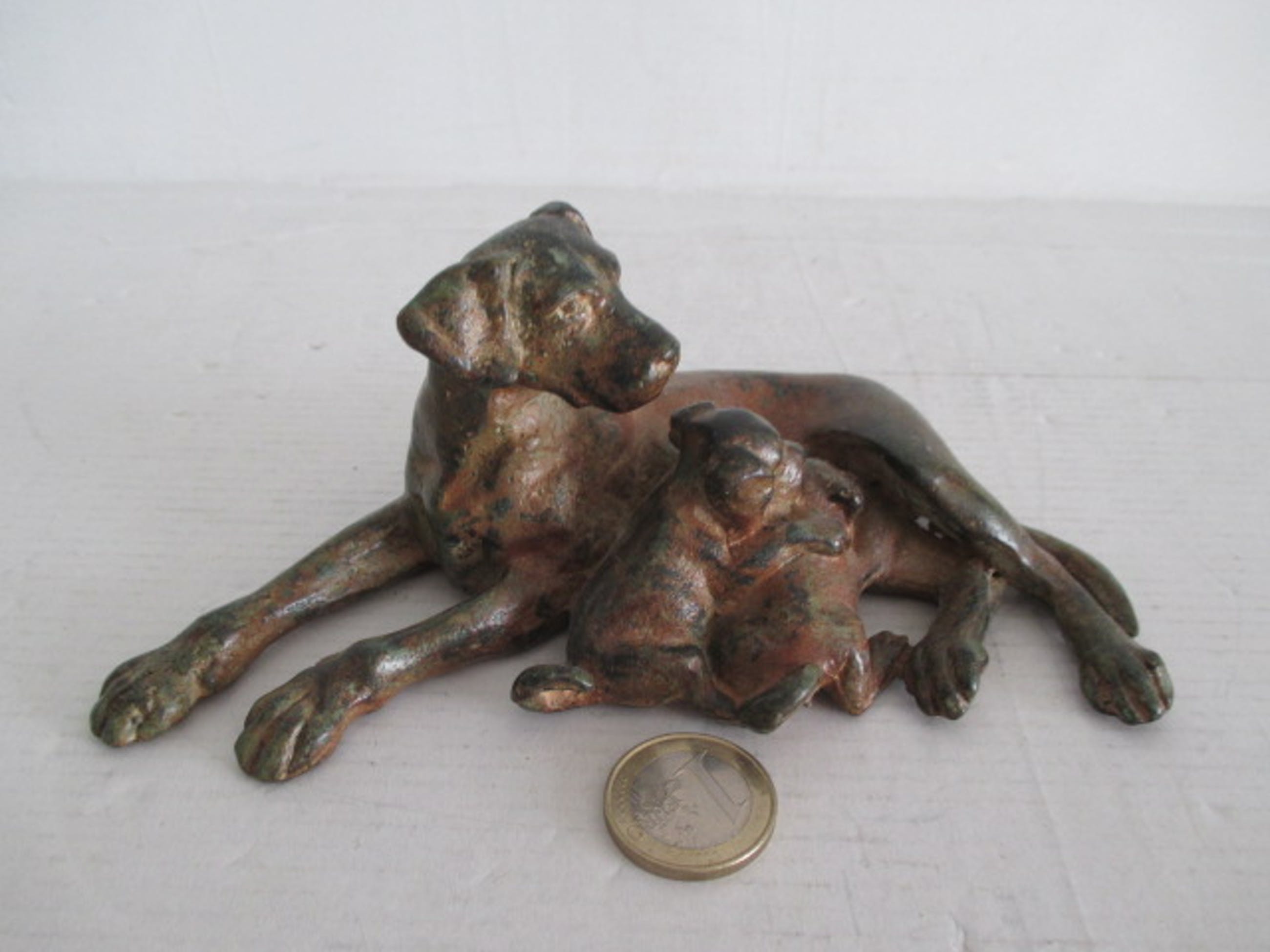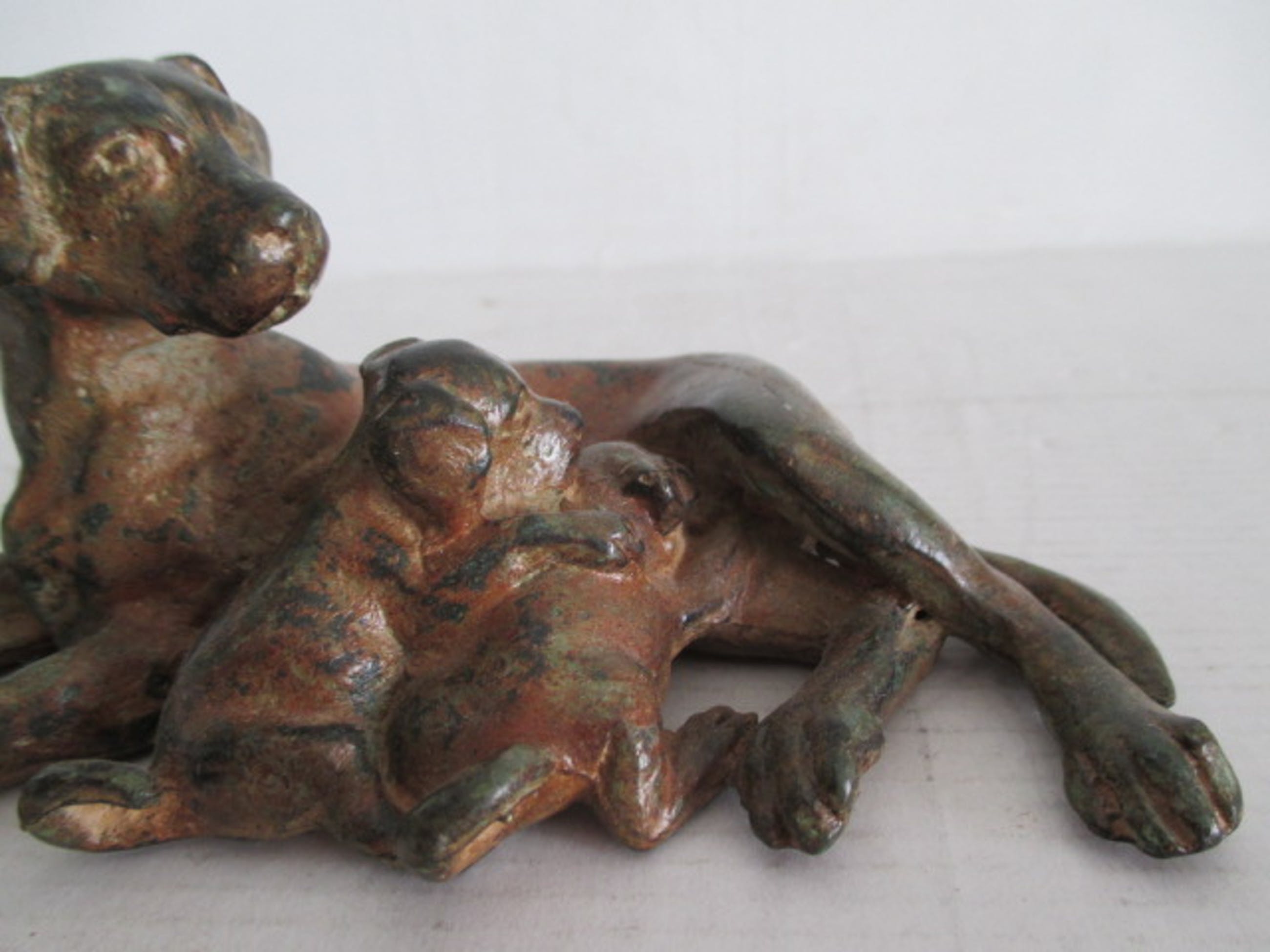 Mooi beeldje uit brons dat fijn gedetailleerd is.Afbeelding van een moeder met twee pas geboren puppies die ze voedt met melk.Gestempeld P.Chenet.