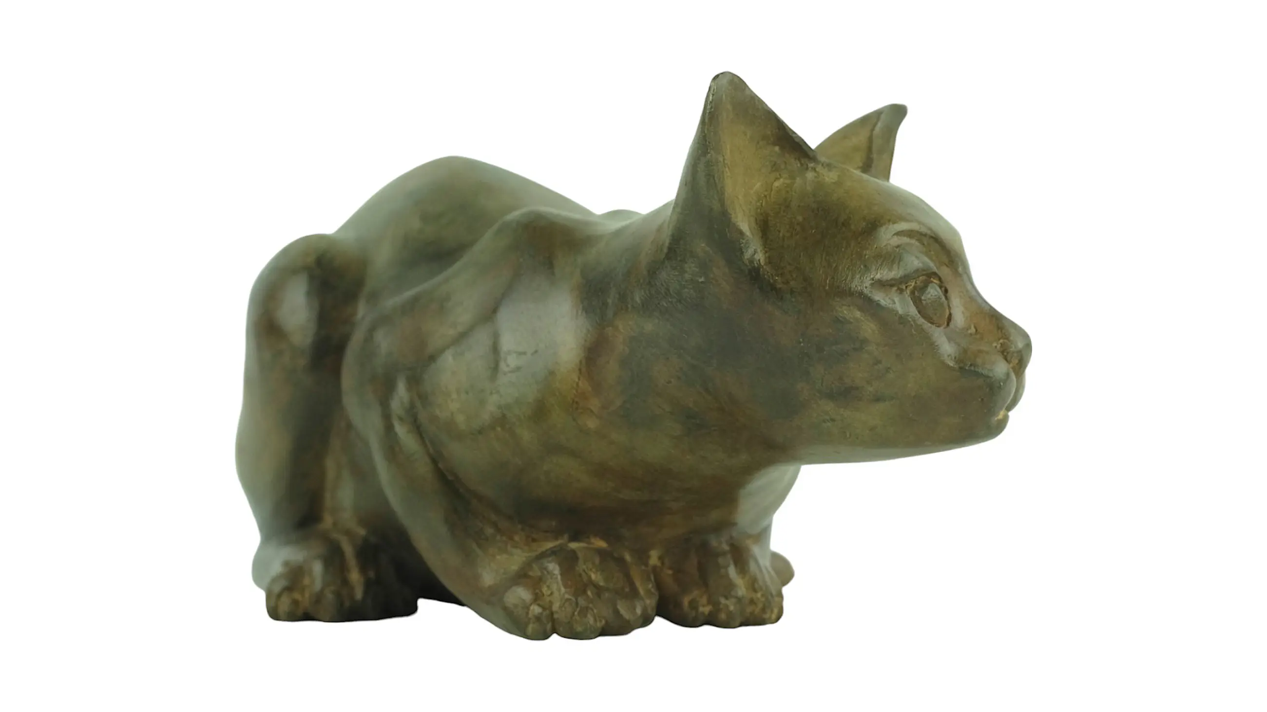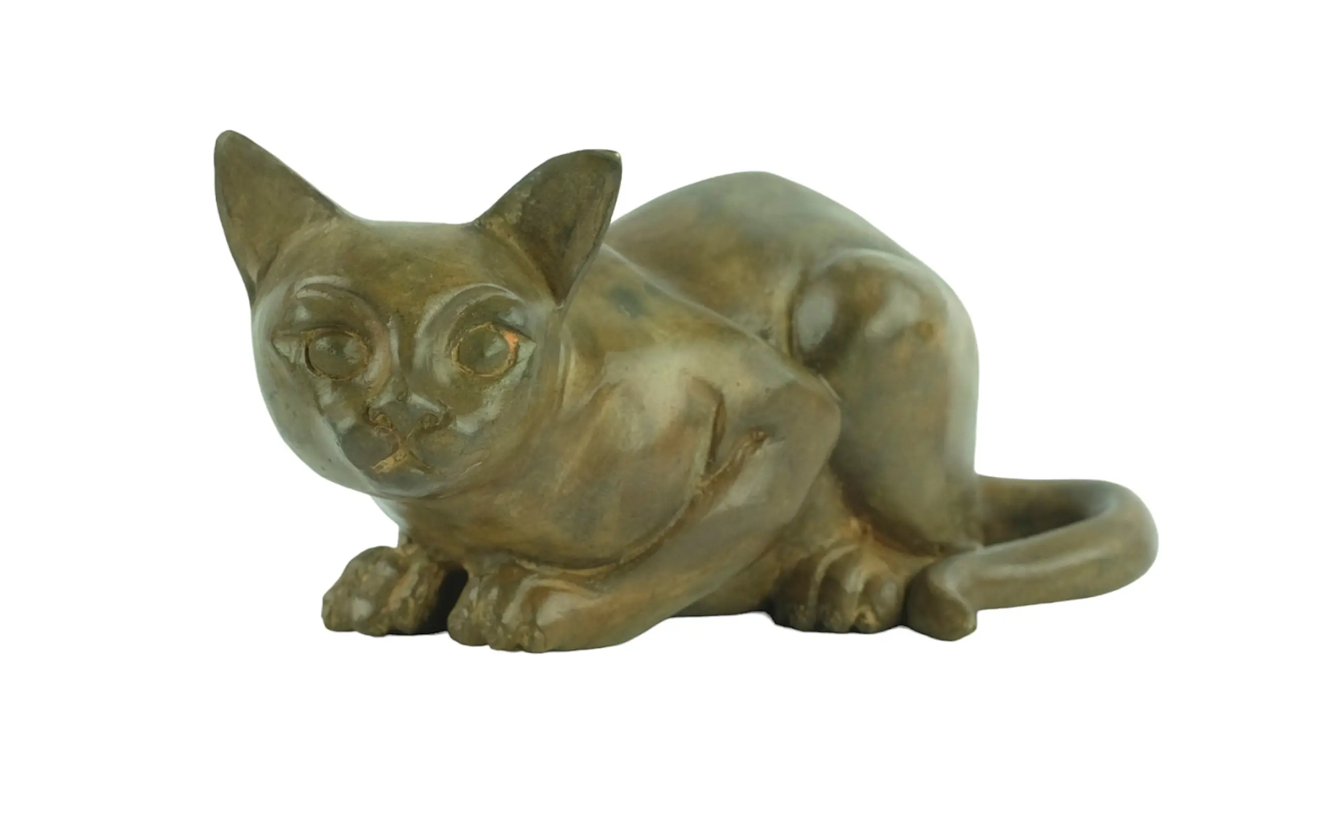 Een fraai bronzen sculptuur van een zittende kat, nieuwsgierig en volledig gefocust.