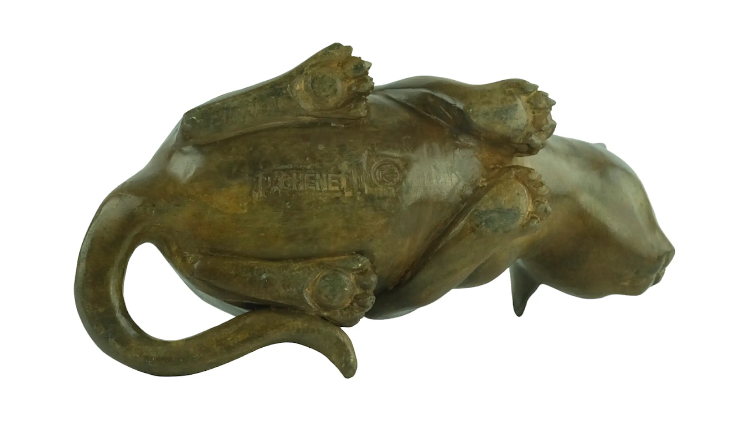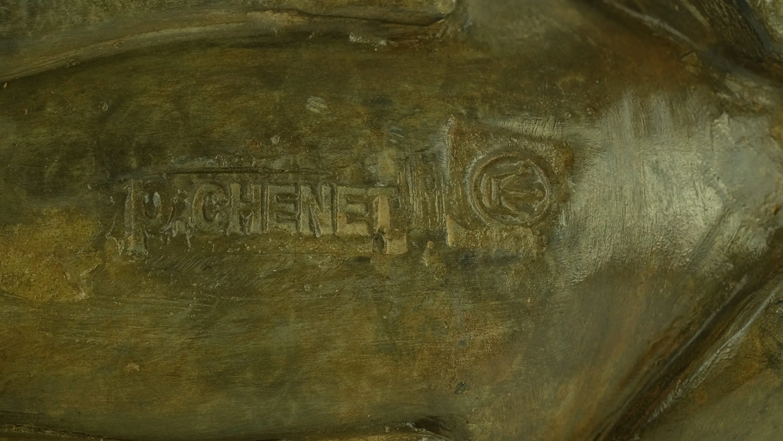 De kat heeft een authentieke patina, is aan de onderzijde gesigneerd met 'P. Chenet' en is tevens voorzien van een stempel (kroon).