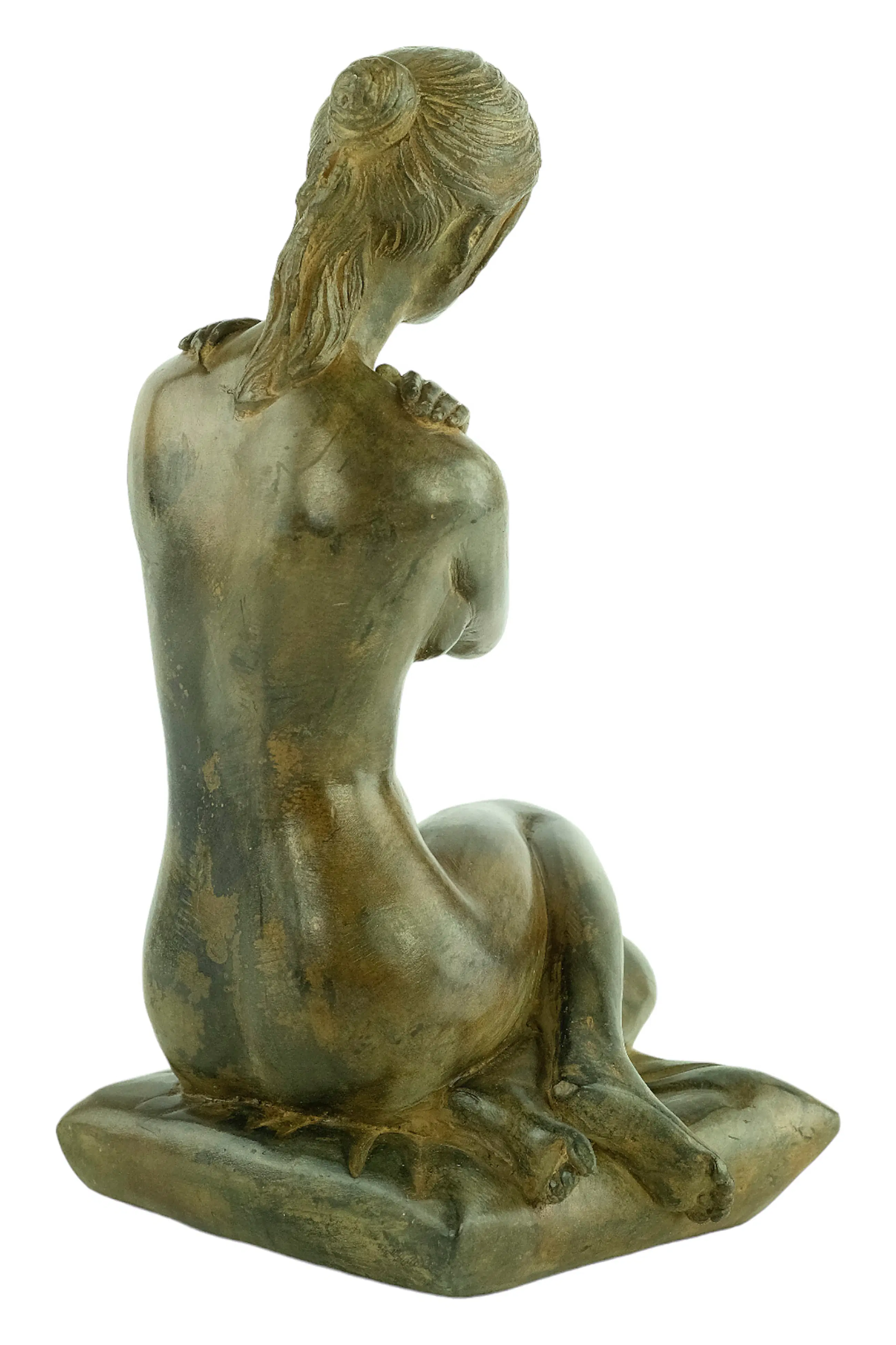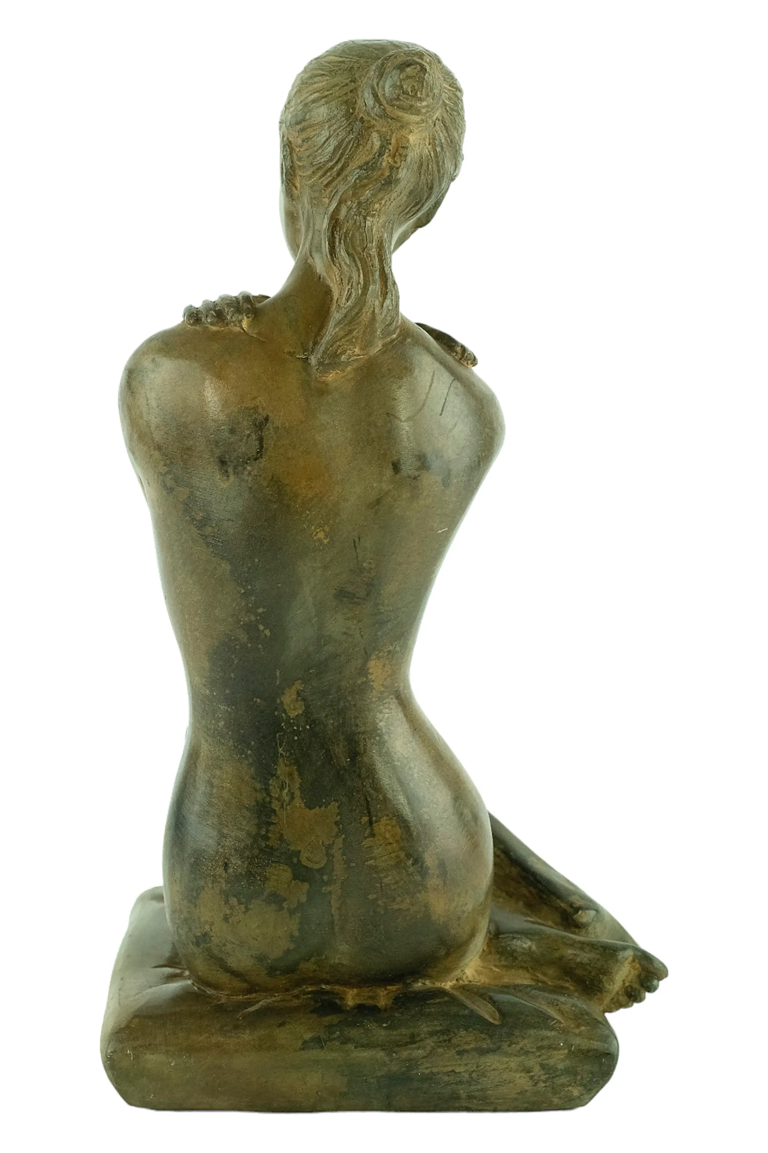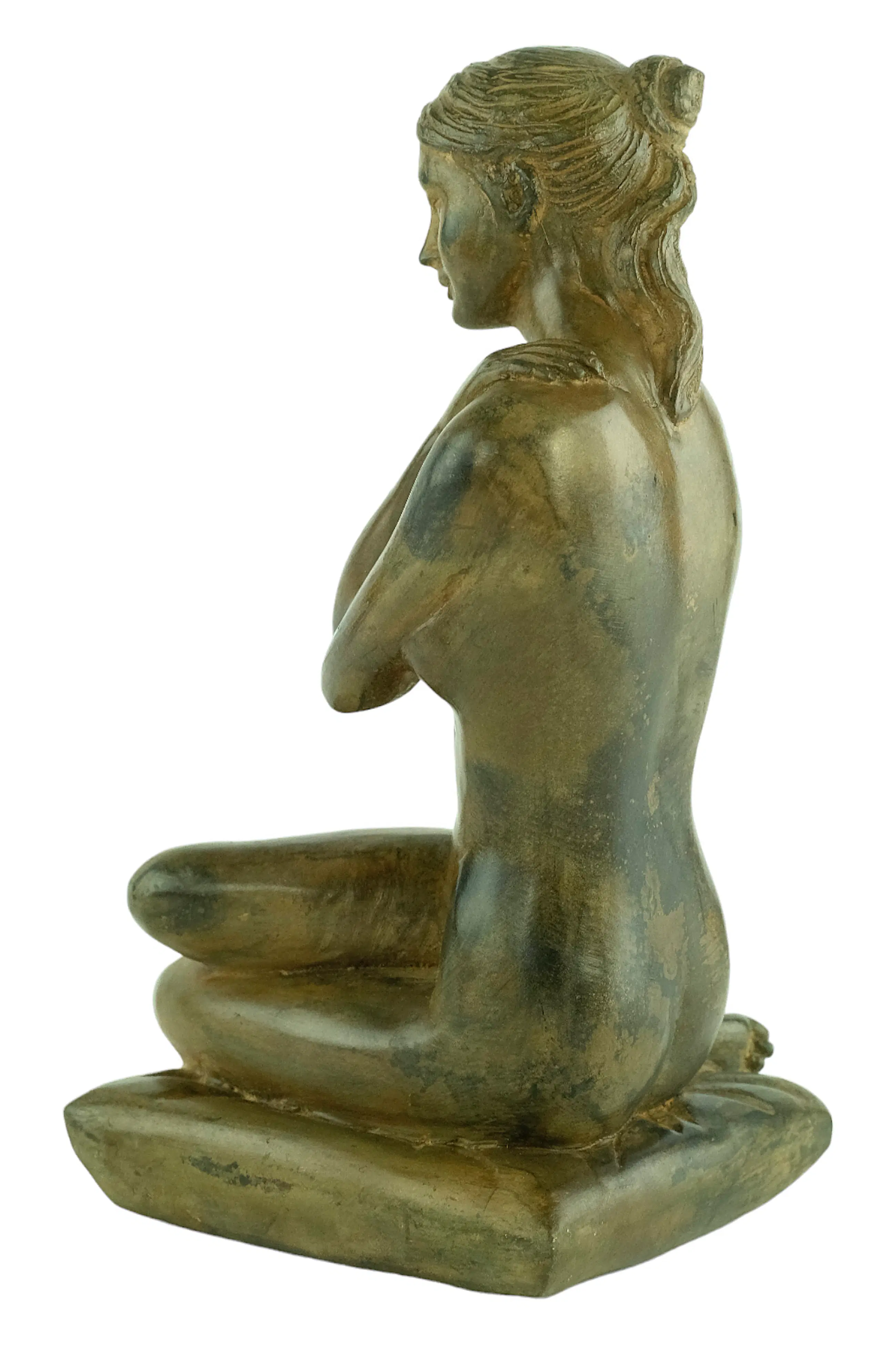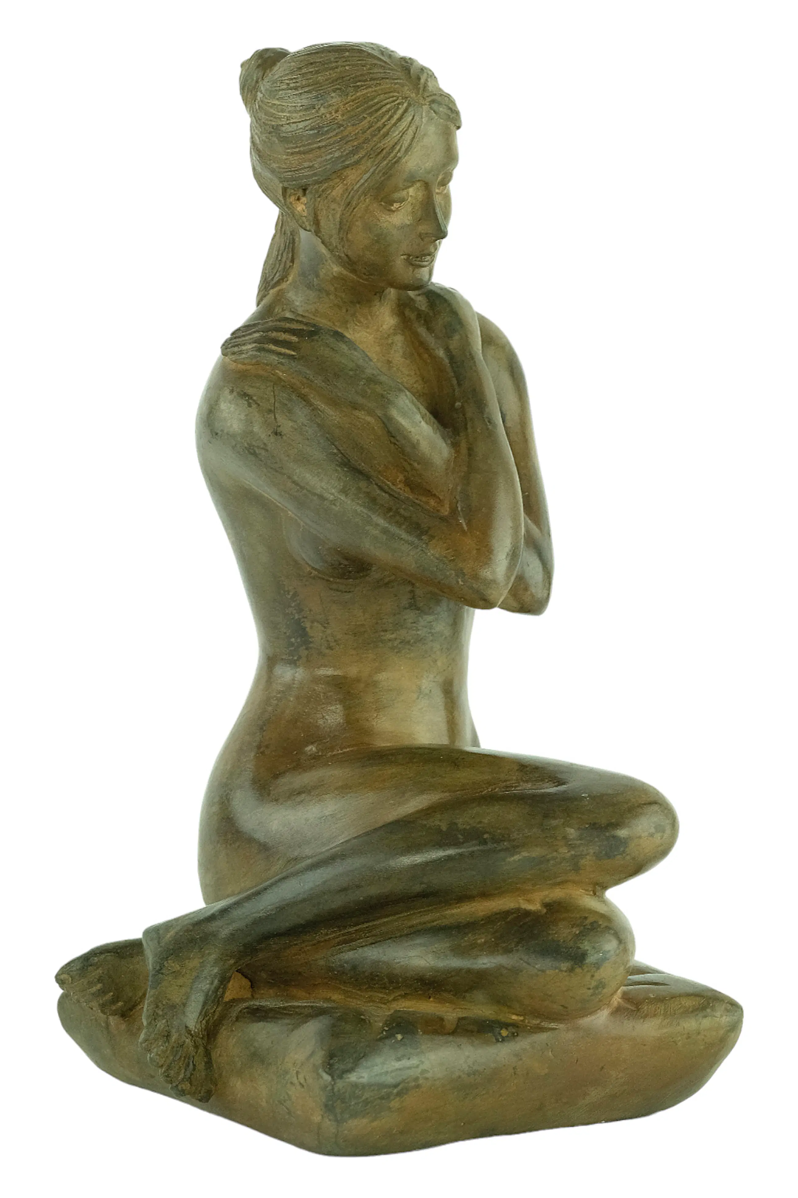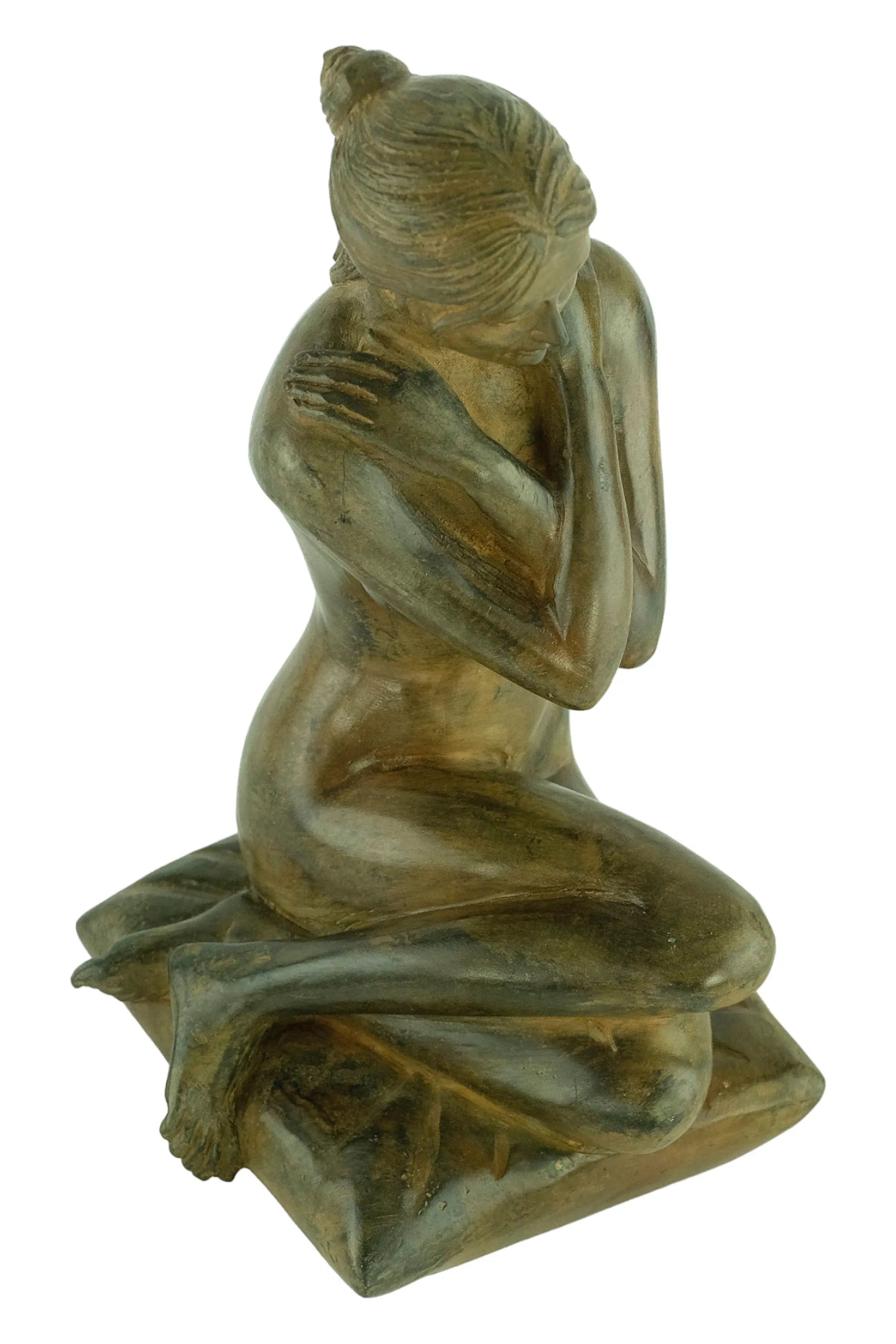 Een bijzonder fraai sculptuur voorstellende een vrouwelijk naakt zittend op een kussentje met haar armen gekruist.