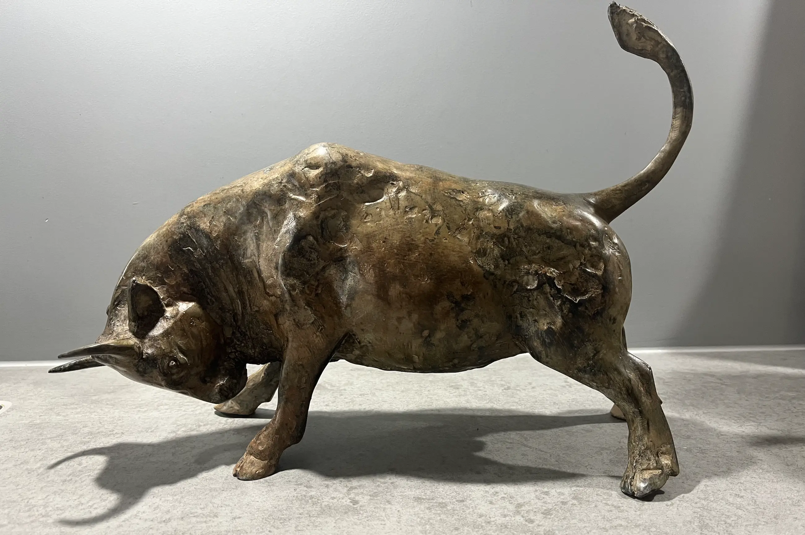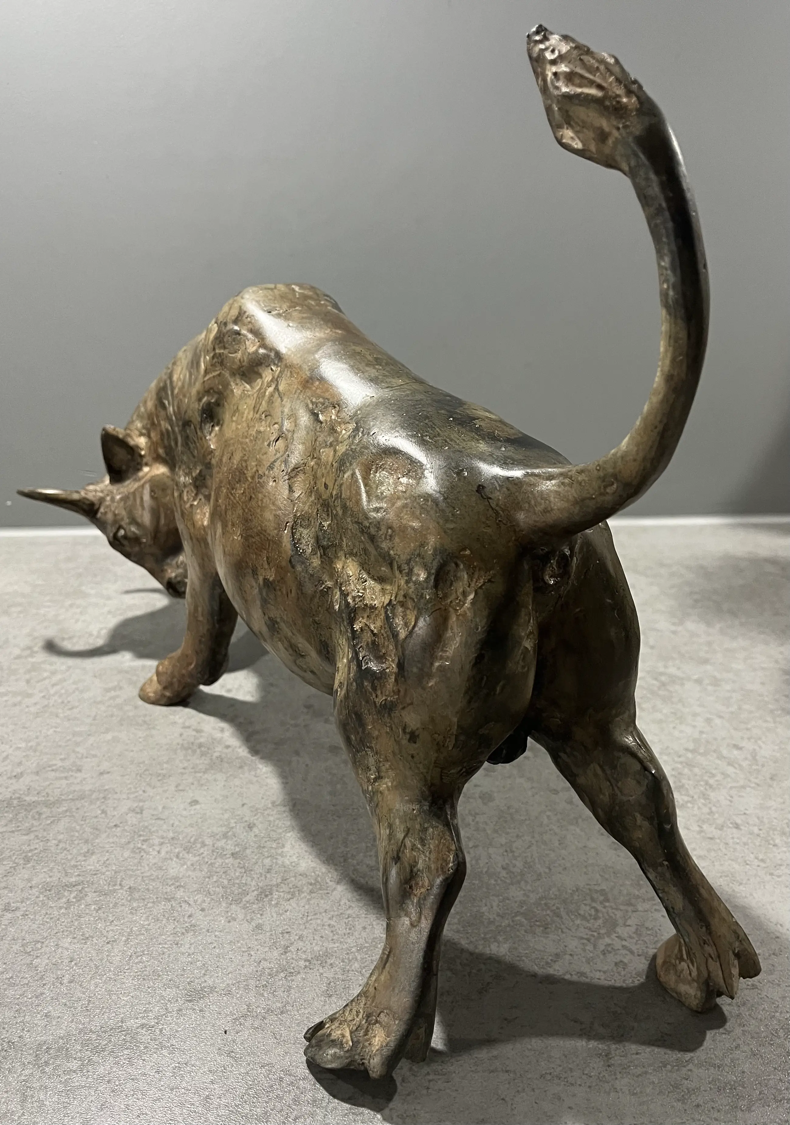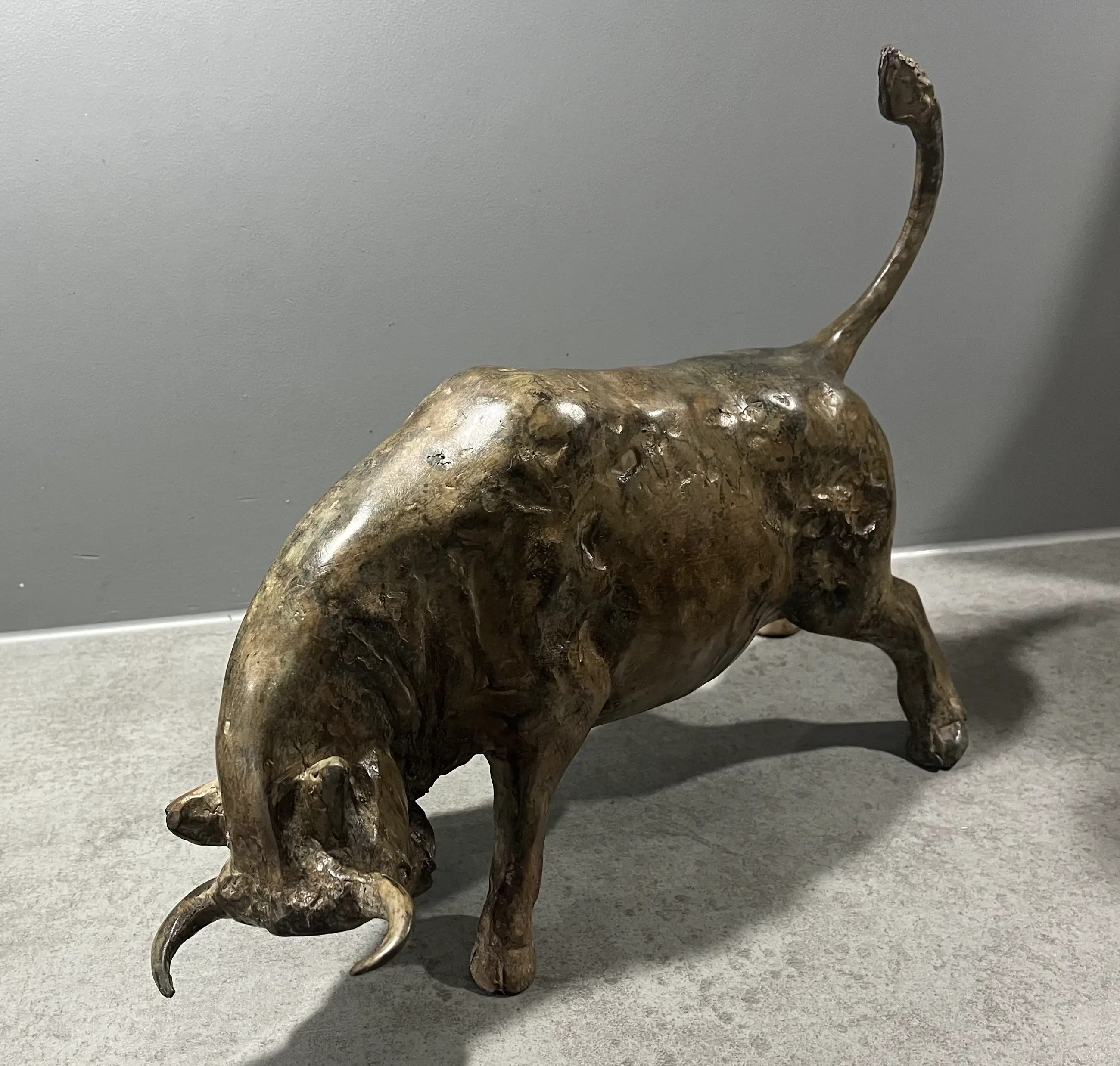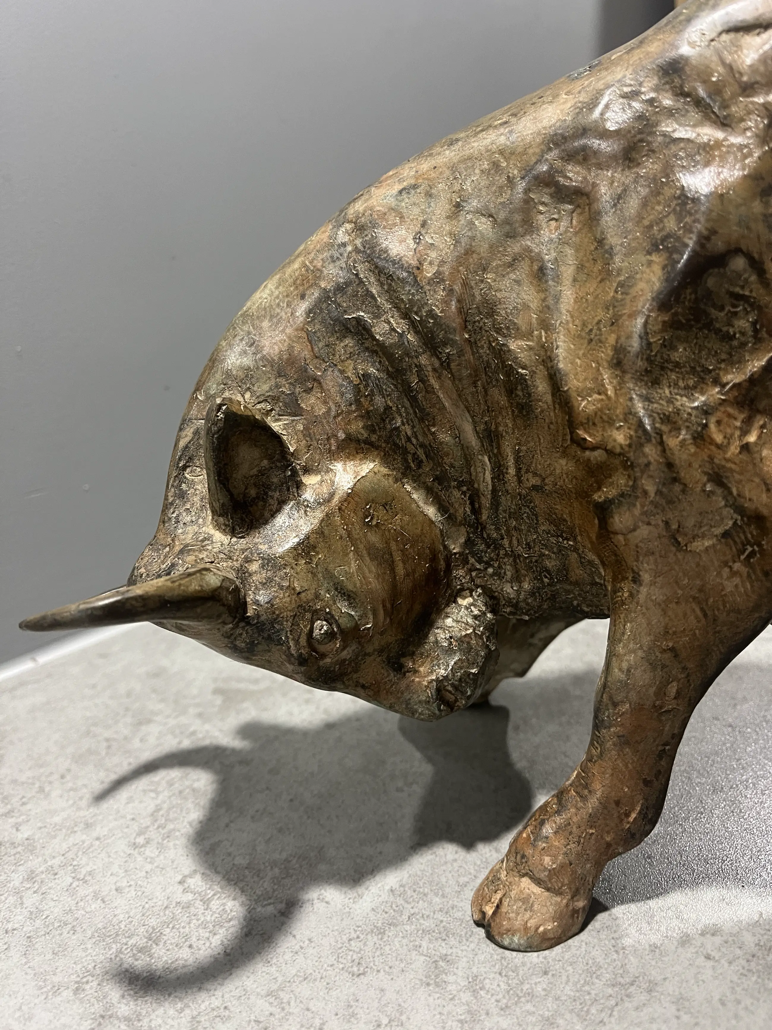 Fraaie bronzen sculptuur van een stier. De stier lijkt klaar te staan voor de aanval, poten stevig neergezet, kop naar beneden , hoorns gericht op de aanval.