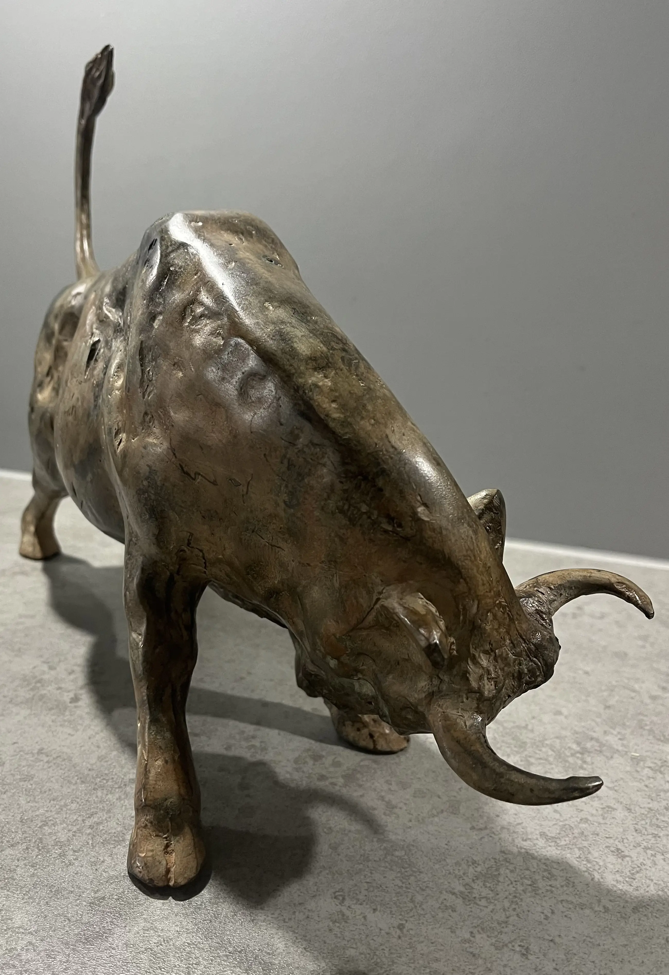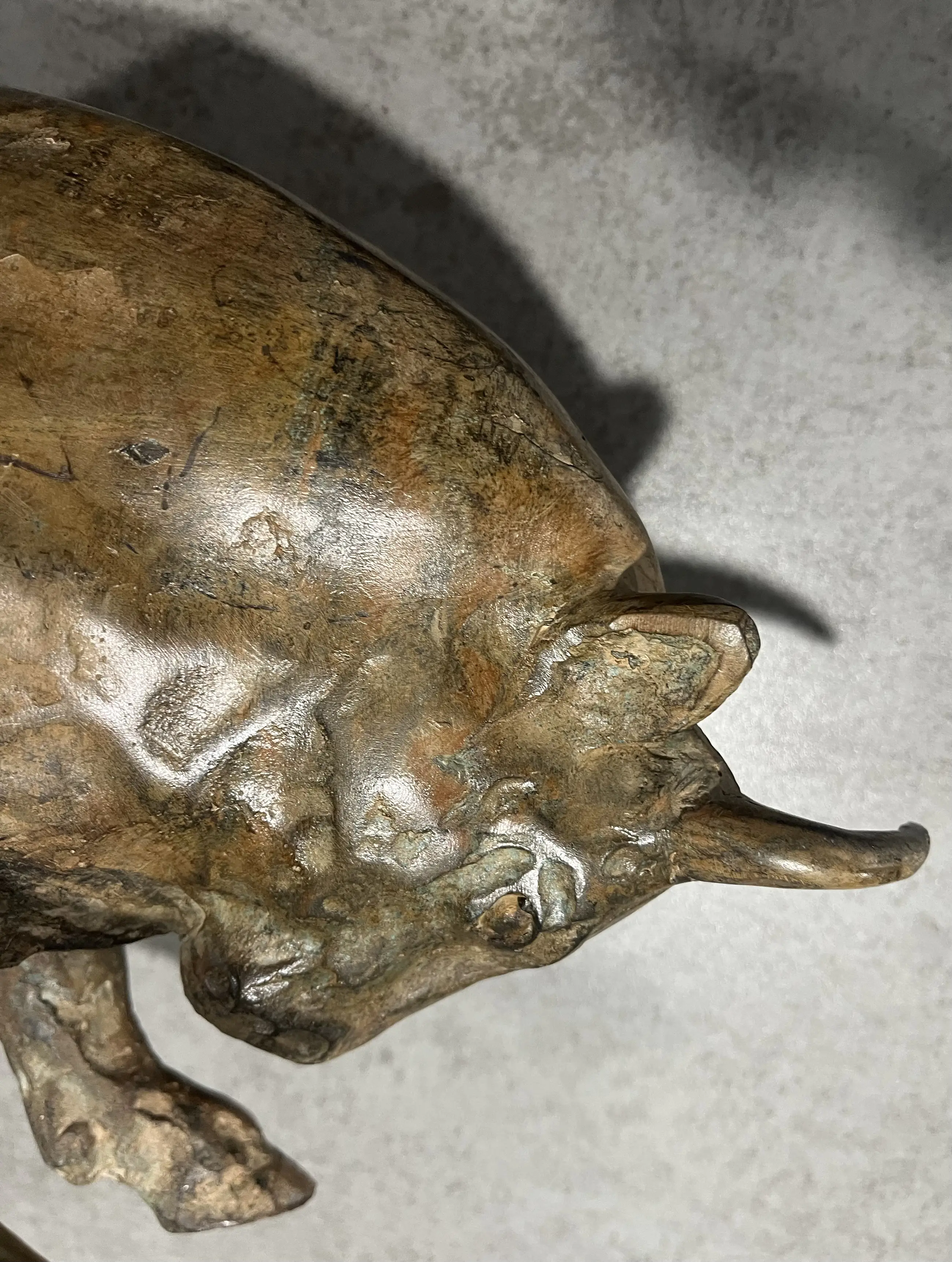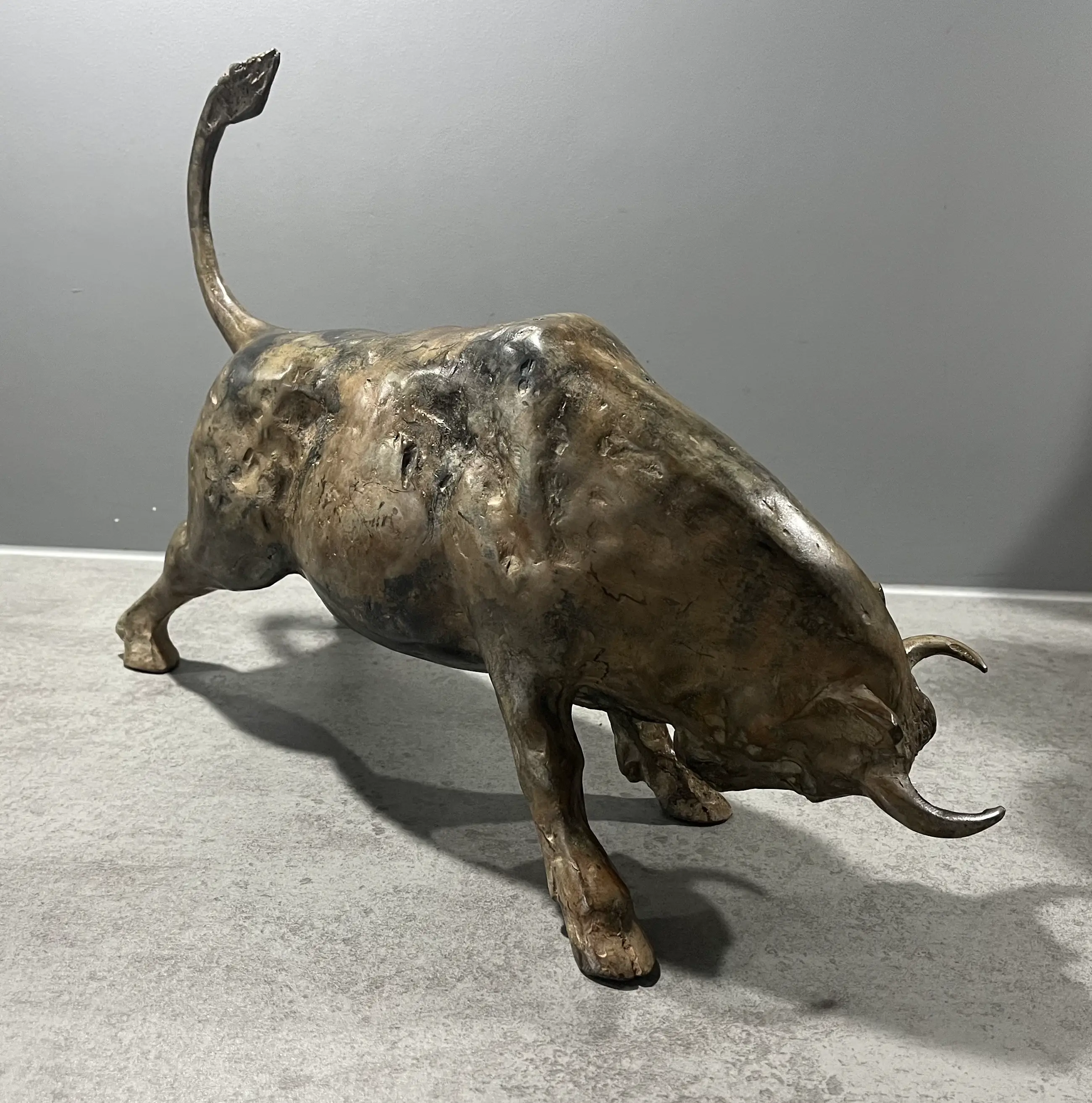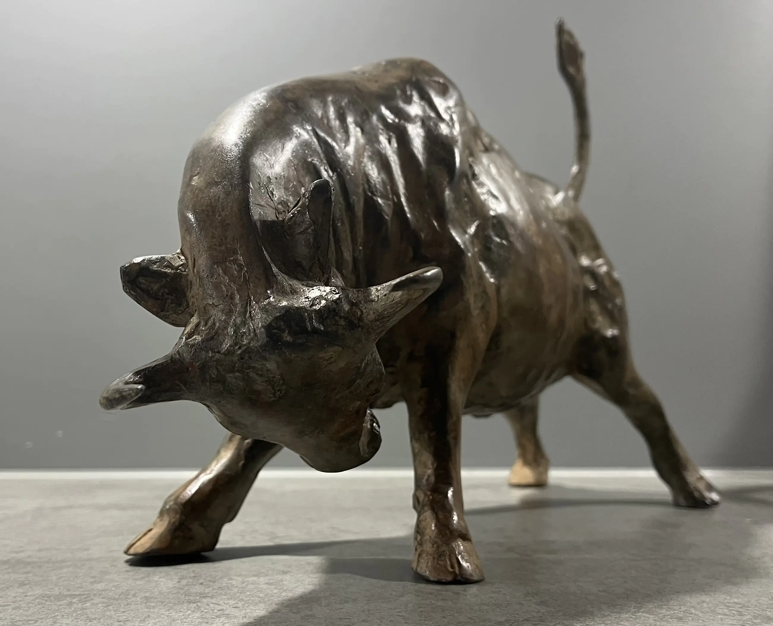 Fraaie bronzen sculptuur van een stier. De stier lijkt klaar te staan voor de aanval, poten stevig neergezet, kop naar beneden , hoorns gericht op de aanval.