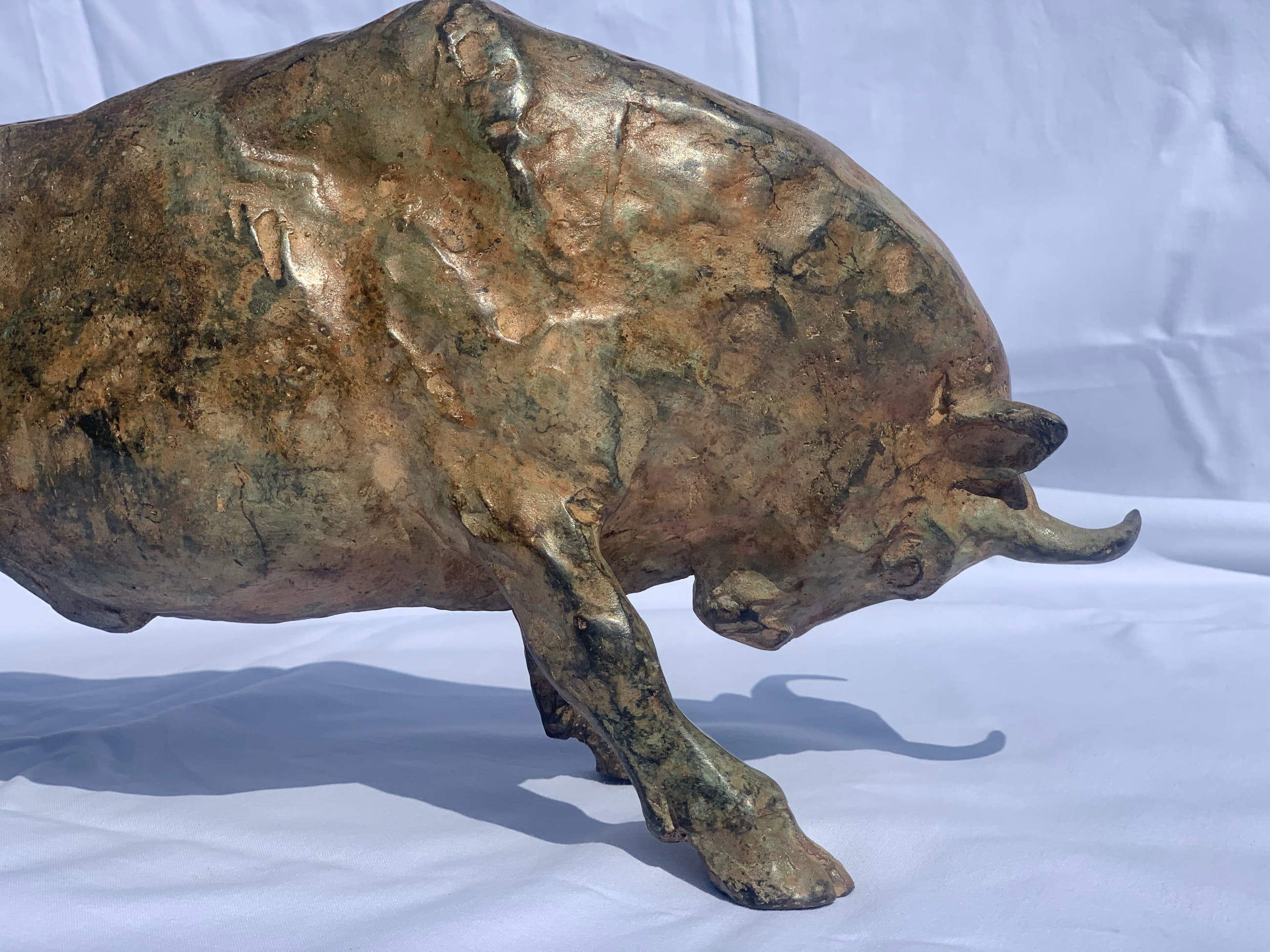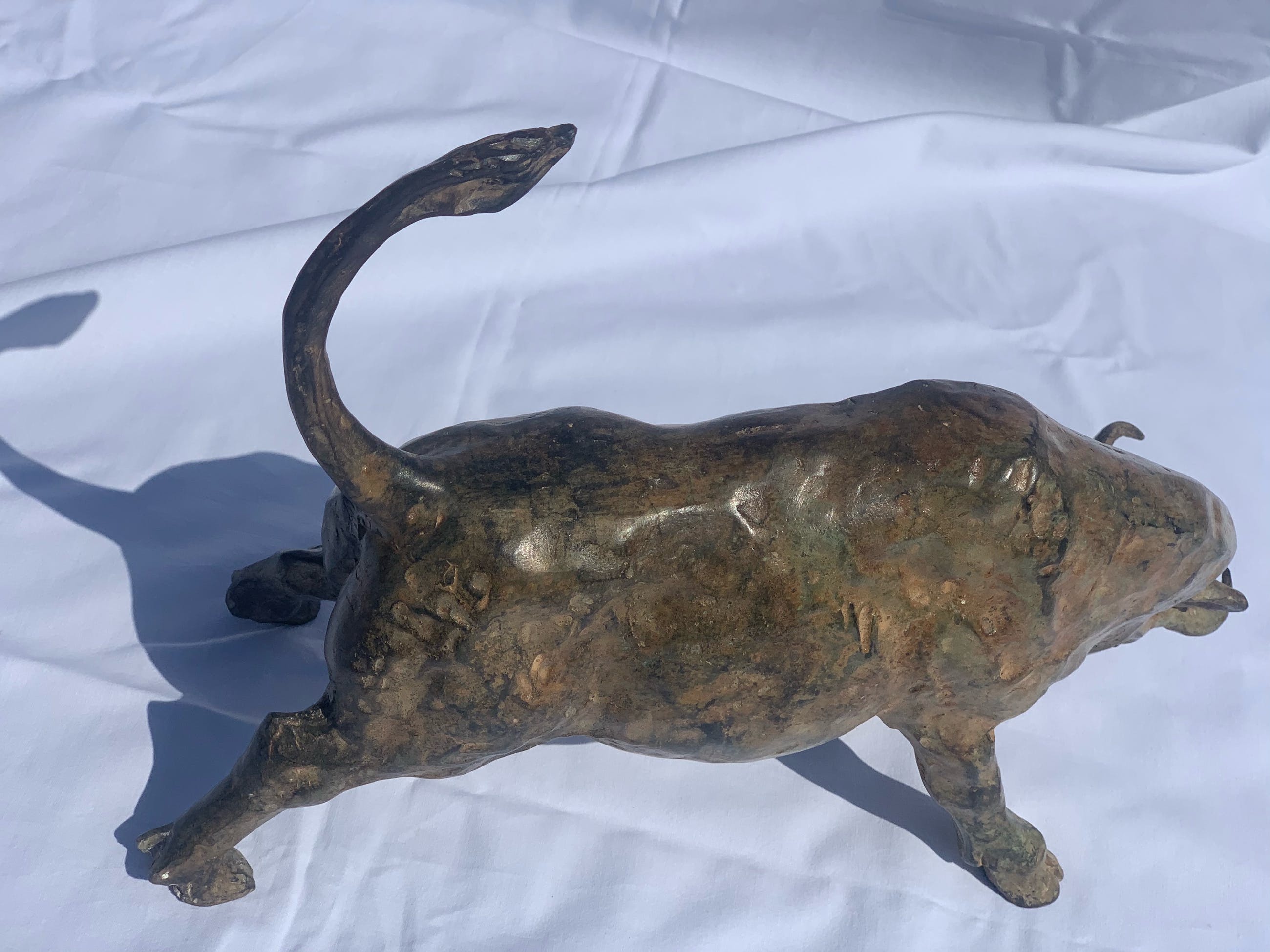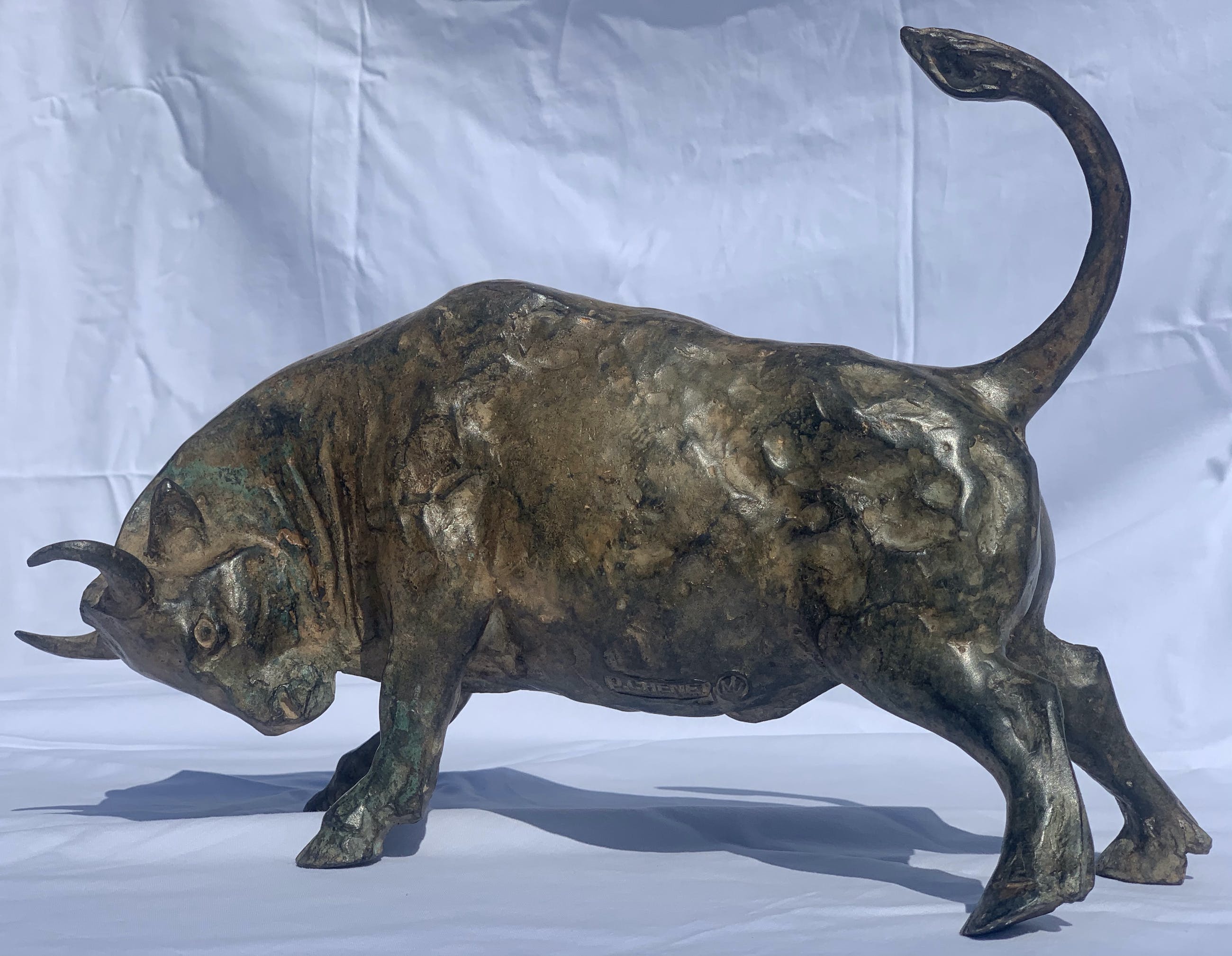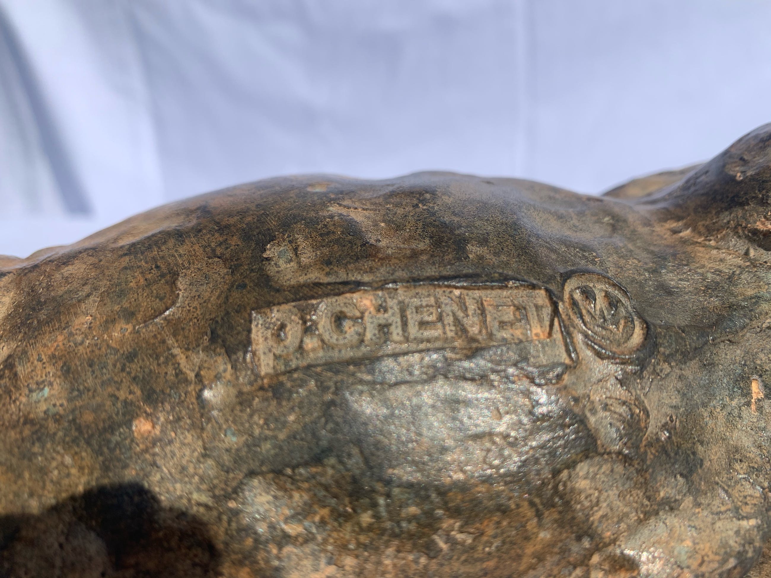 Massief zuur gepatineerd bronzen stier - P. Chenet. Zeer mooi en decoratief beeld. Acid patina - Unieke kleur Naargelang de lichtinval en het soort licht zal de schakering van het brons telkens anders zijn. Past zowel in een rustiek als modern interieur. Dit exemplaar heeft een zeer mooie speciale kleur/patine. Het brons is gesigneerd P CHENET met bronsstempel (kroontje van gieterij) Bekijk de foto’s, ze maken deel uit van de beschrijving.