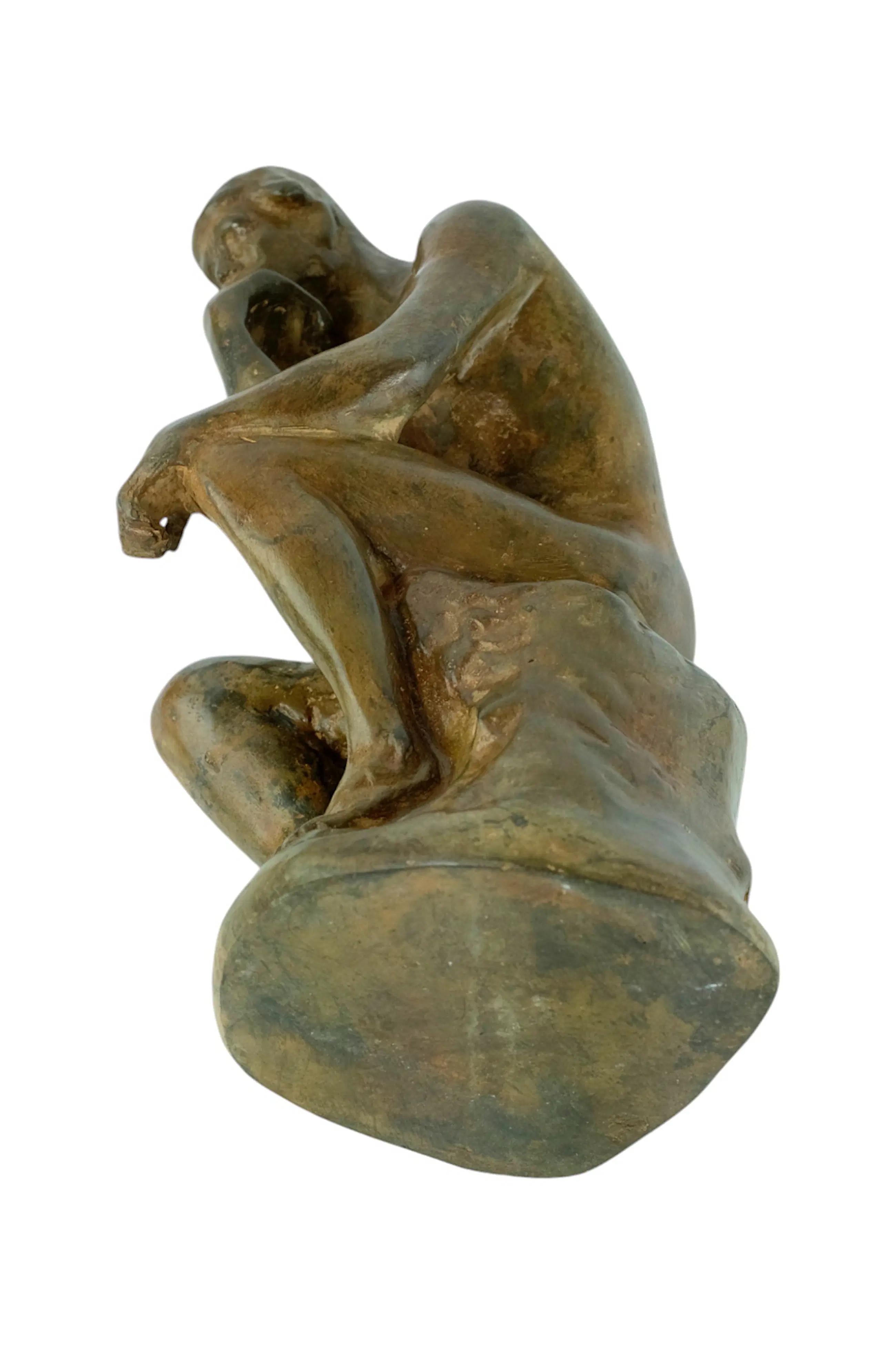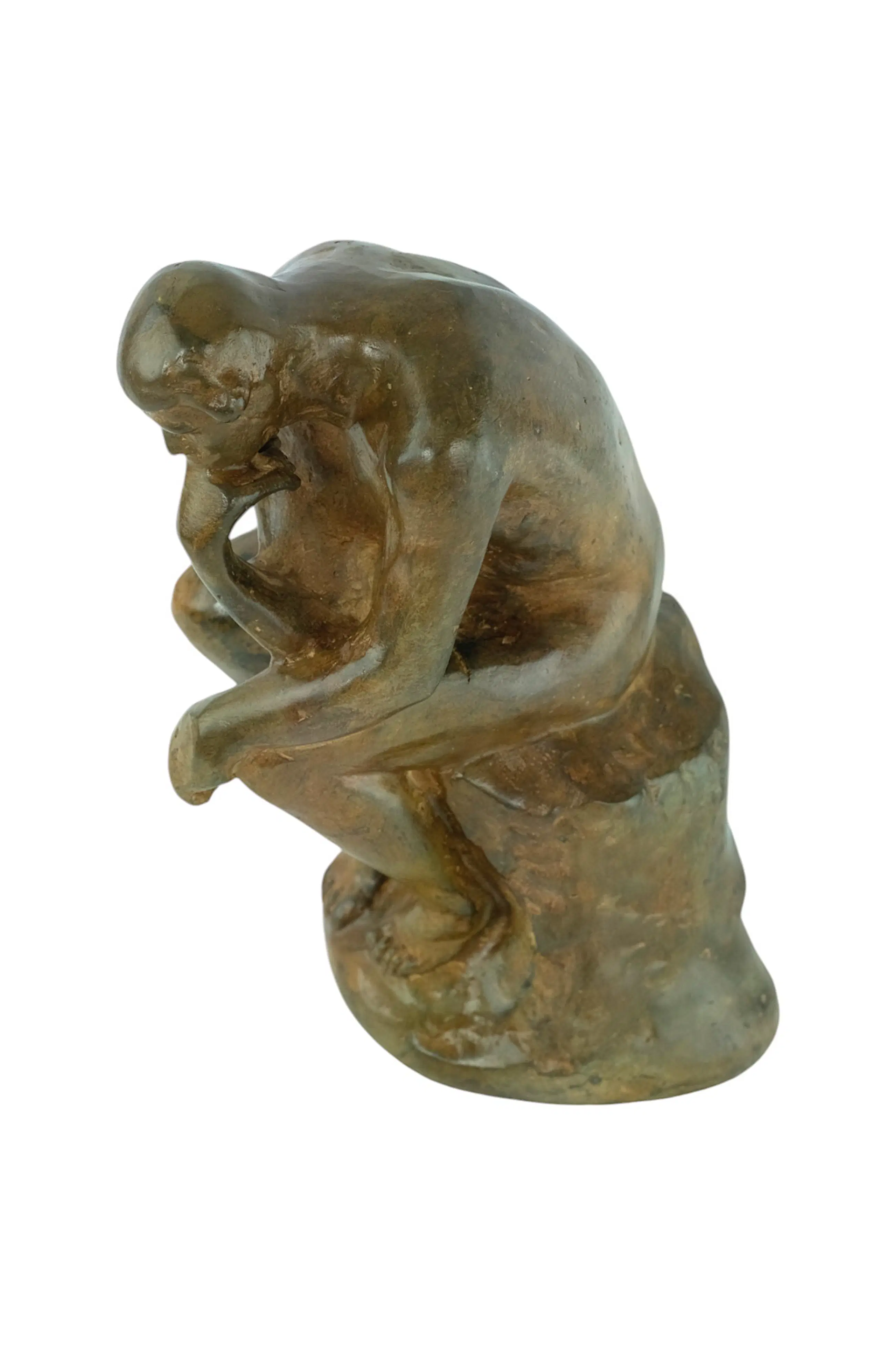Een prachtig bronzen sculptuur van 'De Denker', een peinzende man zittend op een rots.