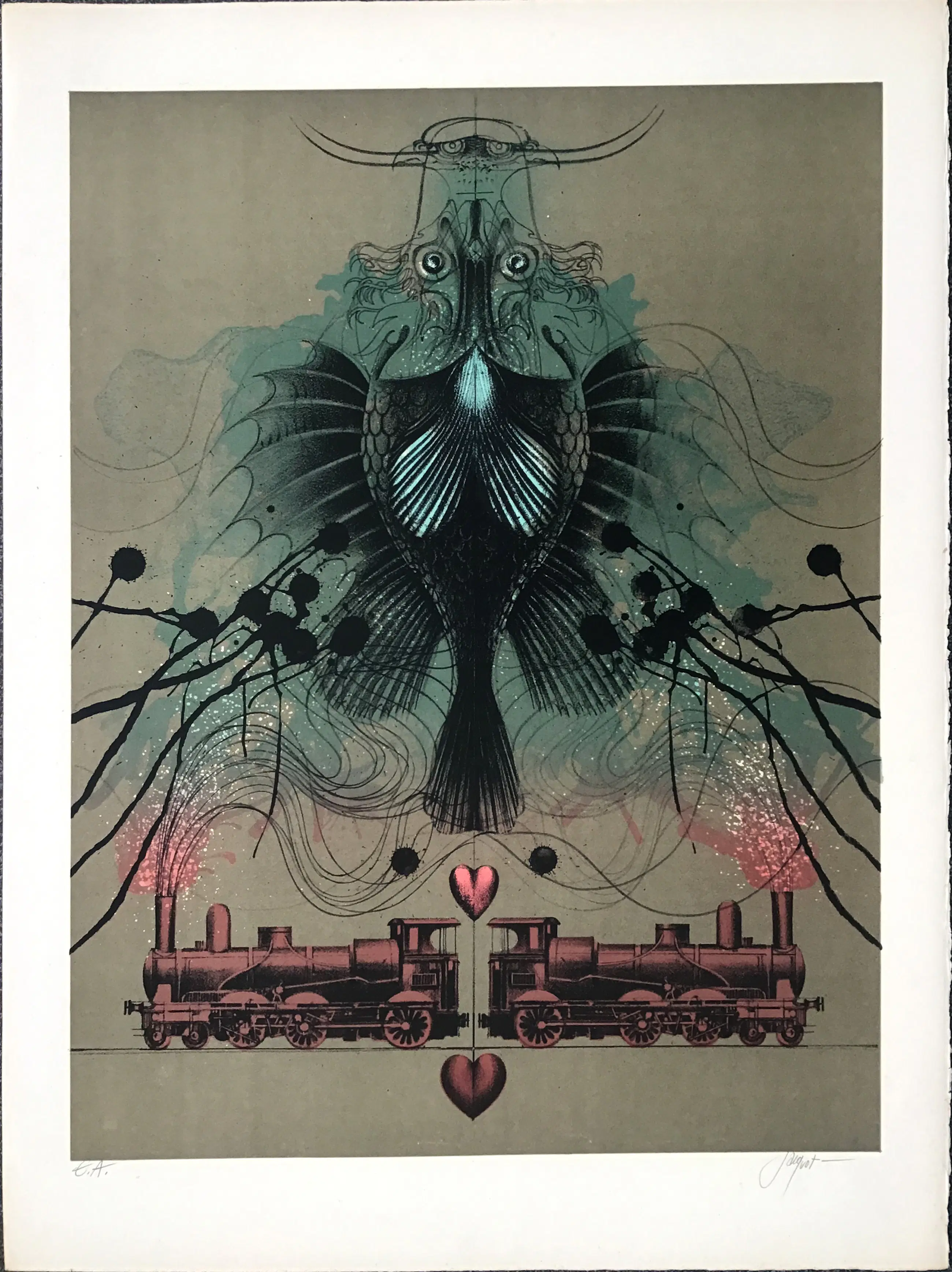 Fantasie dier/vis op een abstracte achtergrond met daaronder gespiegelde stoomlocomotieven