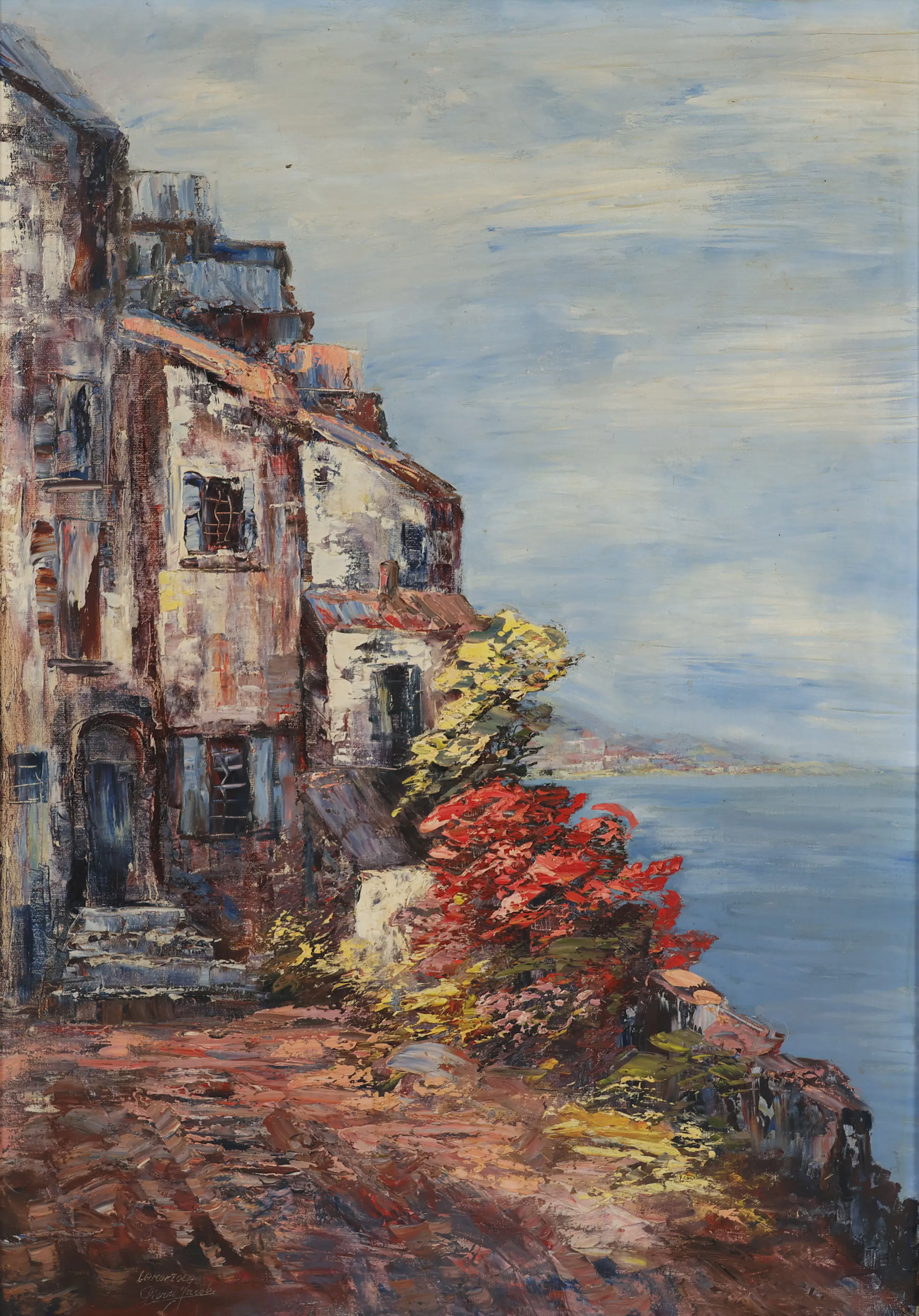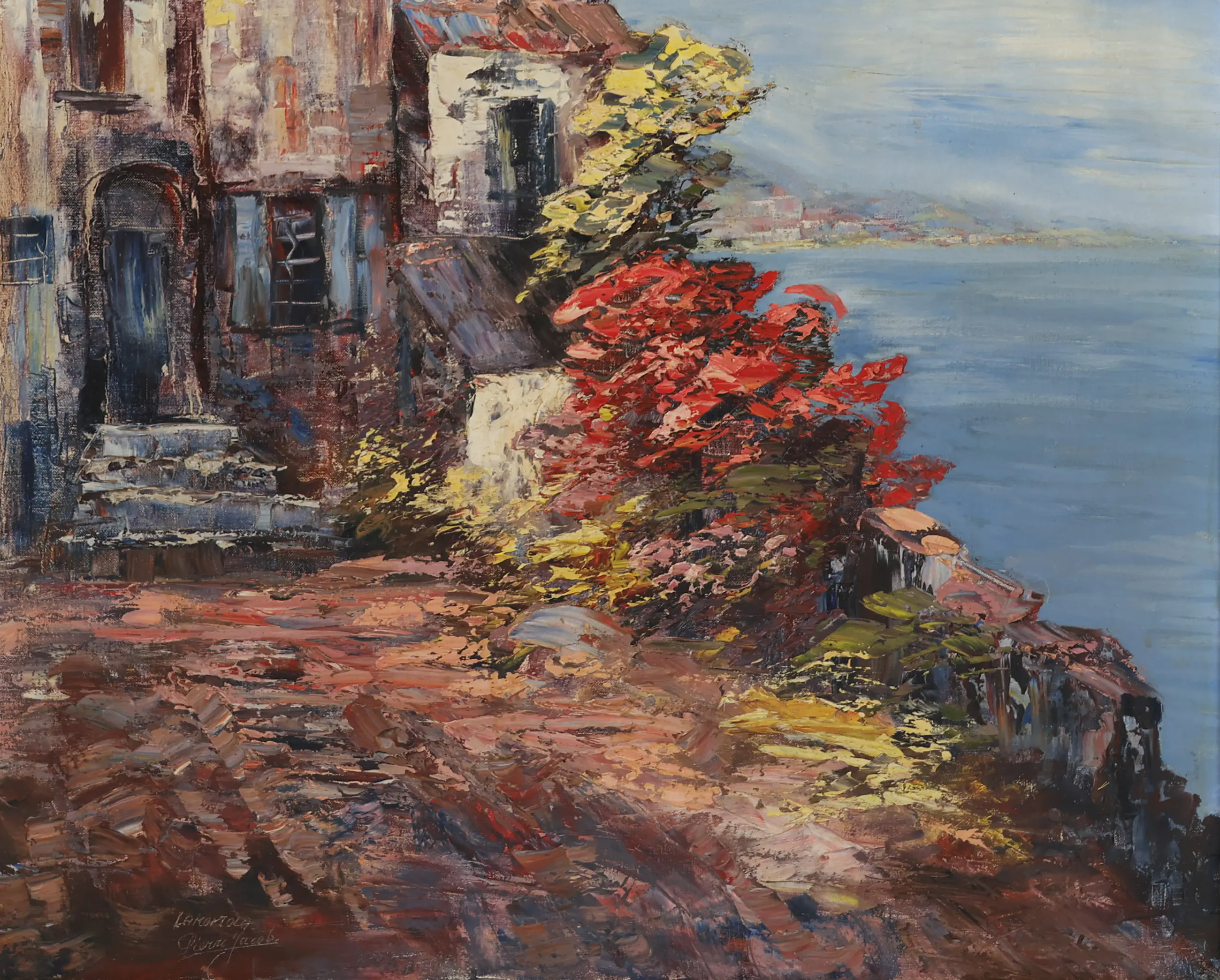 Dit schilderij toont een sfeervol kustdorp, gelegen aan een helderblauwe zee. De oude huizen, met verweerde gevels in warme tinten van oker, roodbruin en crème, ademen een gevoel van nostalgie en mediterrane charme. De dikke penseelstreken en rijke textuur benadrukken de gelaagdheid van het licht en de materialen.