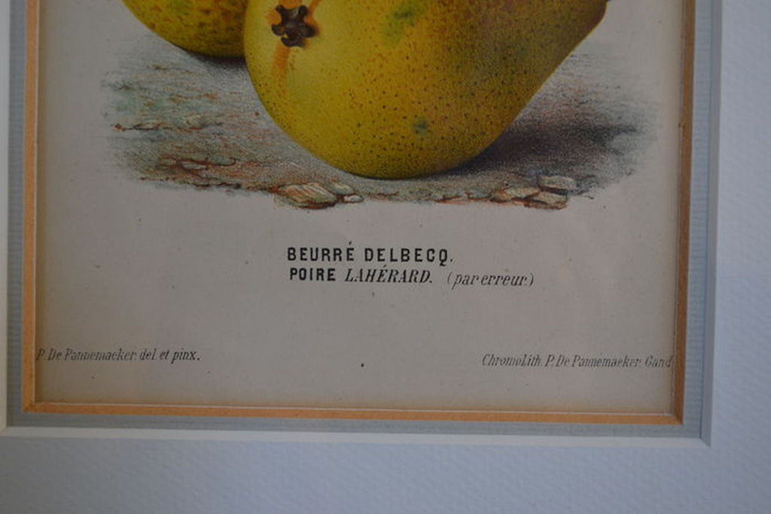 Prachtige chromolithografie van P. de Pannemaeker. Betreft afbeelding van twee peren met de volgende tekst: