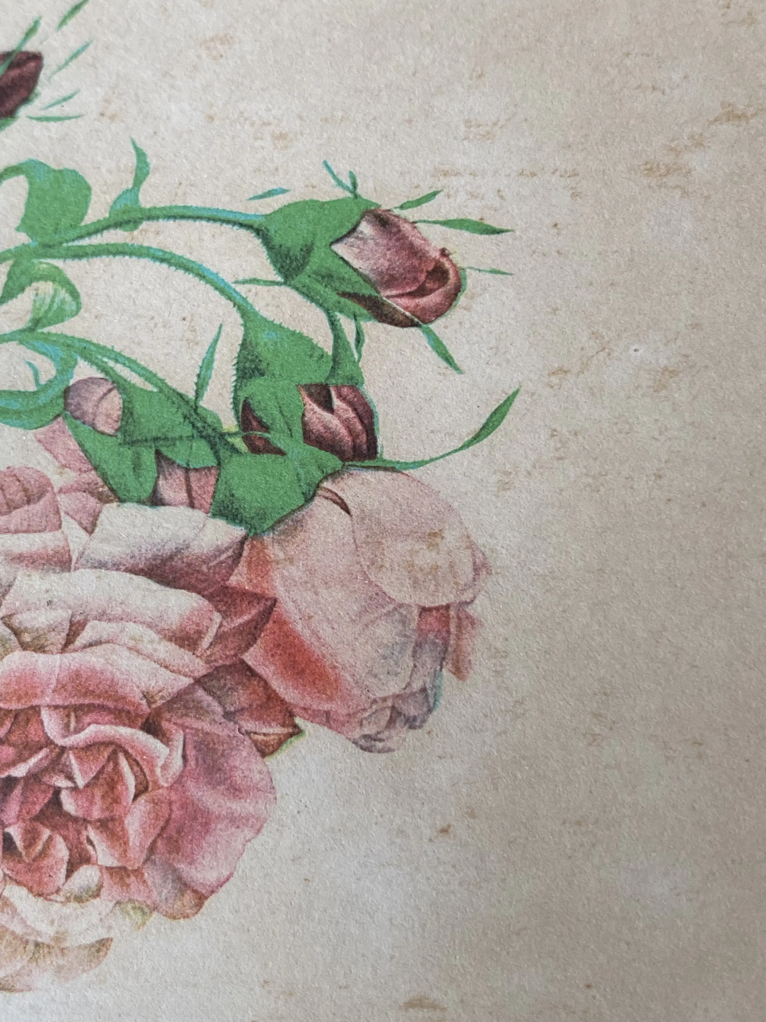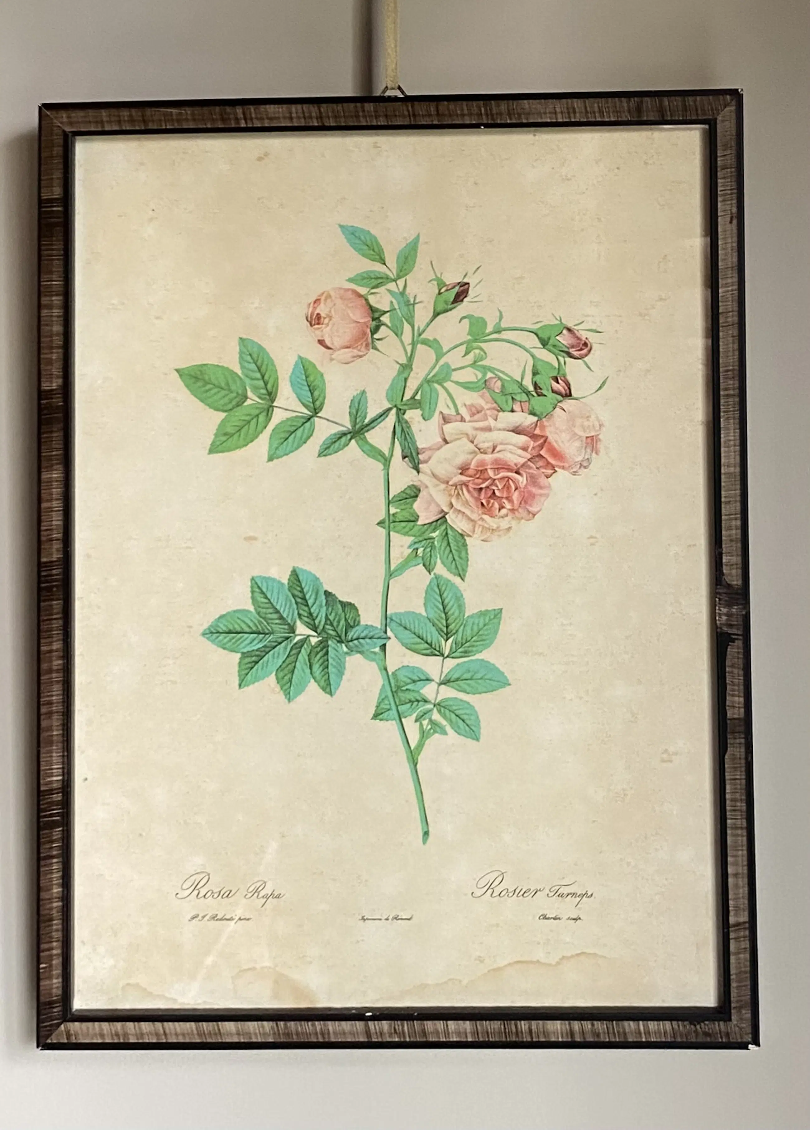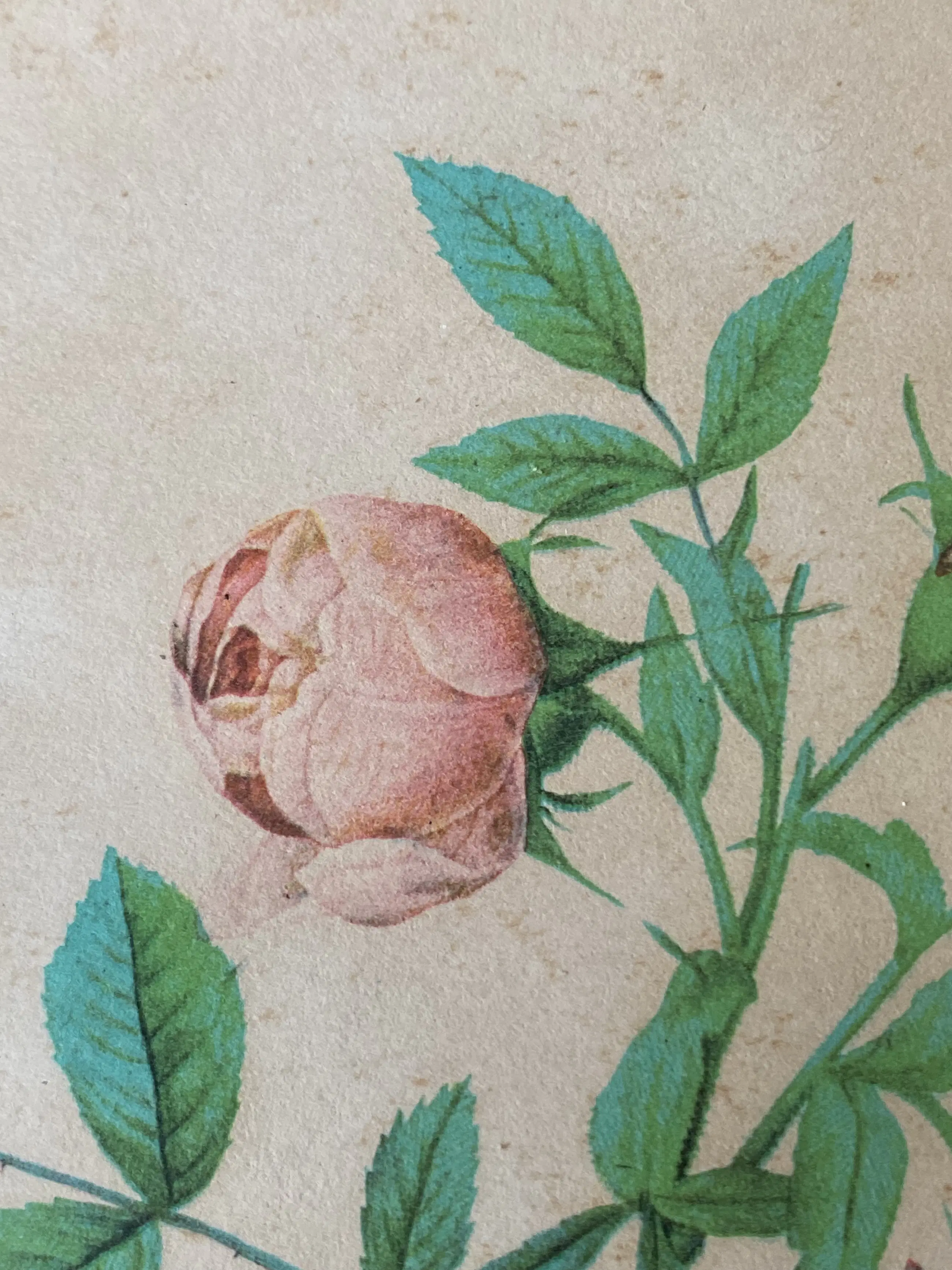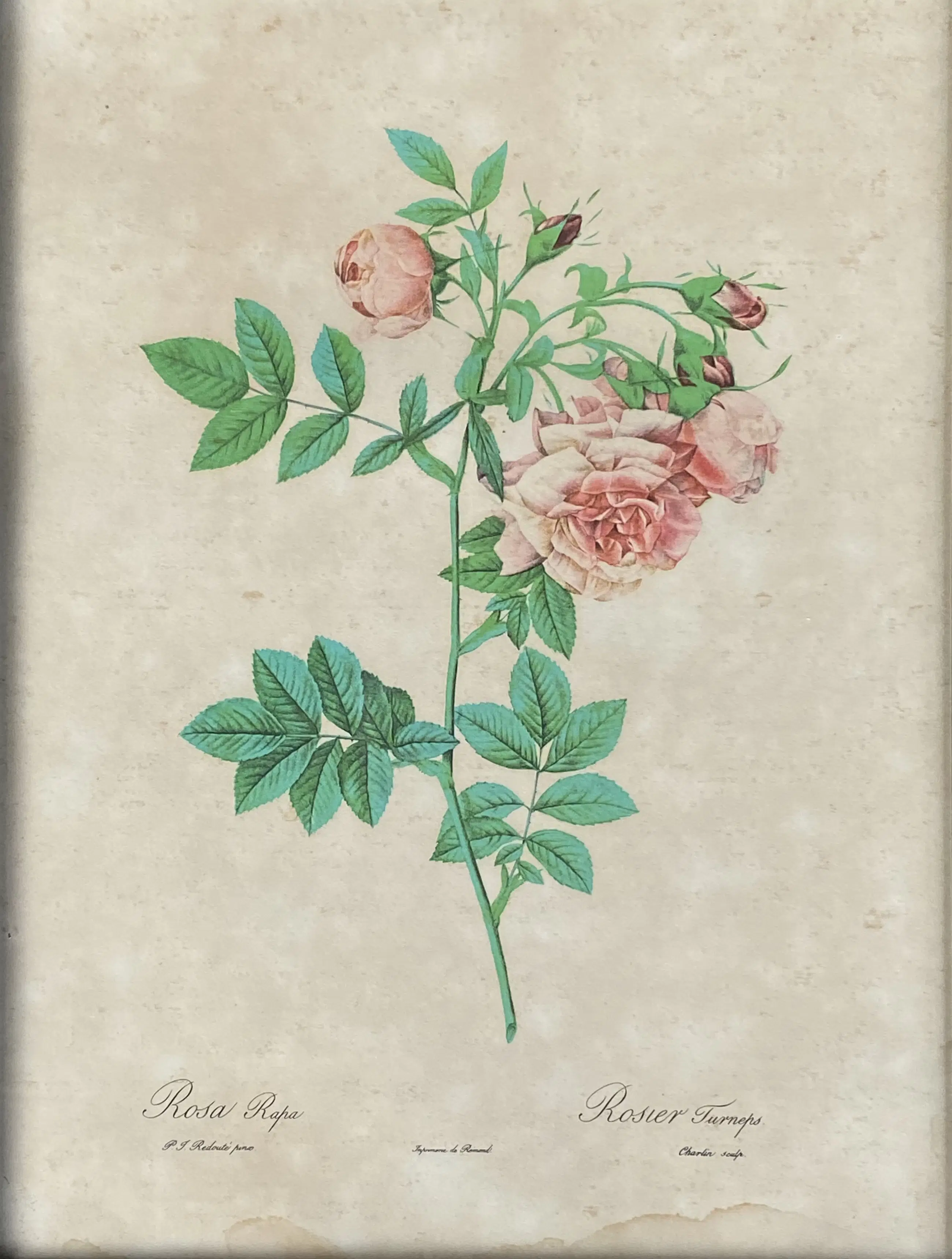 Deze botanische prent is van een illustratie van Pierre-Joseph Redouté (1759-1840), een van de meest beroemde botanische kunstenaars uit de geschiedenis. Redouté werd geroemd om zijn nauwkeurige en elegante bloemenillustraties en werkte als hofschilder voor Marie Antoinette en later voor keizerin Joséphine Bonaparte. Zijn meesterwerk Les Roses (1824-1826) bevatte enkele van de mooiste rozenillustraties ooit gemaakt.
