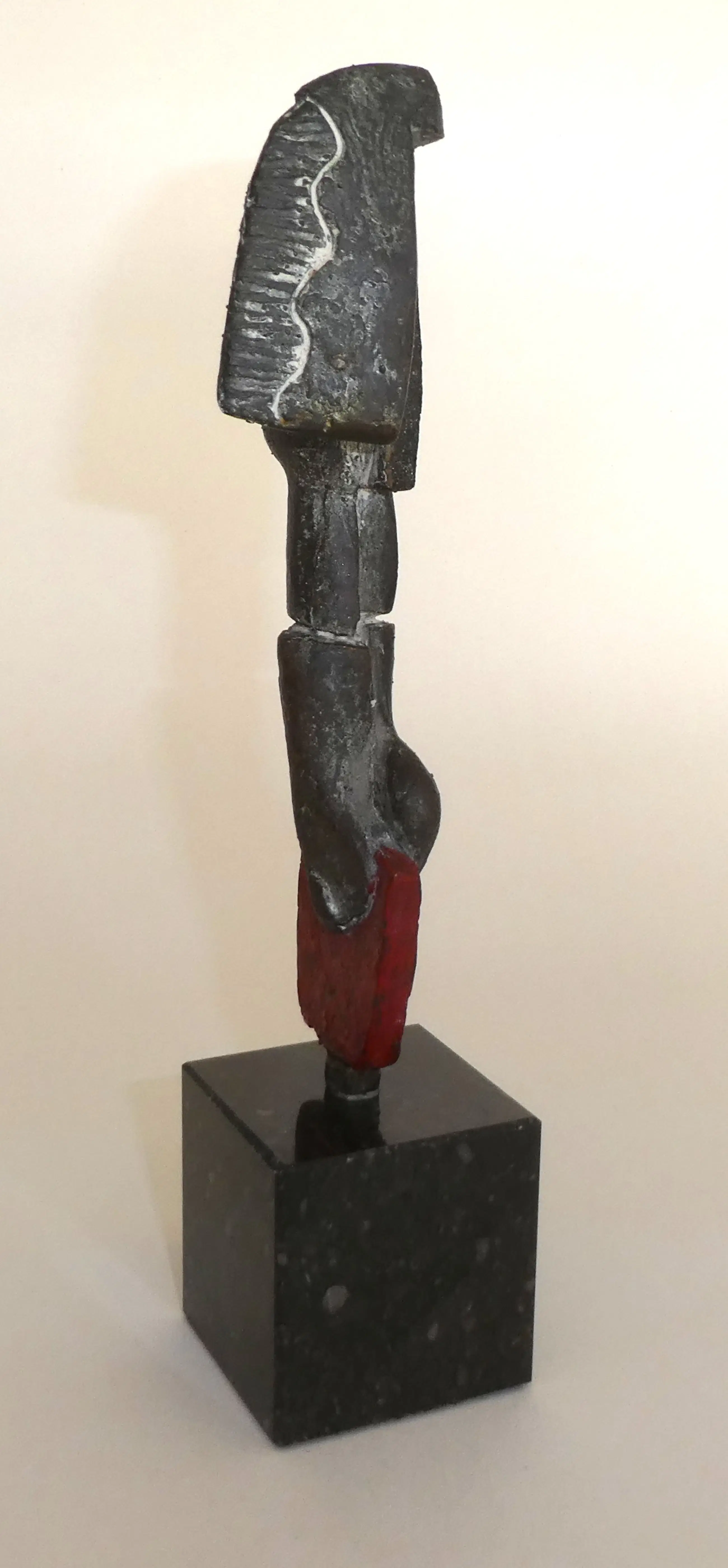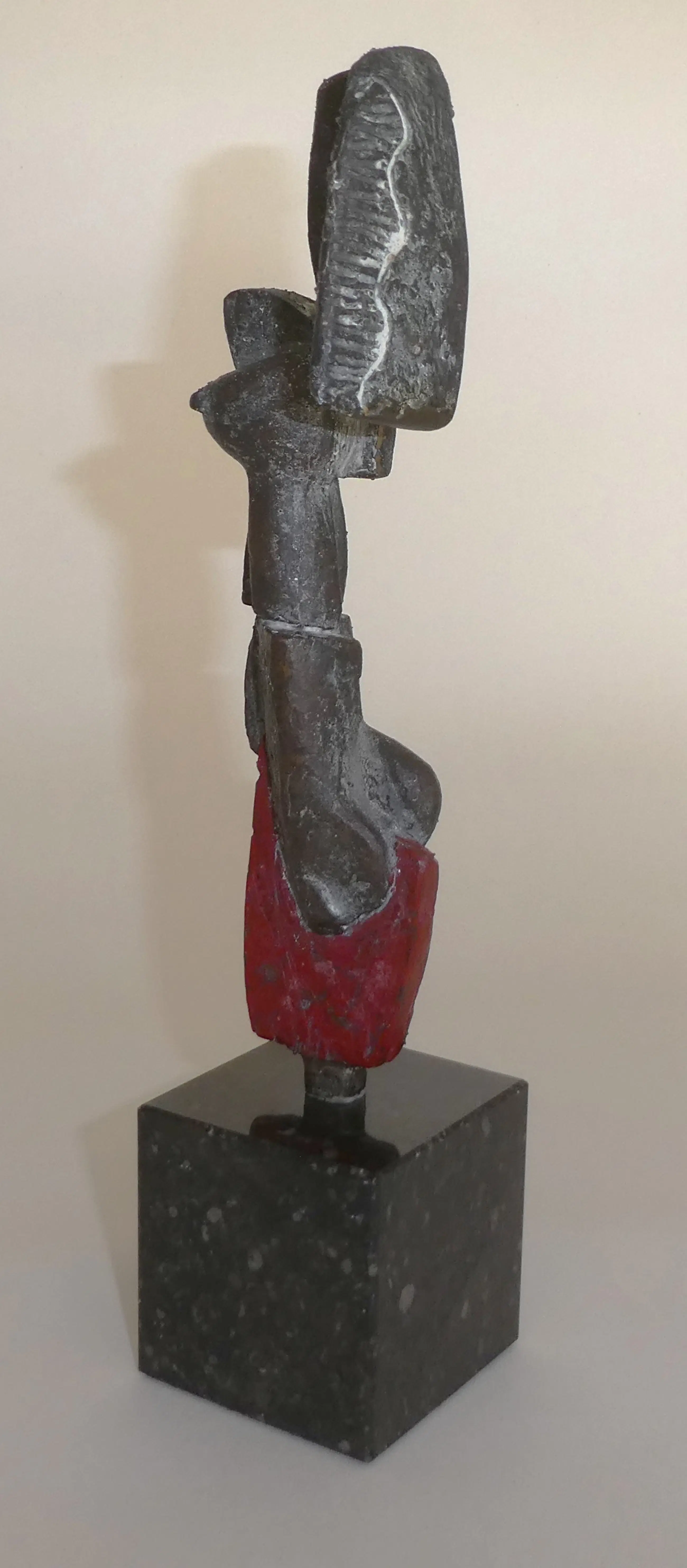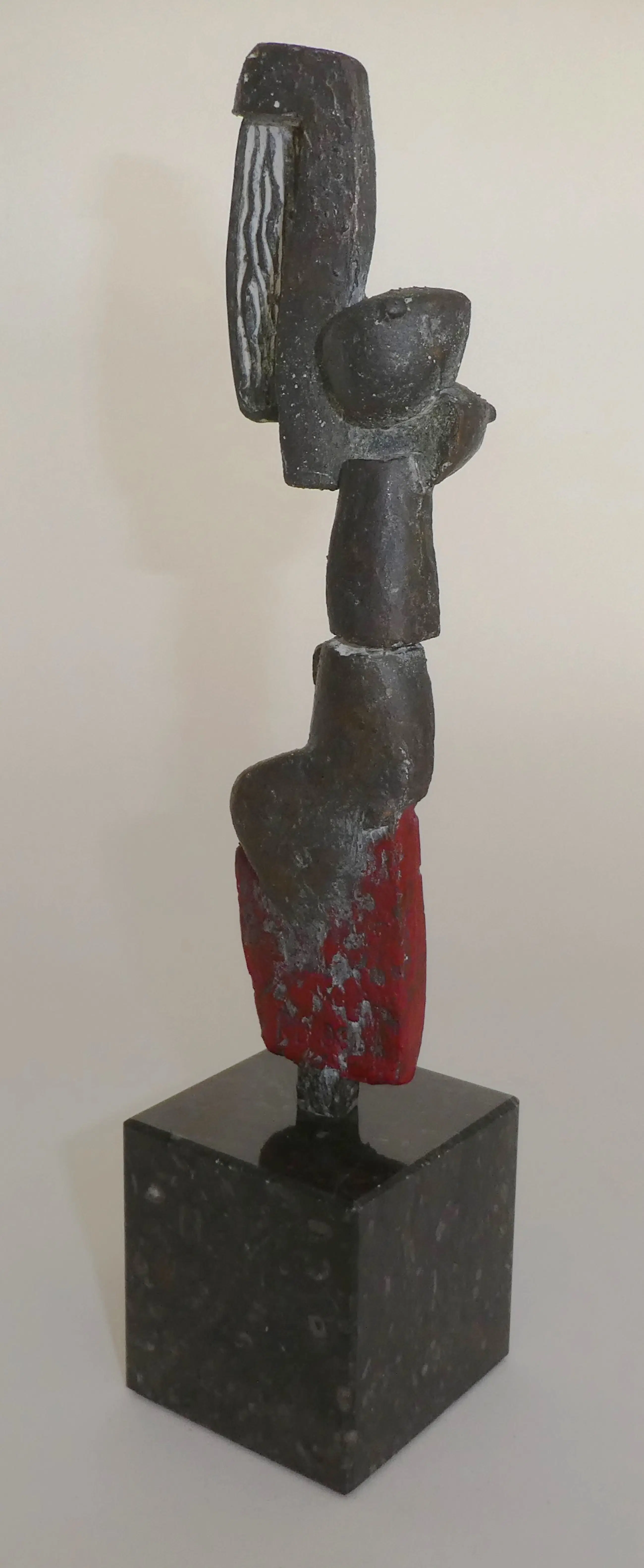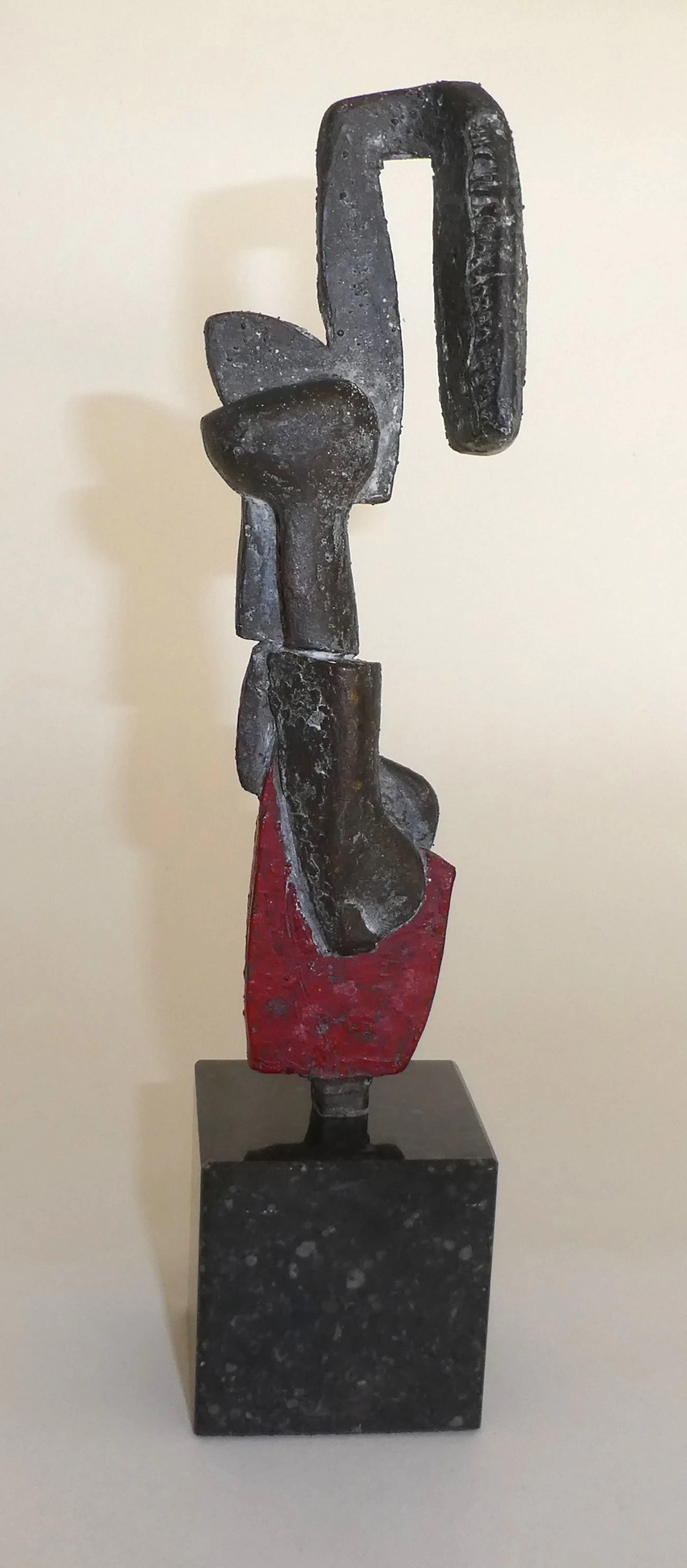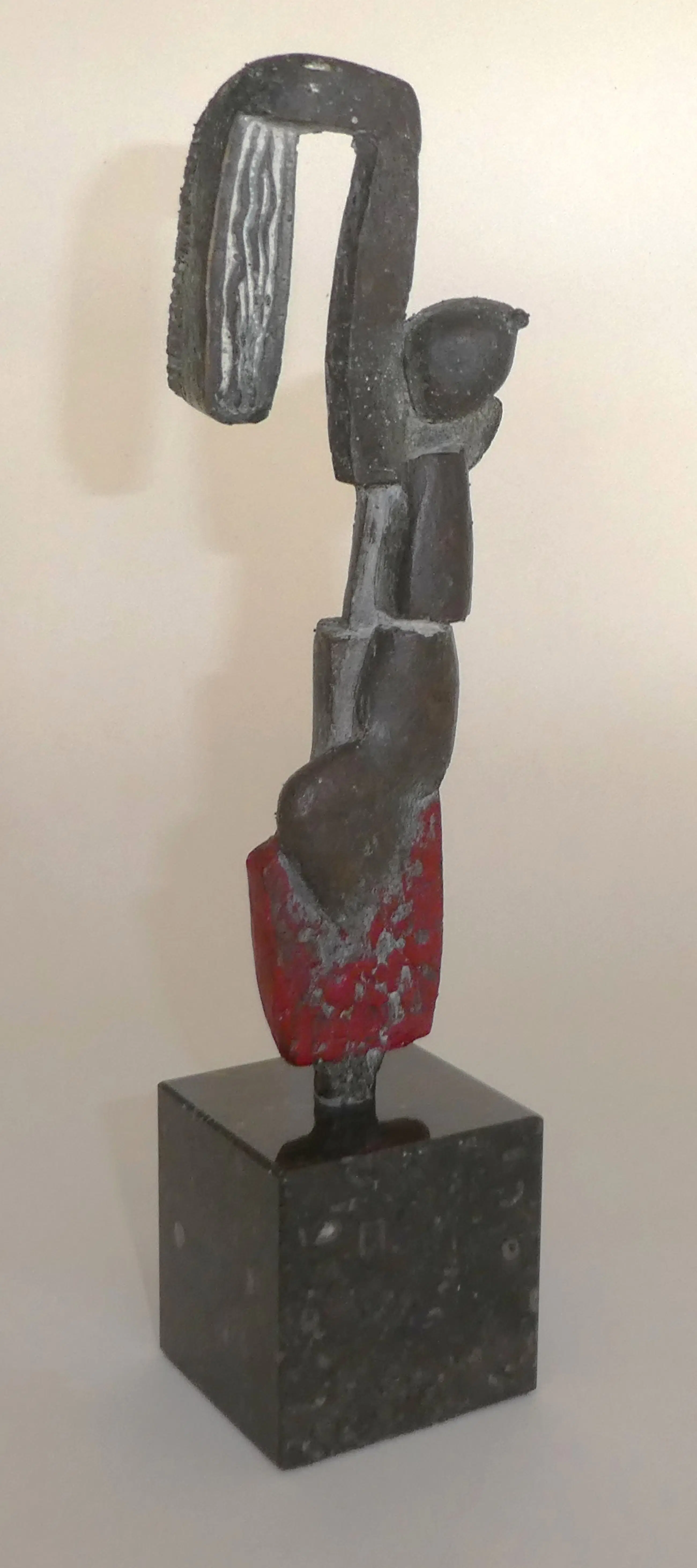 Bronzen beeldje van Pierre Lumey met rood lak en witte patina. Hoog: 18cm. Breed: 5cm. Diep: 4,5cm. Zwart marmeren sokkel: 5 x 5 x 5cm. Totale hoogte: 23cm Gesigneerd: PL 93.