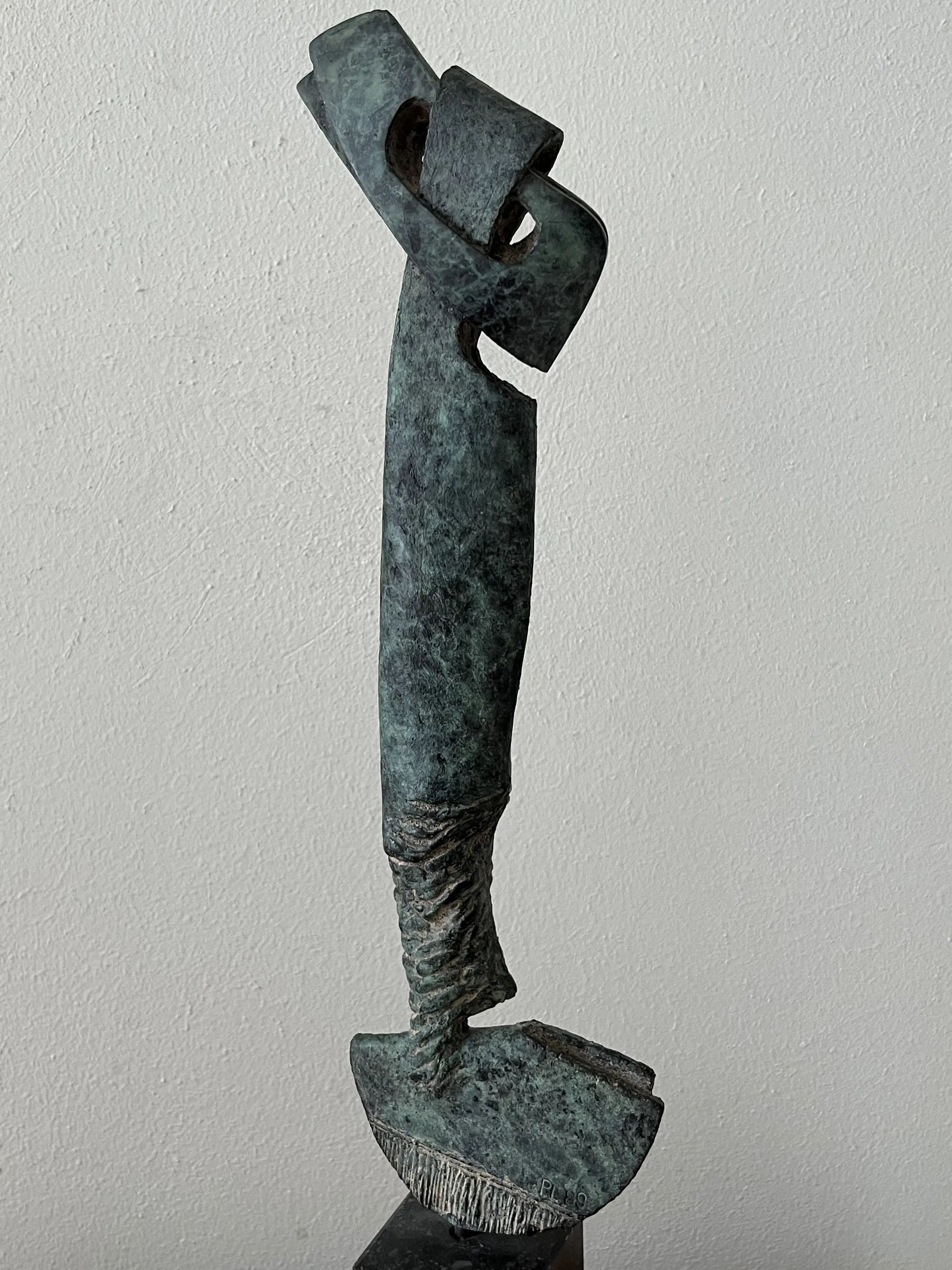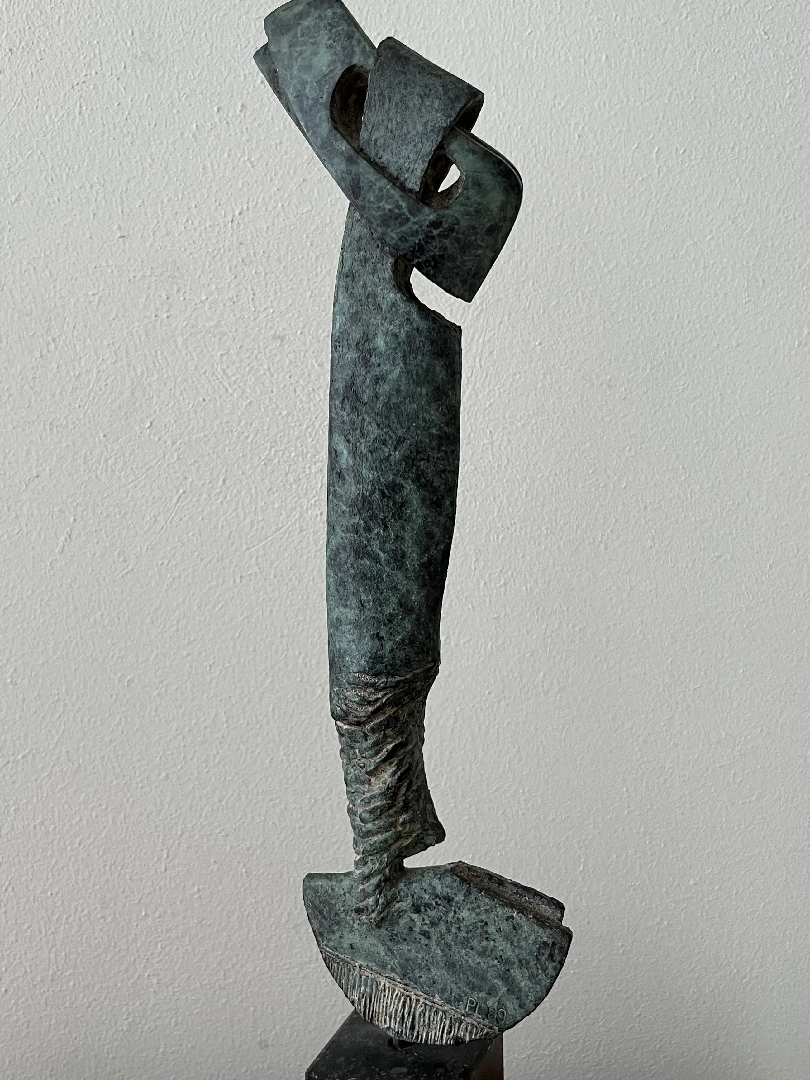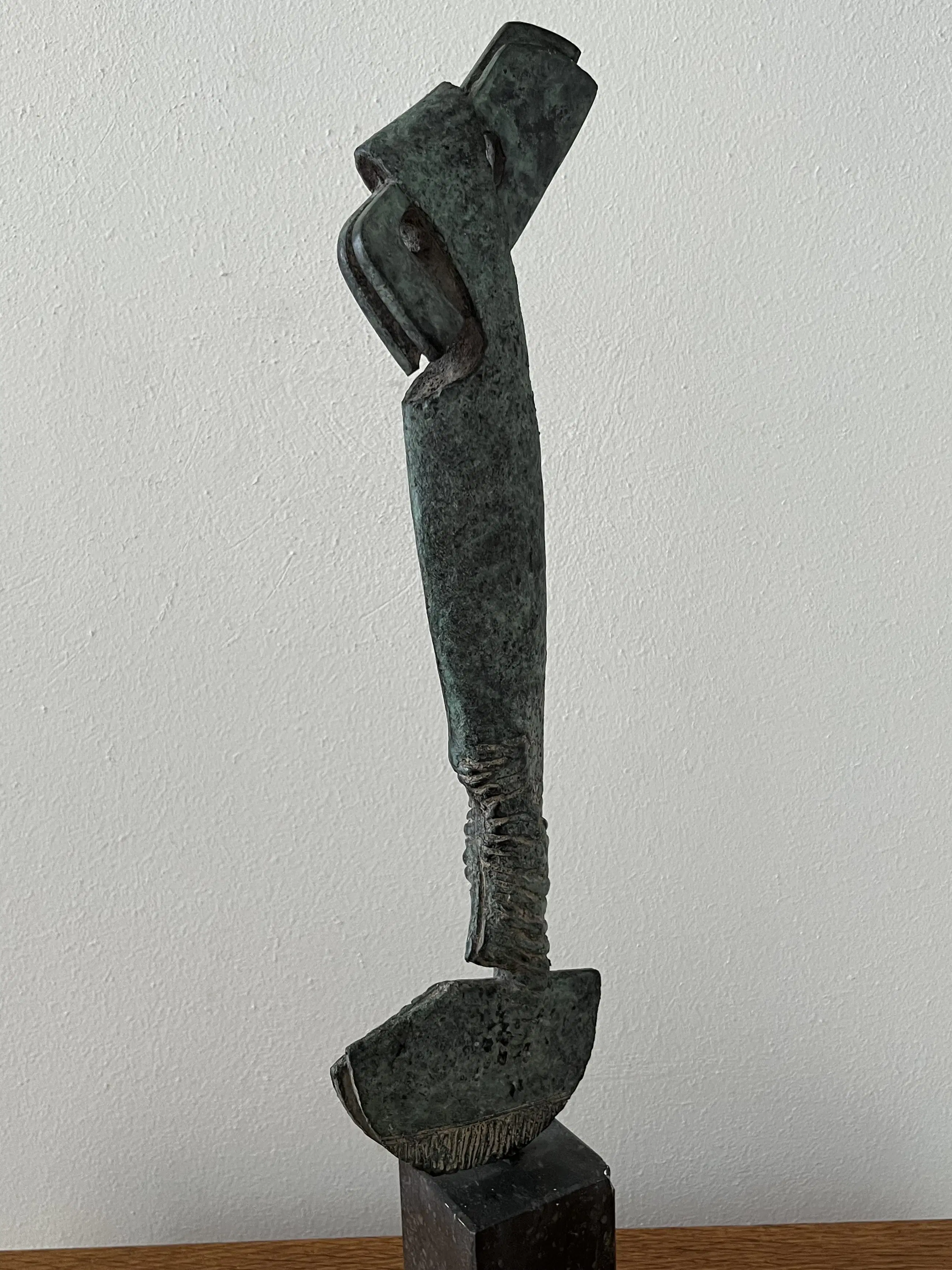 Initialen en jaartal zijn in het beeld aangebracht. Afmetingen beeld 33 x 2 x 11 cm. Afmeting sokkel. 10,5 x 5 x 5 cm. Totale hoogte 43,5 cm.