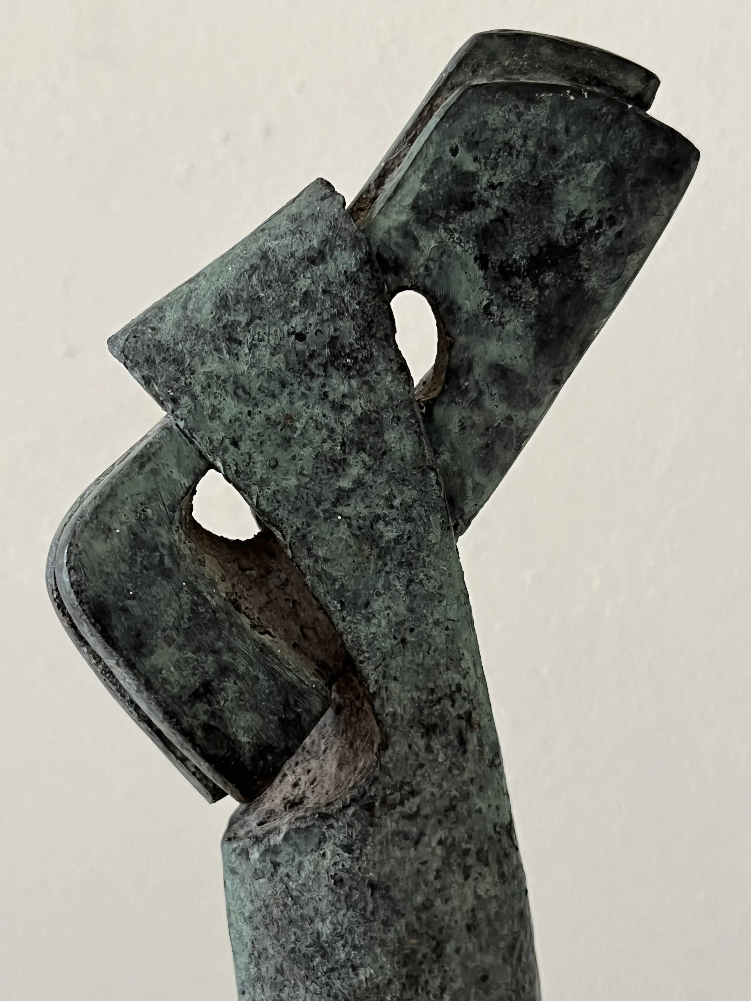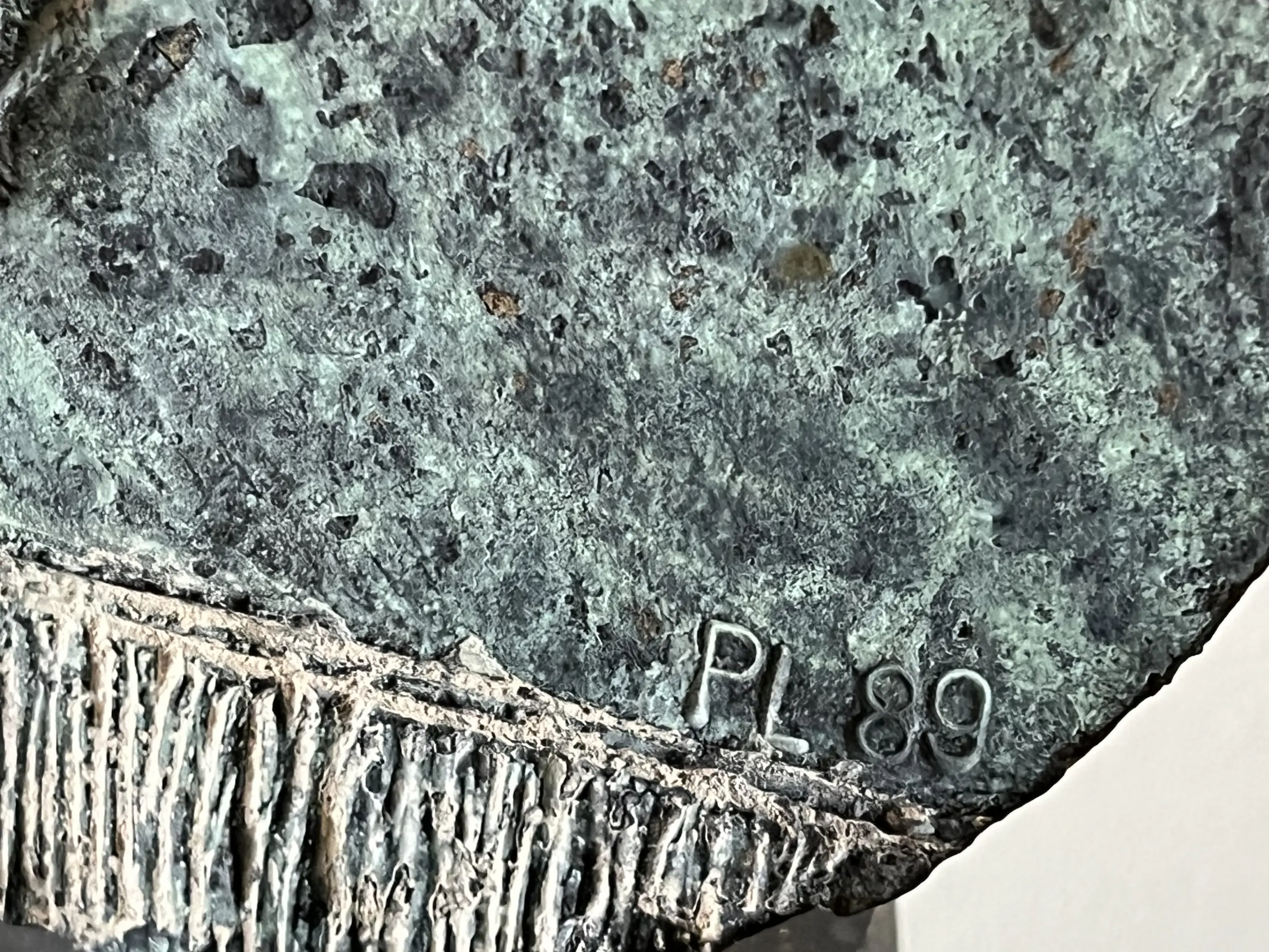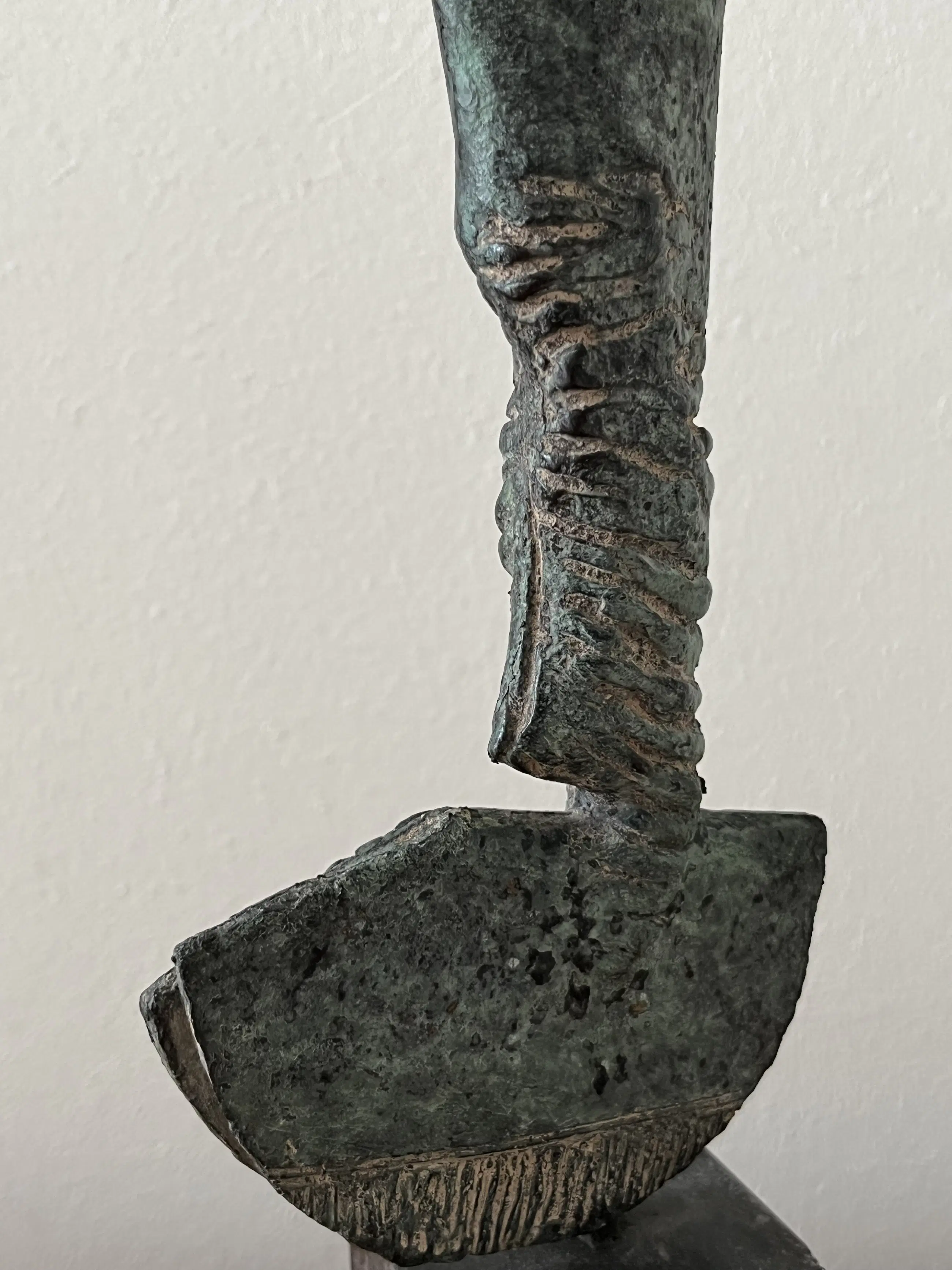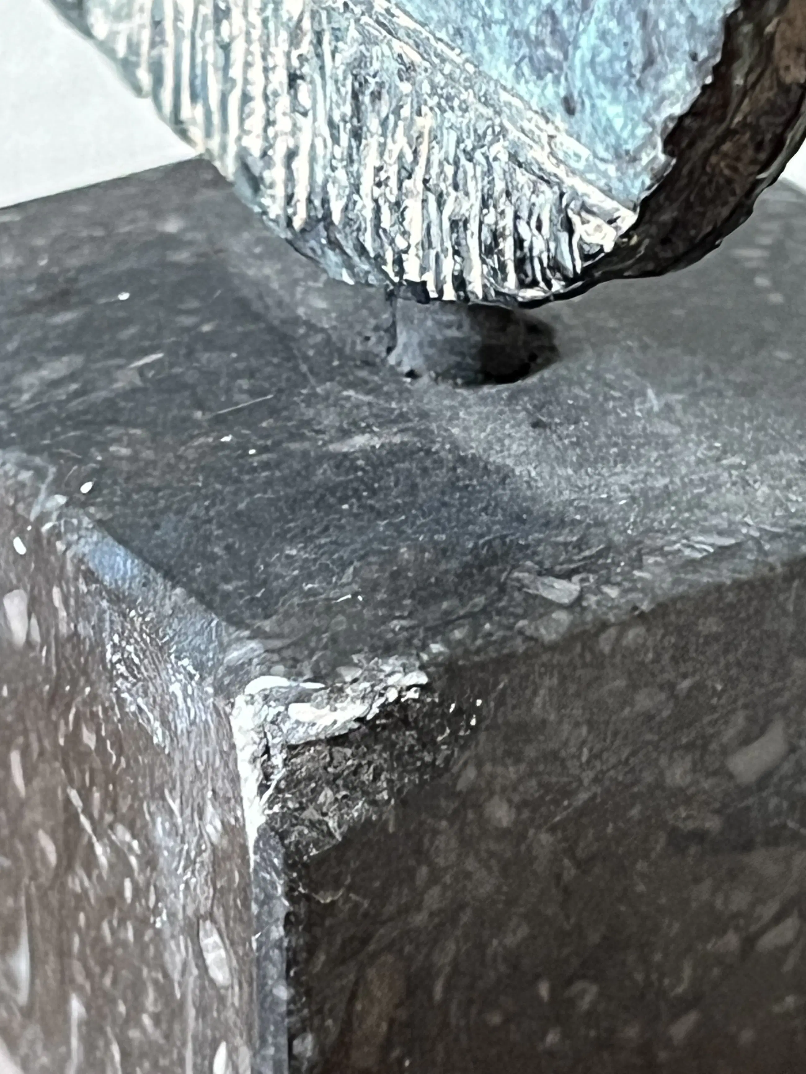 Initialen en jaartal zijn in het beeld aangebracht. Afmetingen beeld 33 x 2 x 11 cm. Afmeting sokkel. 10,5 x 5 x 5 cm. Totale hoogte 43,5 cm.
