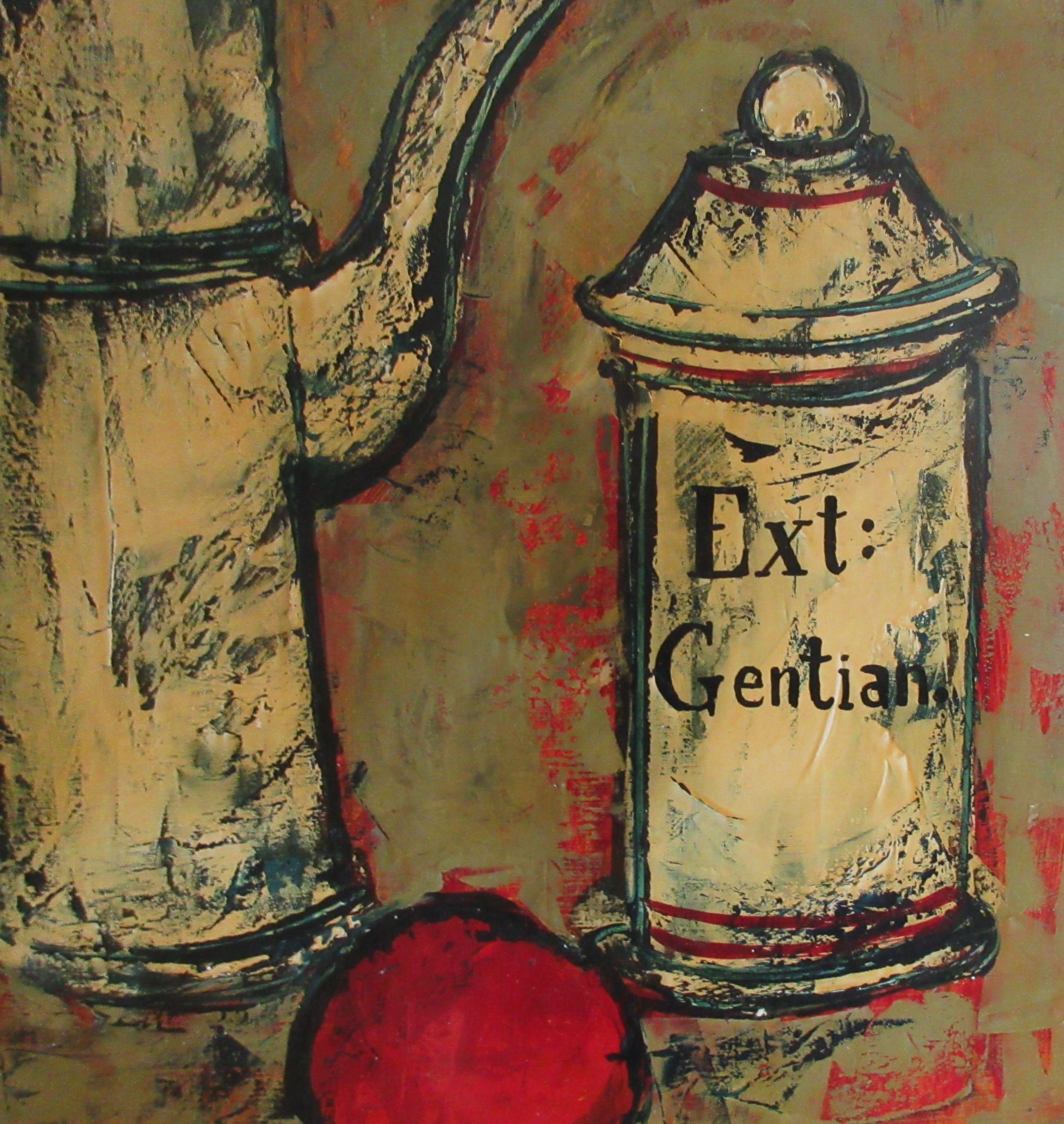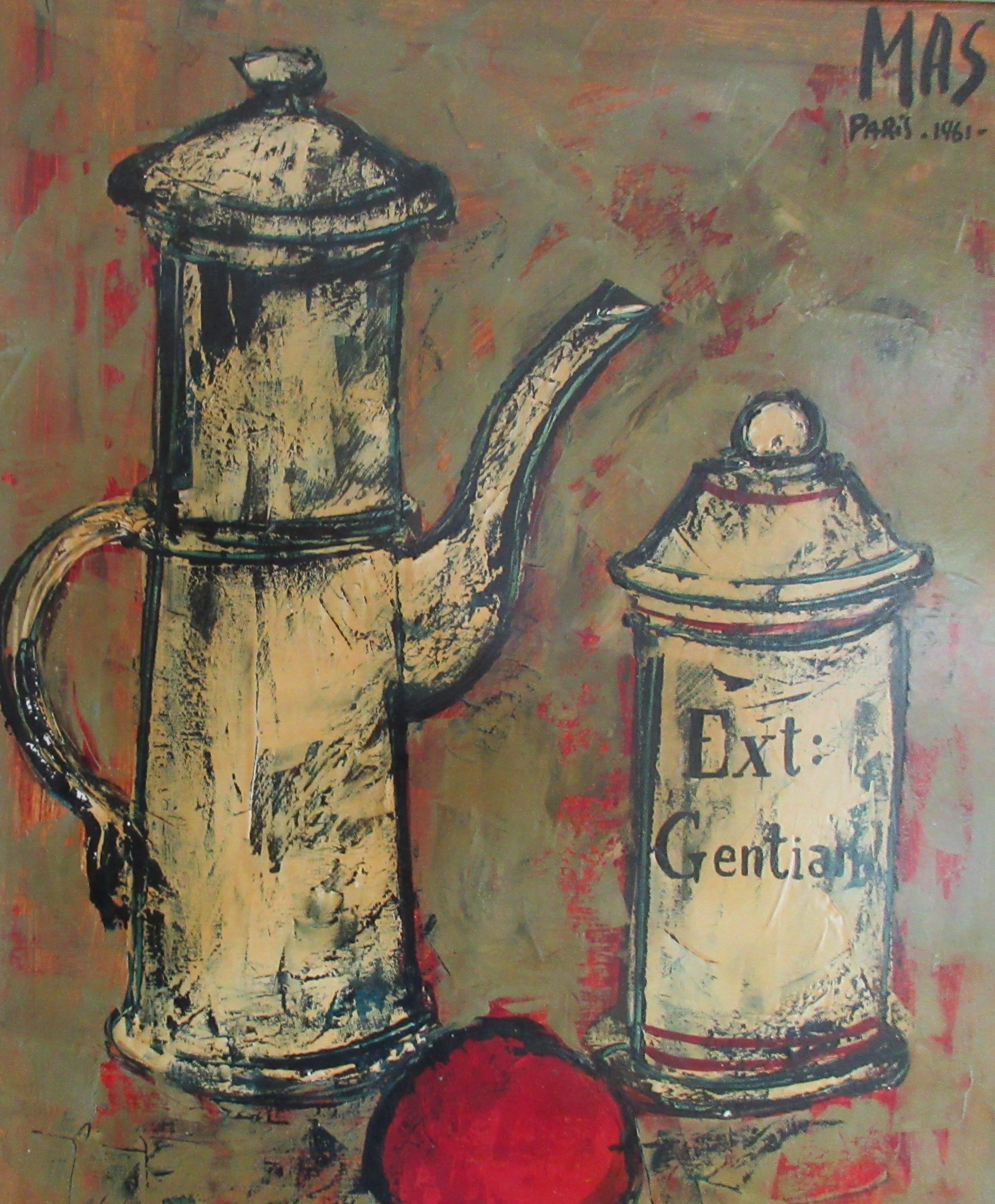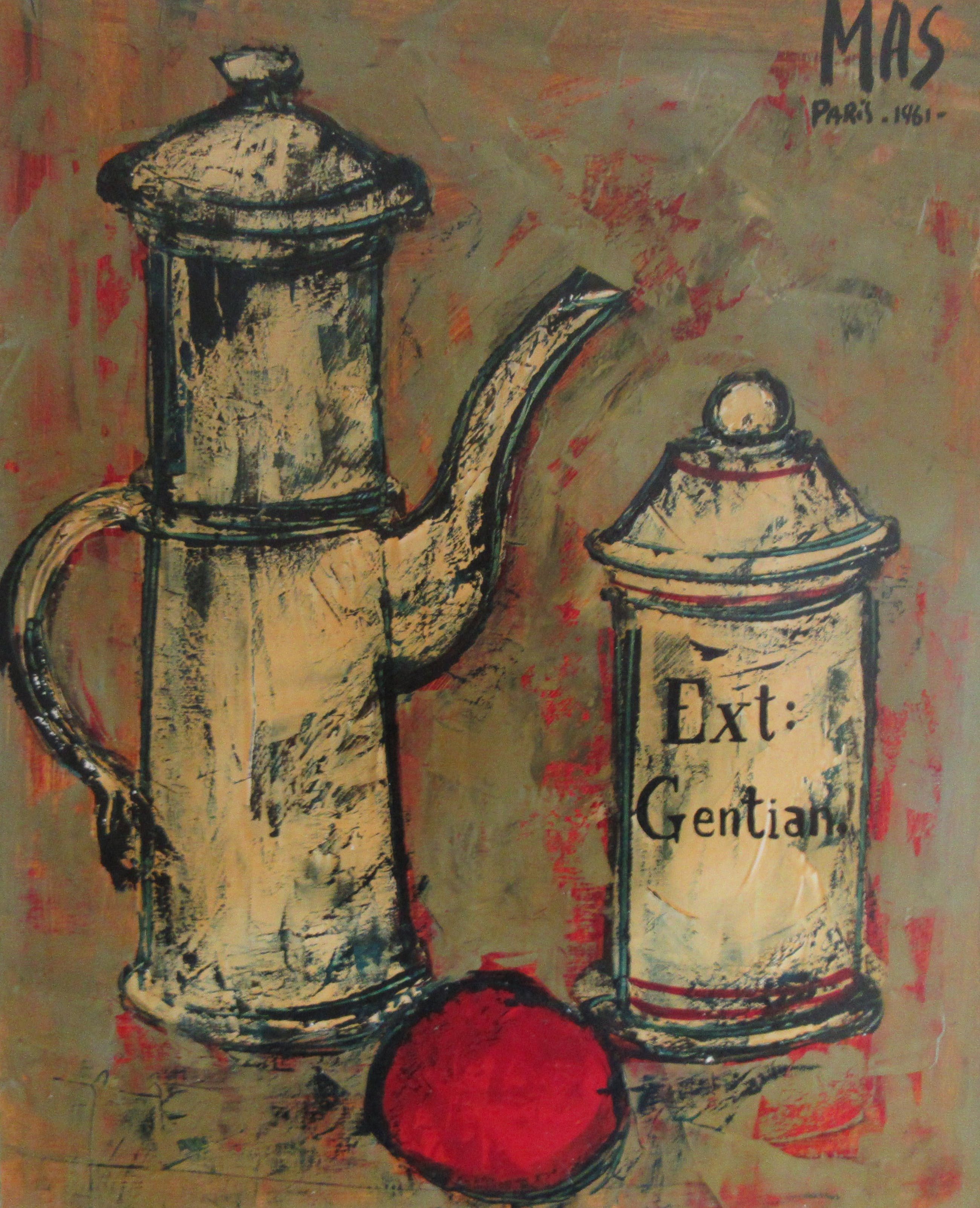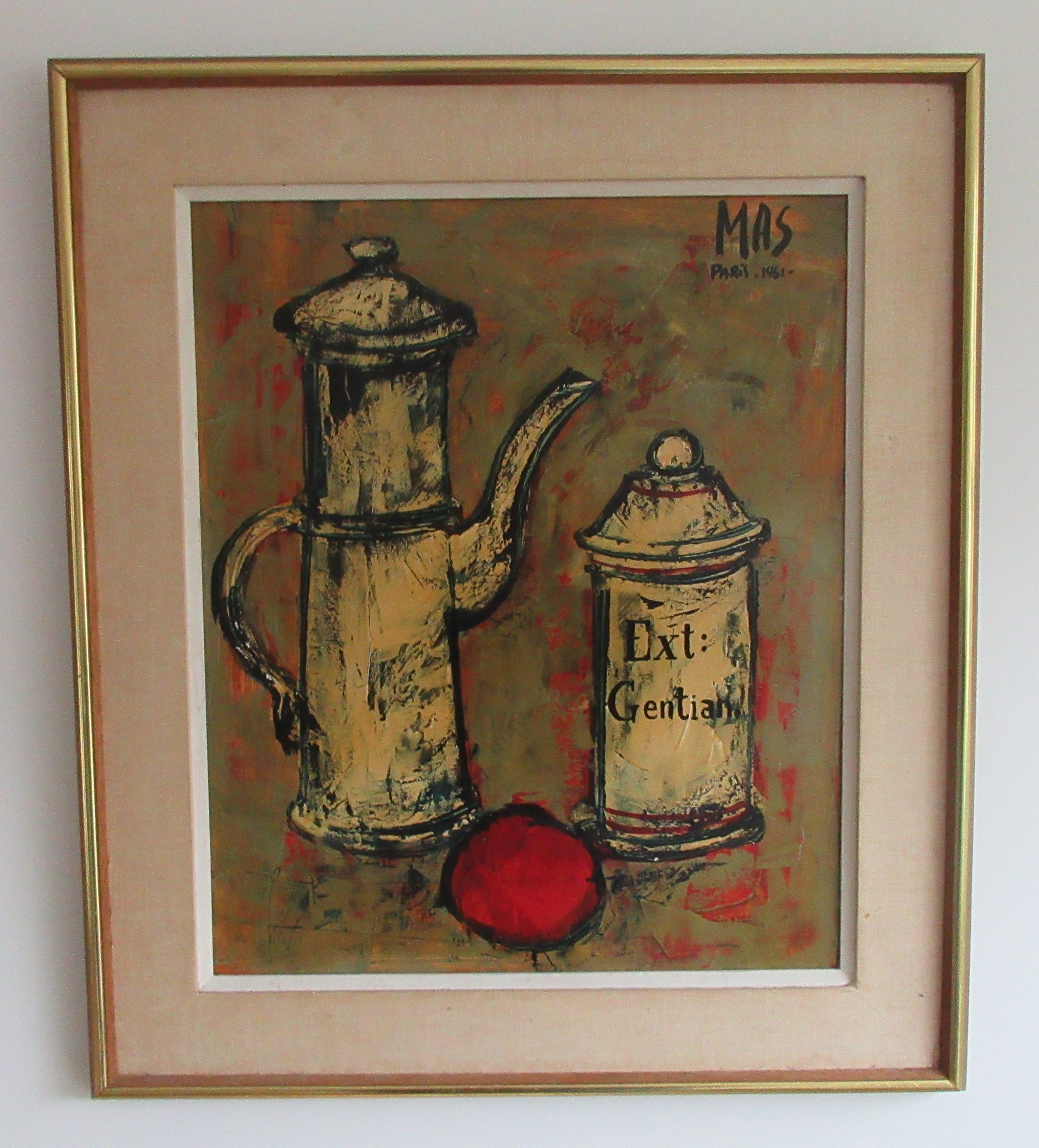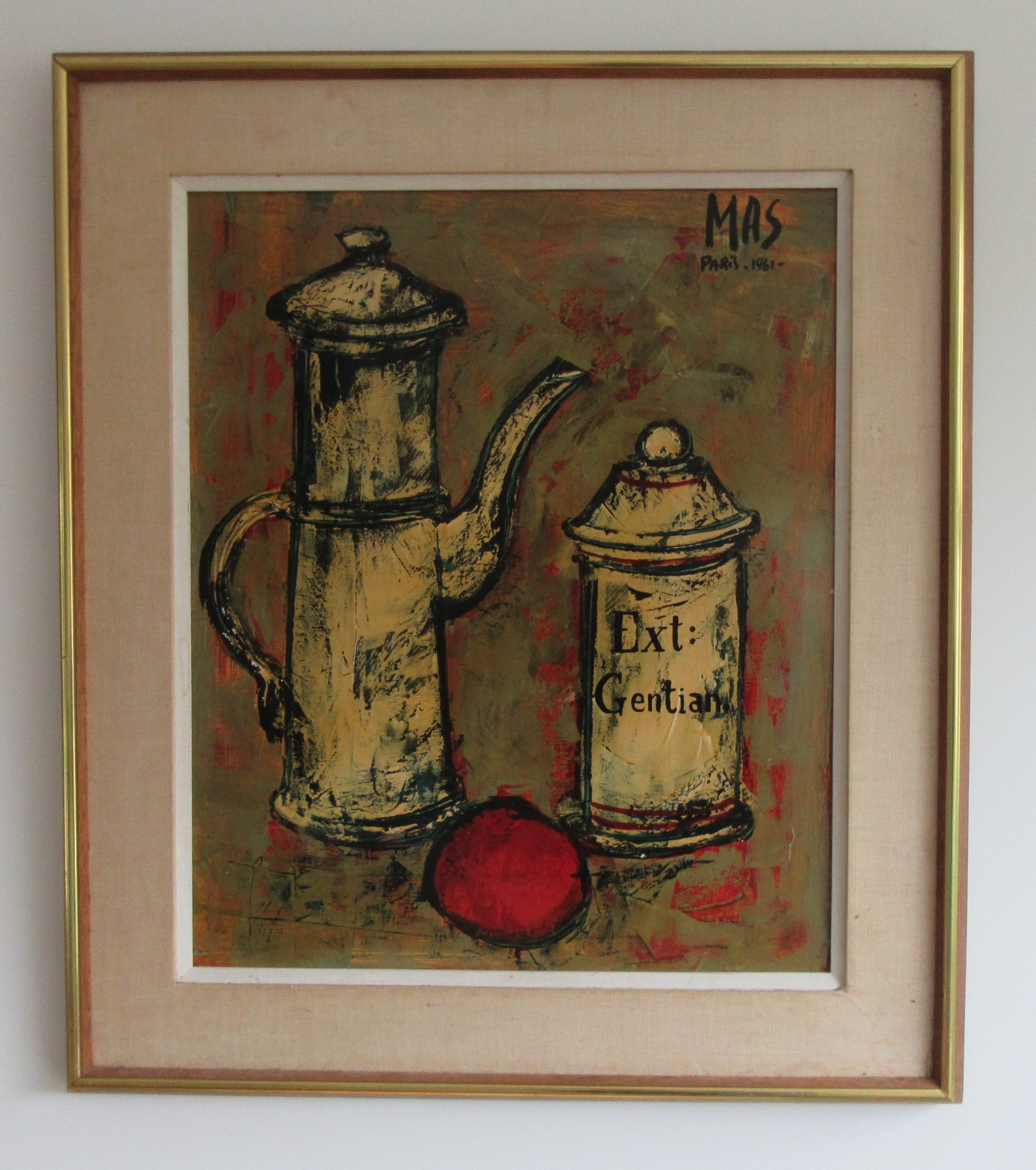 Een brutalistisch stilleven met de afbeelding van een koffiekan en een apothekersfles Gentiaan gemaakt door de Franse kunstenaar Pierre Mas in 1961 in Parijs. In zeer goede conditie. Het werk is voorzien van een goede kwaliteit houten lijst met vergulde rand en een met linnen bekleedde binnenlijst met wit gelakte rand. Rechts bovenin gesigneerd en gedateerd. Op de achterzijde is een sticker aanwezig van een galerie uit Mount Kisco, N.Y. in de VS.