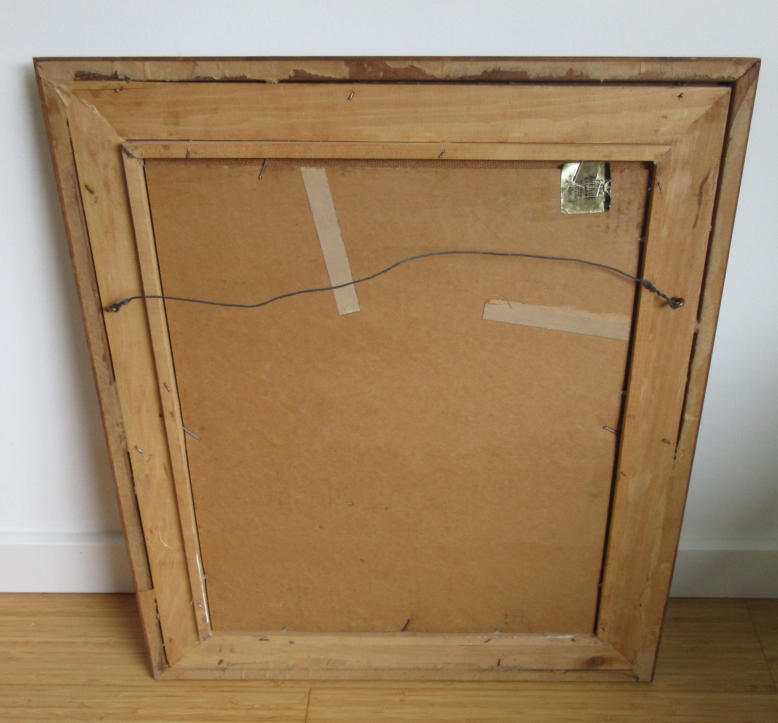 Het schilderij en de lijst heeft vrijwel geen beschadigingen, het linnen van de binnelijst is licht verkleurd en het schilderij is licht vuil.