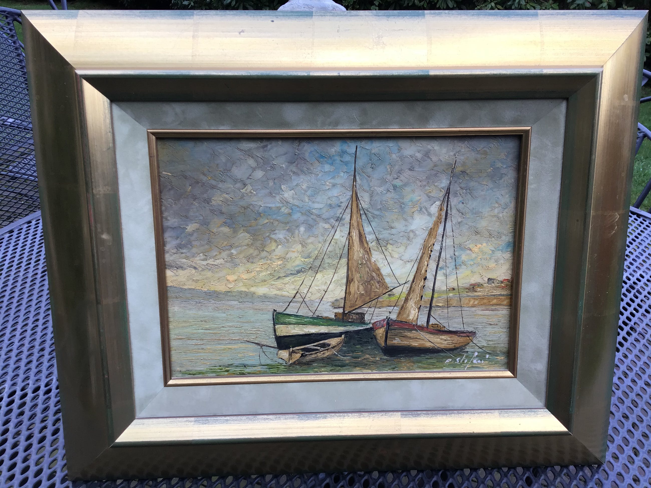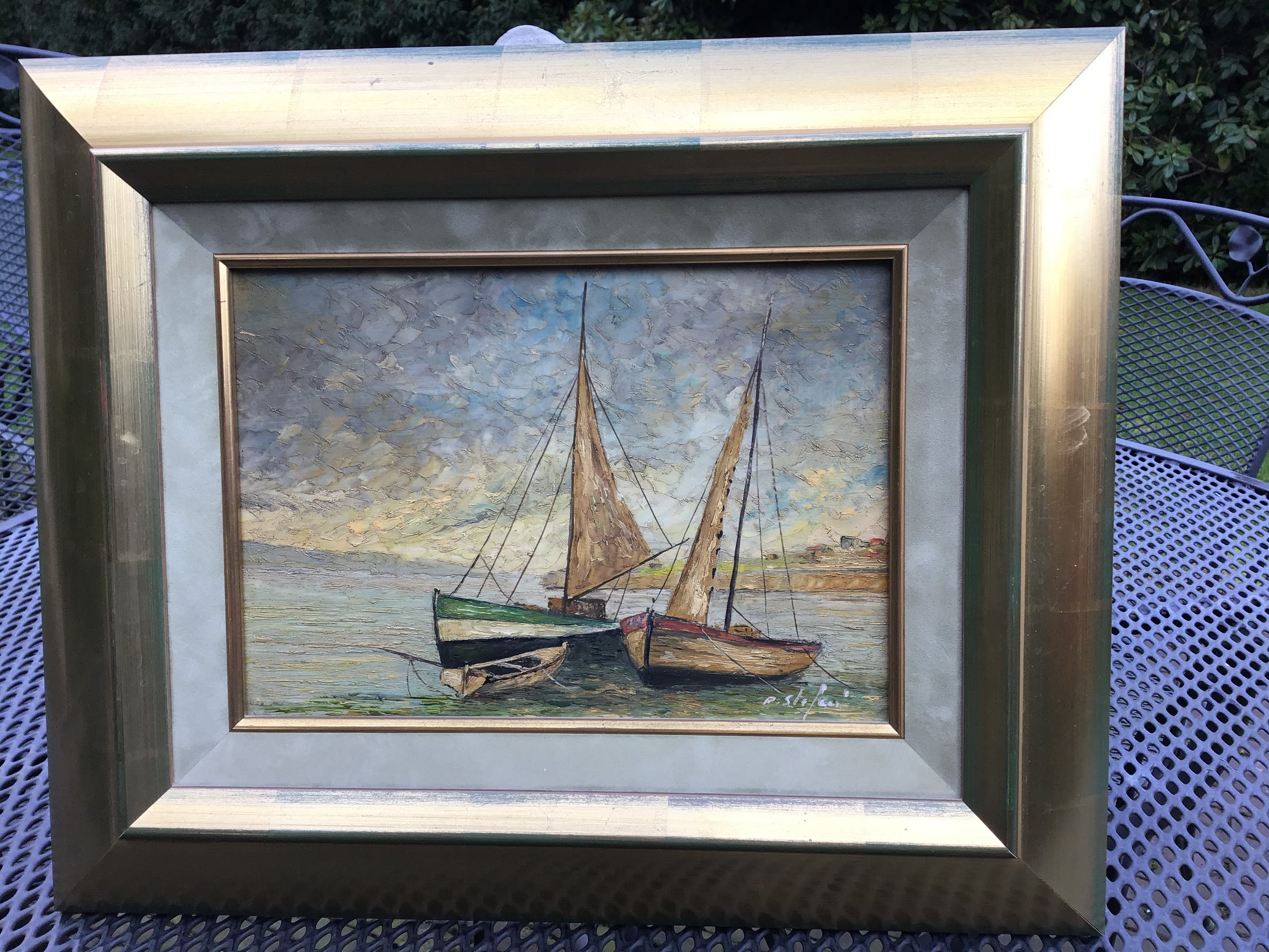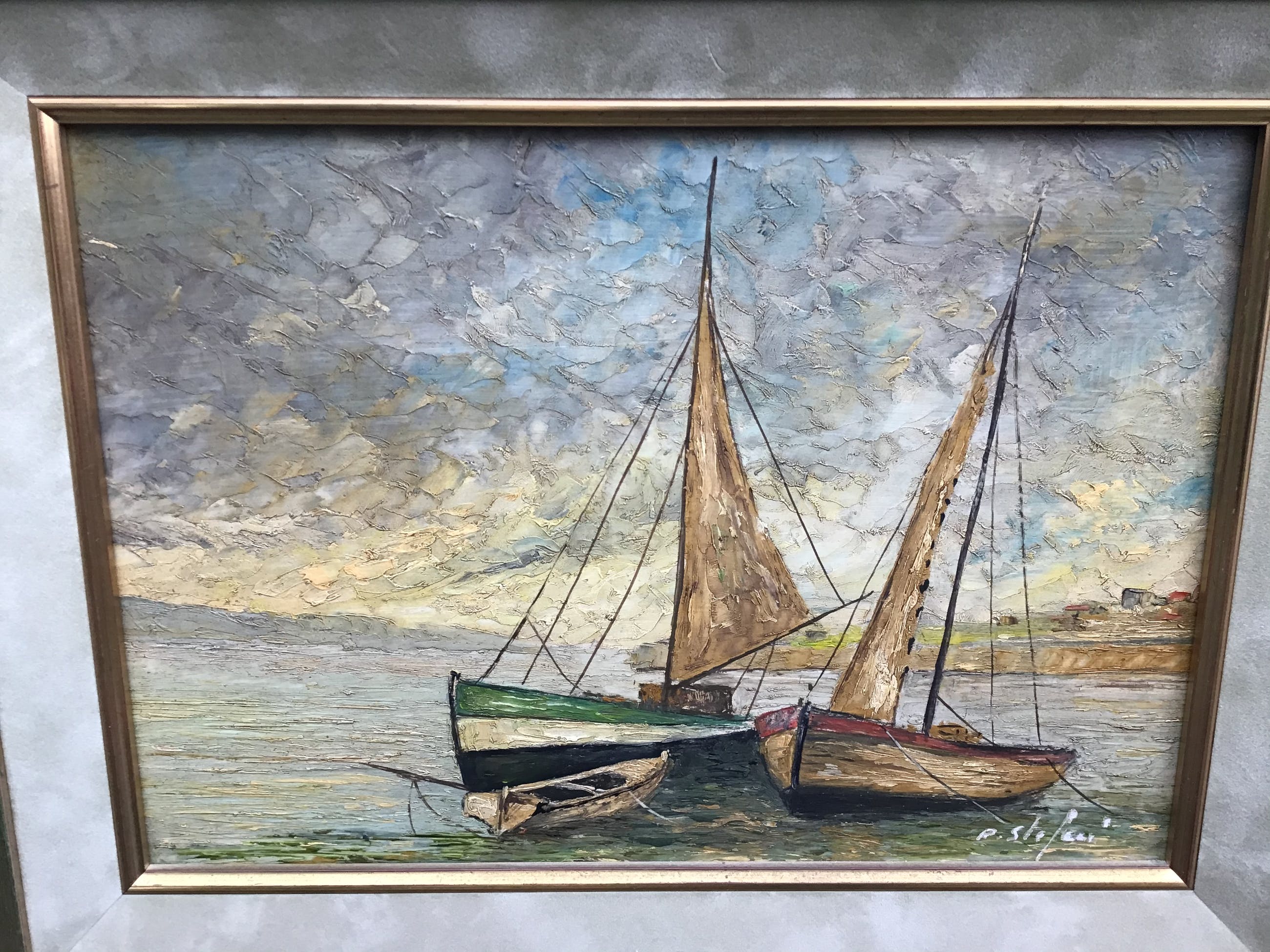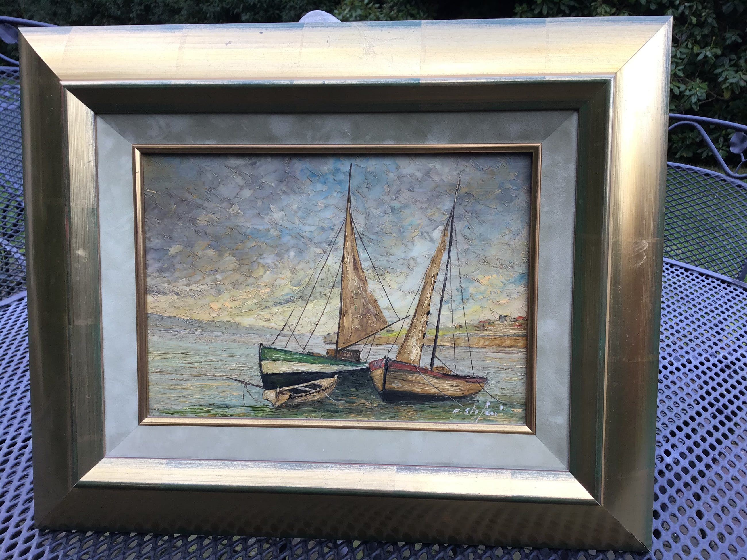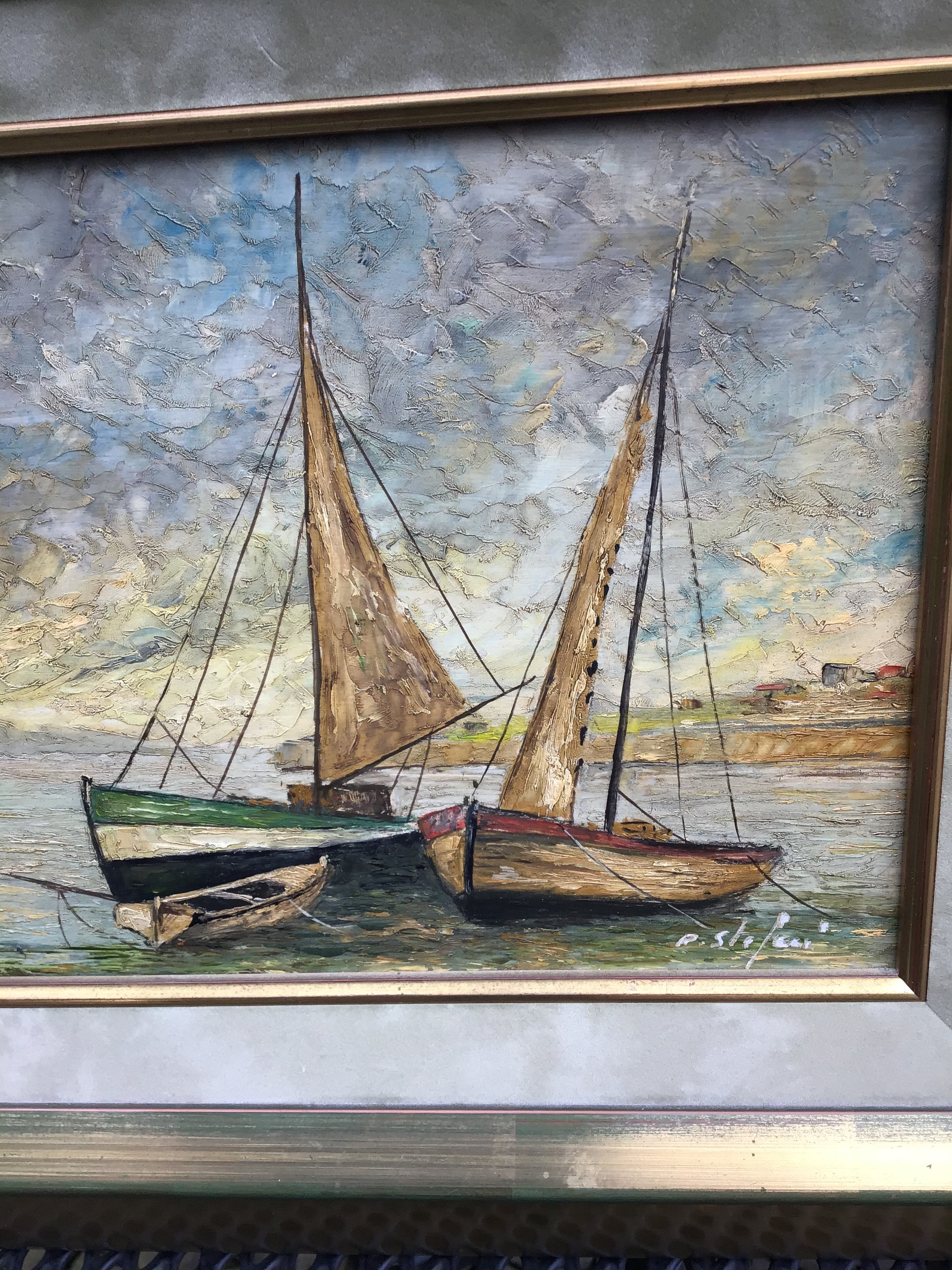 Fraai werk van Pierre Stefanie. Bootjes nabij de kust van Etretat. In goudkleurige lijst.