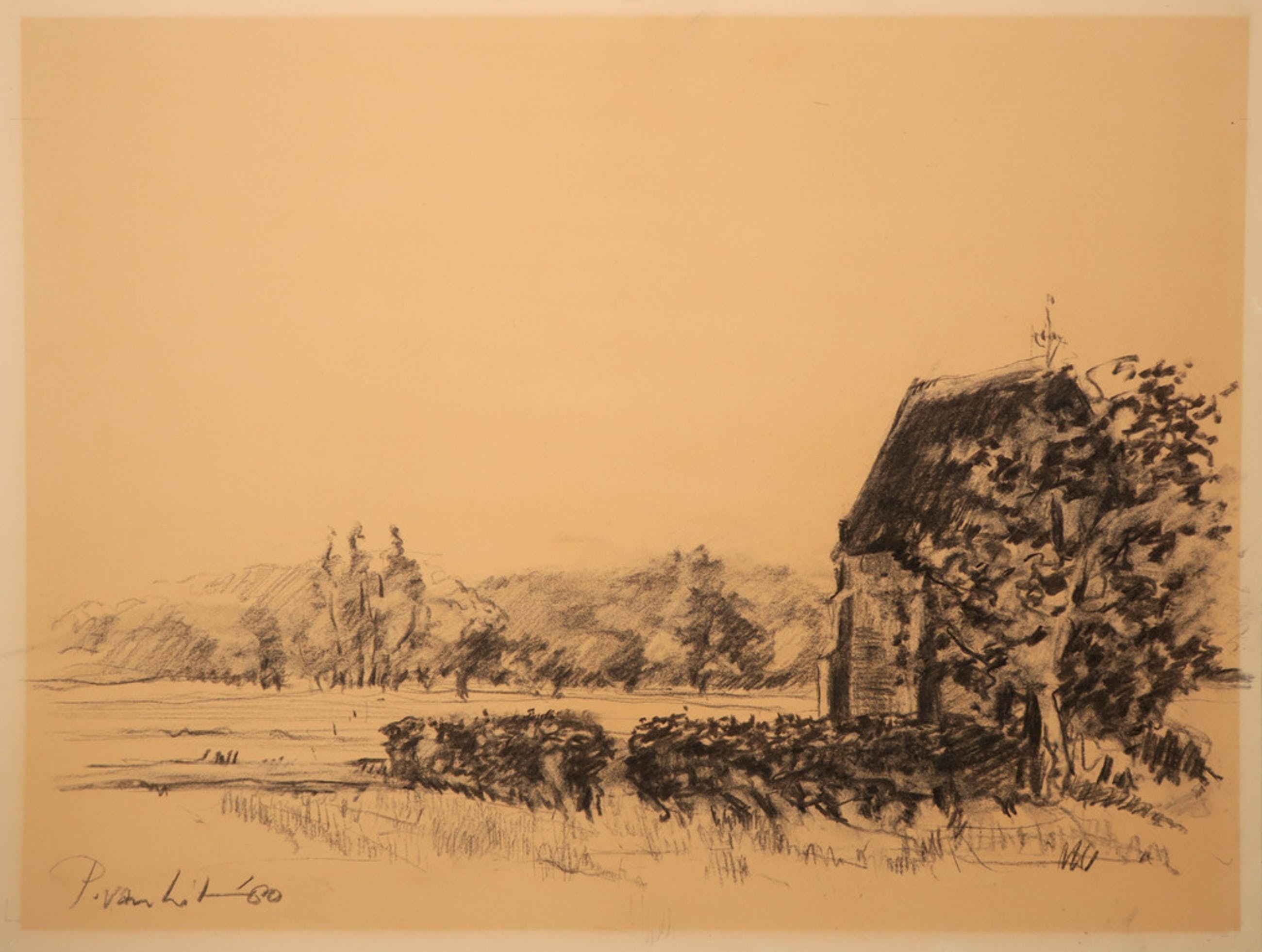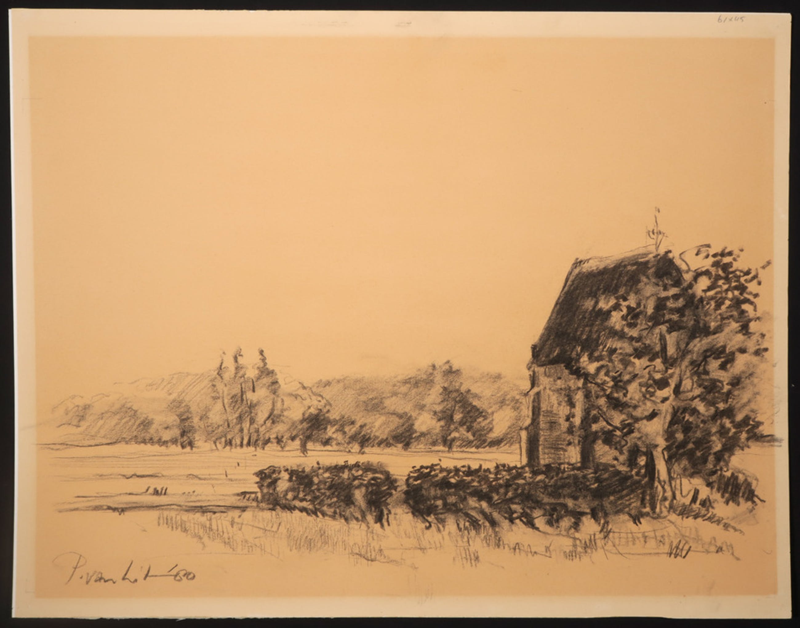 Materiaal: Houtskooltekening op papier, bevestigd op onderblad.
