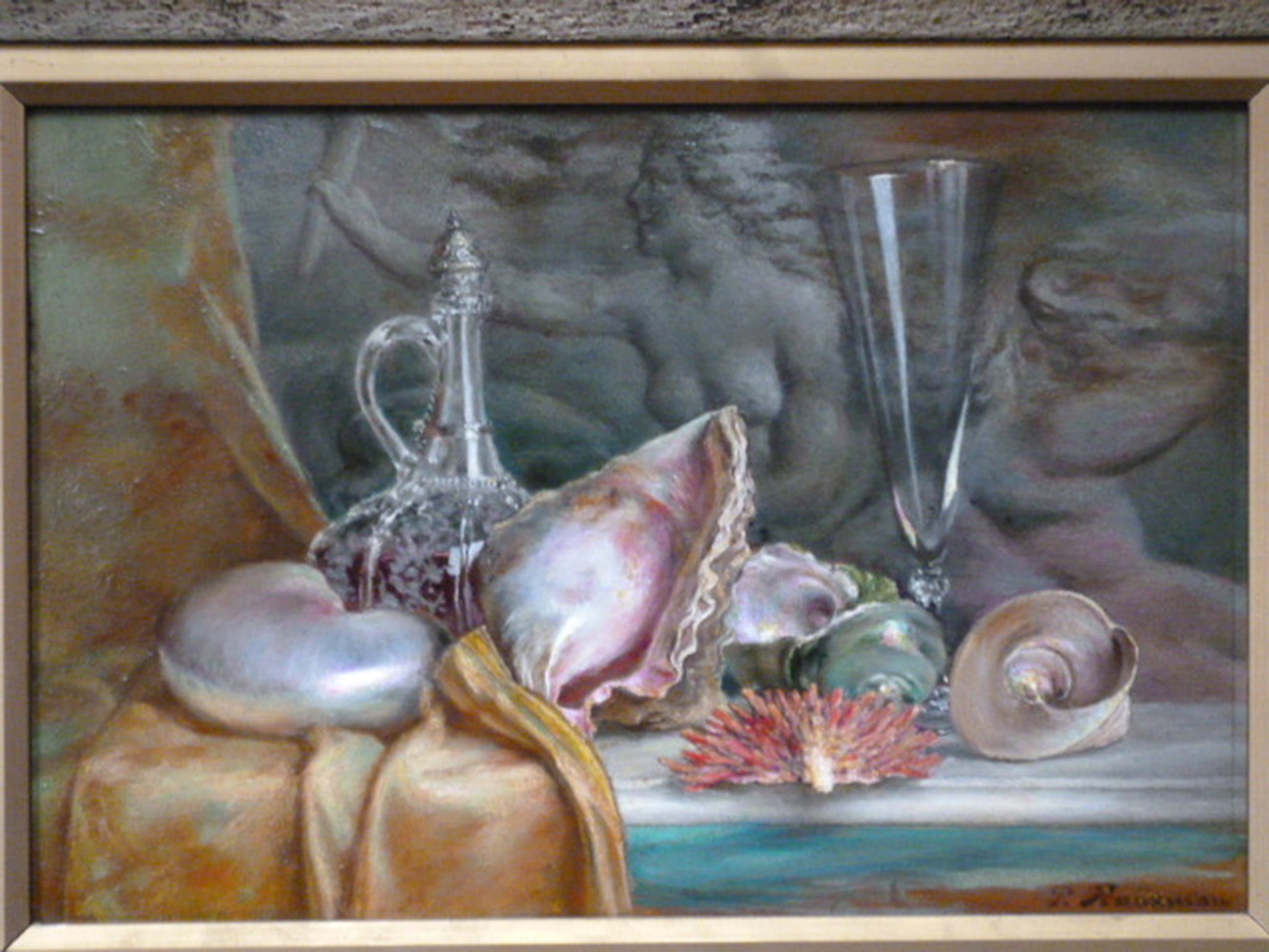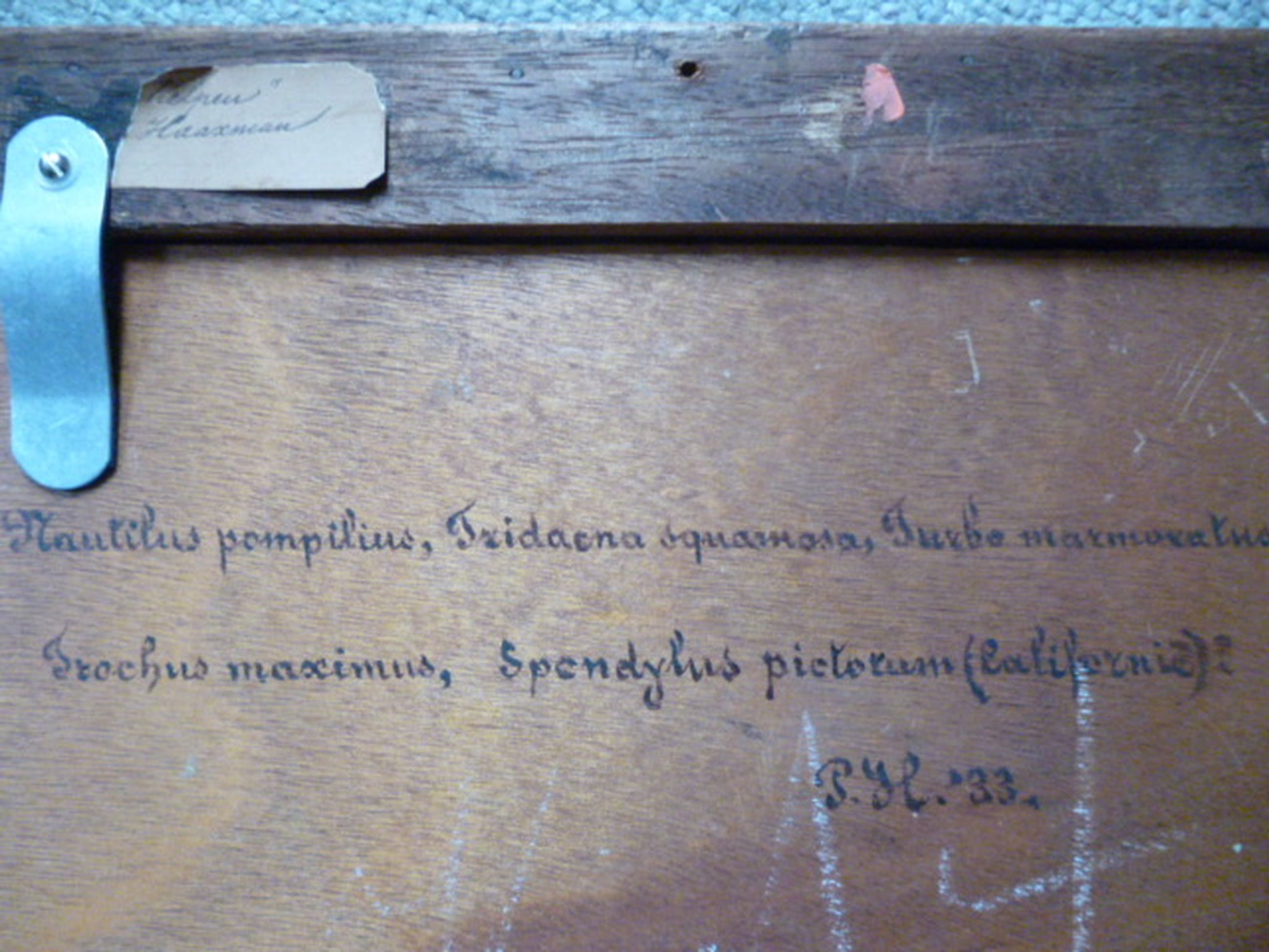 Knap geschilderd olieverf op triplexpaneel uit 1933 voorstellende een stilleven met o.a. een nautilusschelp.