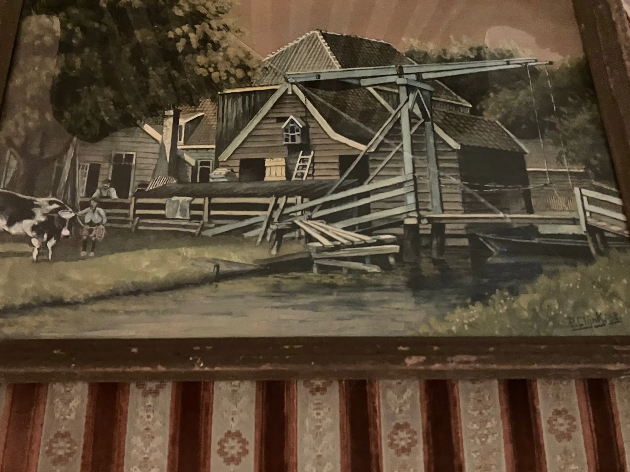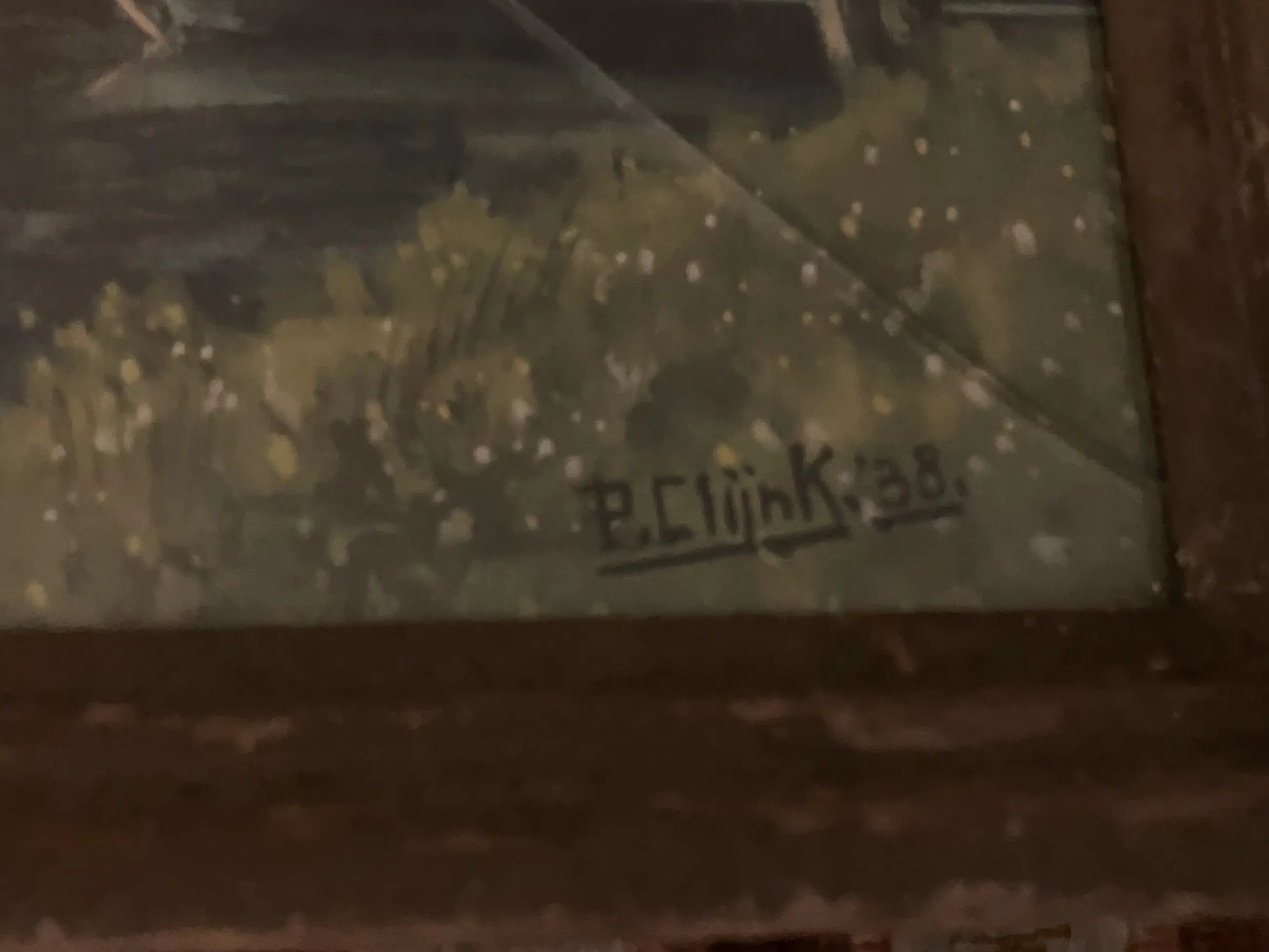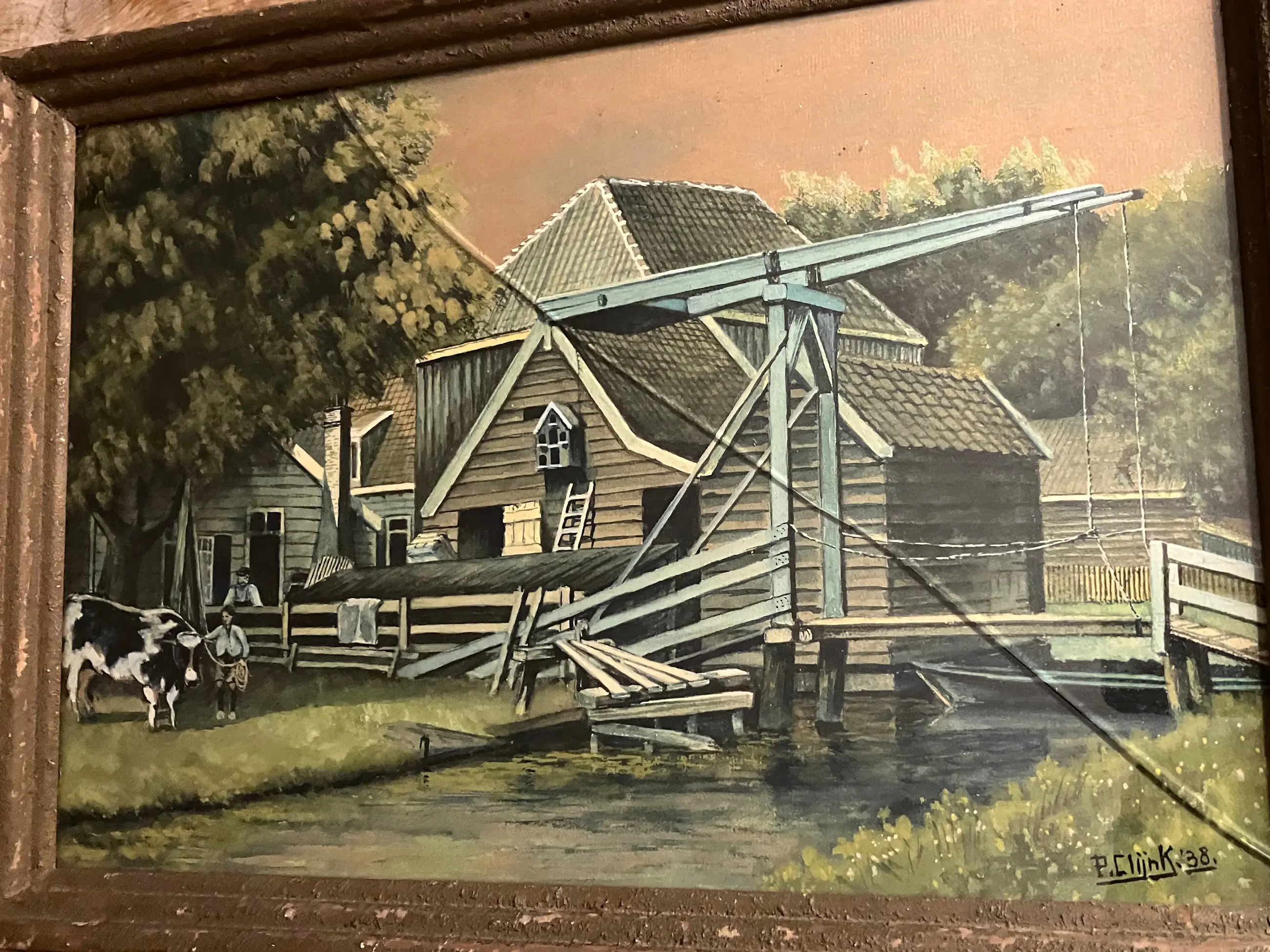 Leuk schilderij uit 1938 oogt netjes van Piet Clijnk (1898 - 1967) bekend om zijn karakteristieke Hollandse landschappen. Mooie boerderij met een ophaalbrug aan het water. Helaas de lijst is in slechte staat met een gebroken glasplaat.