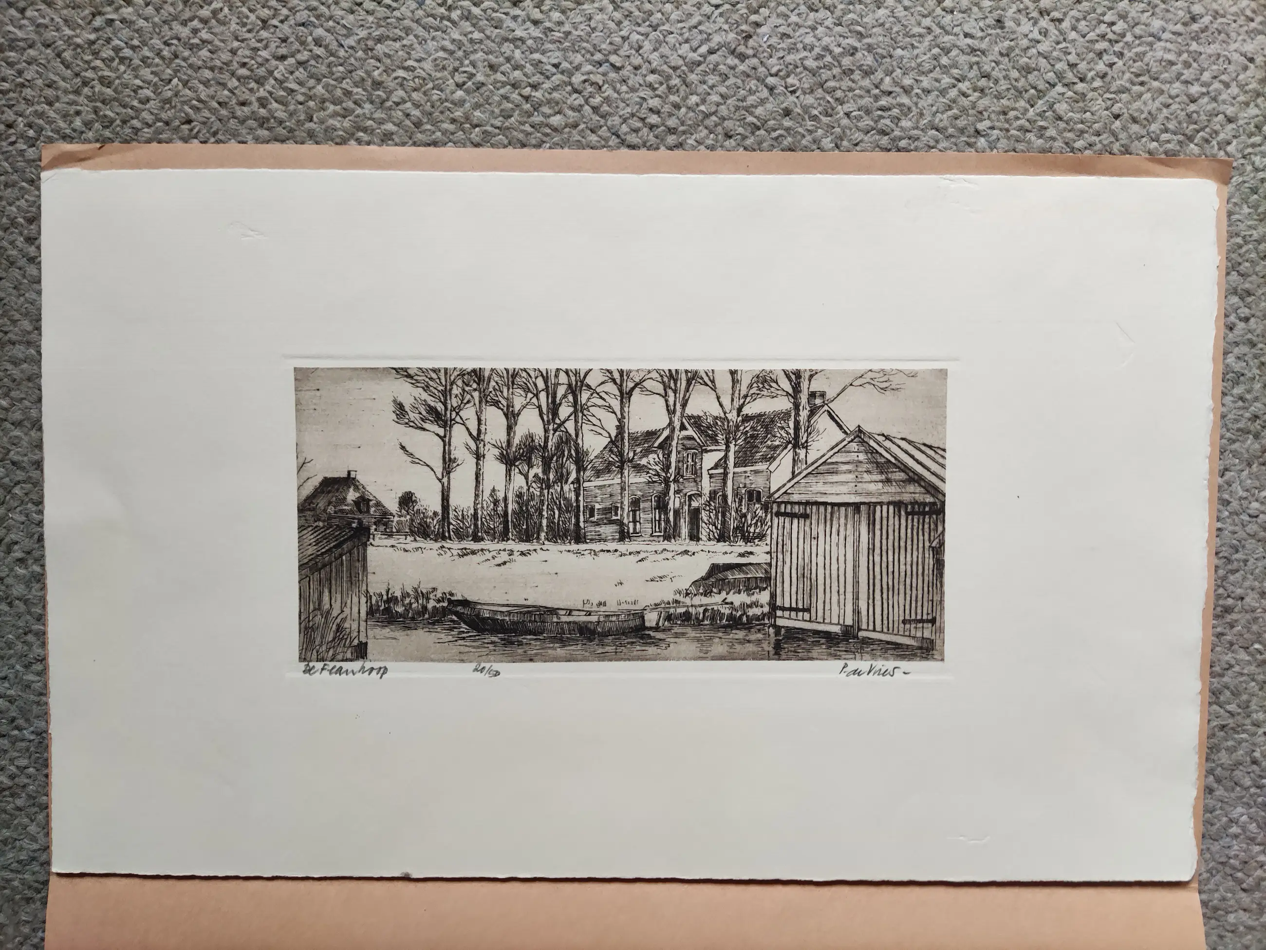 De etser De Vries was bijzonder productief. Van zijn hand hebben honderden verschillende etsen hun weg gevonden naar even zo vele huiskamers. In voornamelijk het Noorden van het land, maar als herinnering aan Friesland vonden zijn etsen ook afname in de rest van het land en zelfs in het buitenland. Het gaat voornamelijk om Friese landschappen, bekende dorpen en markante gebouwen.