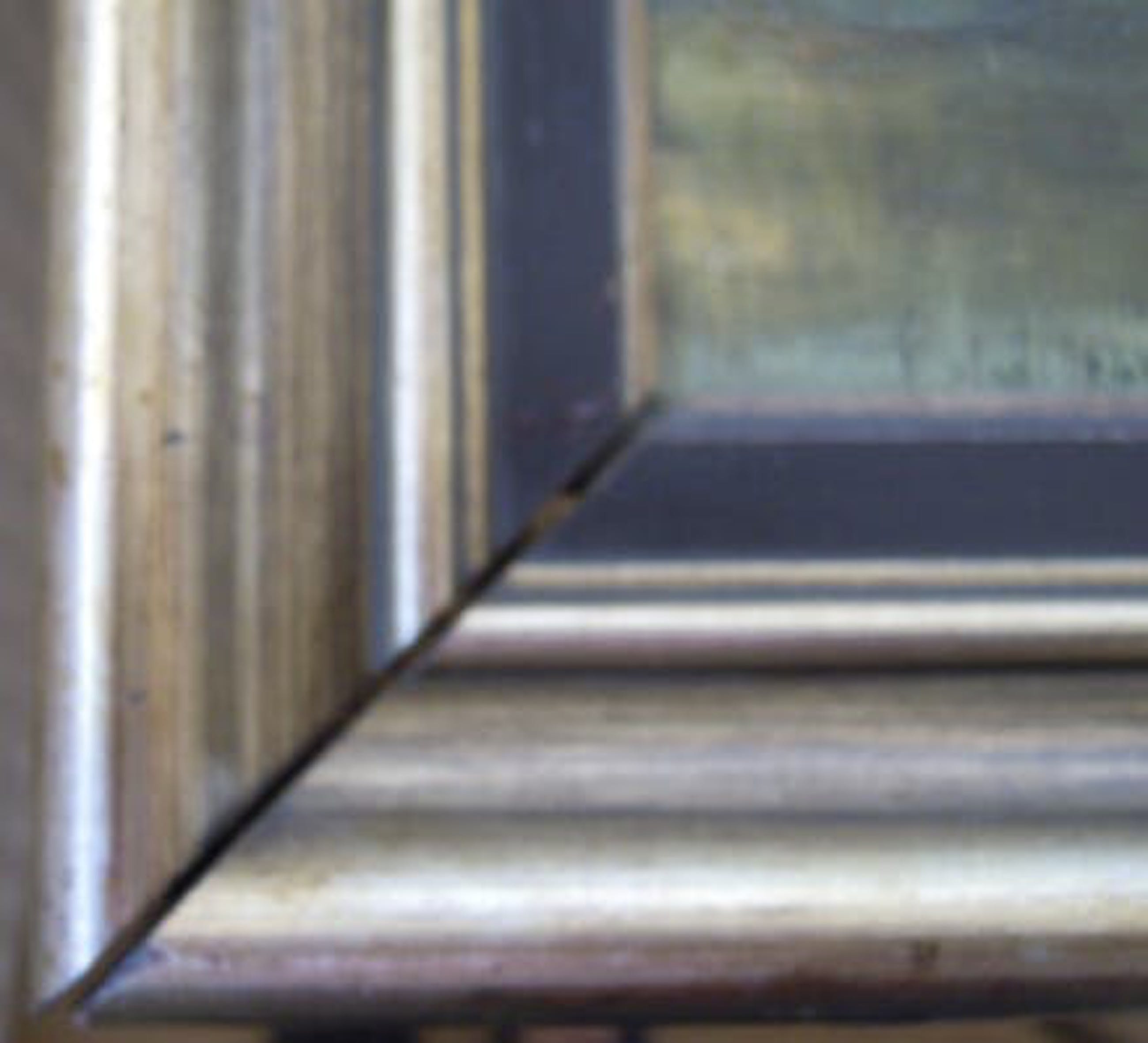 Zit in de originele oude lijst - die aan de onderkant een beschadiging heeft maar als het schilderij hangt is dit niet zichtbaar - zie foto. Ook moet 1 hoekje worden gelijmd of gerestaureerd omdat dit los is. - zie foto.