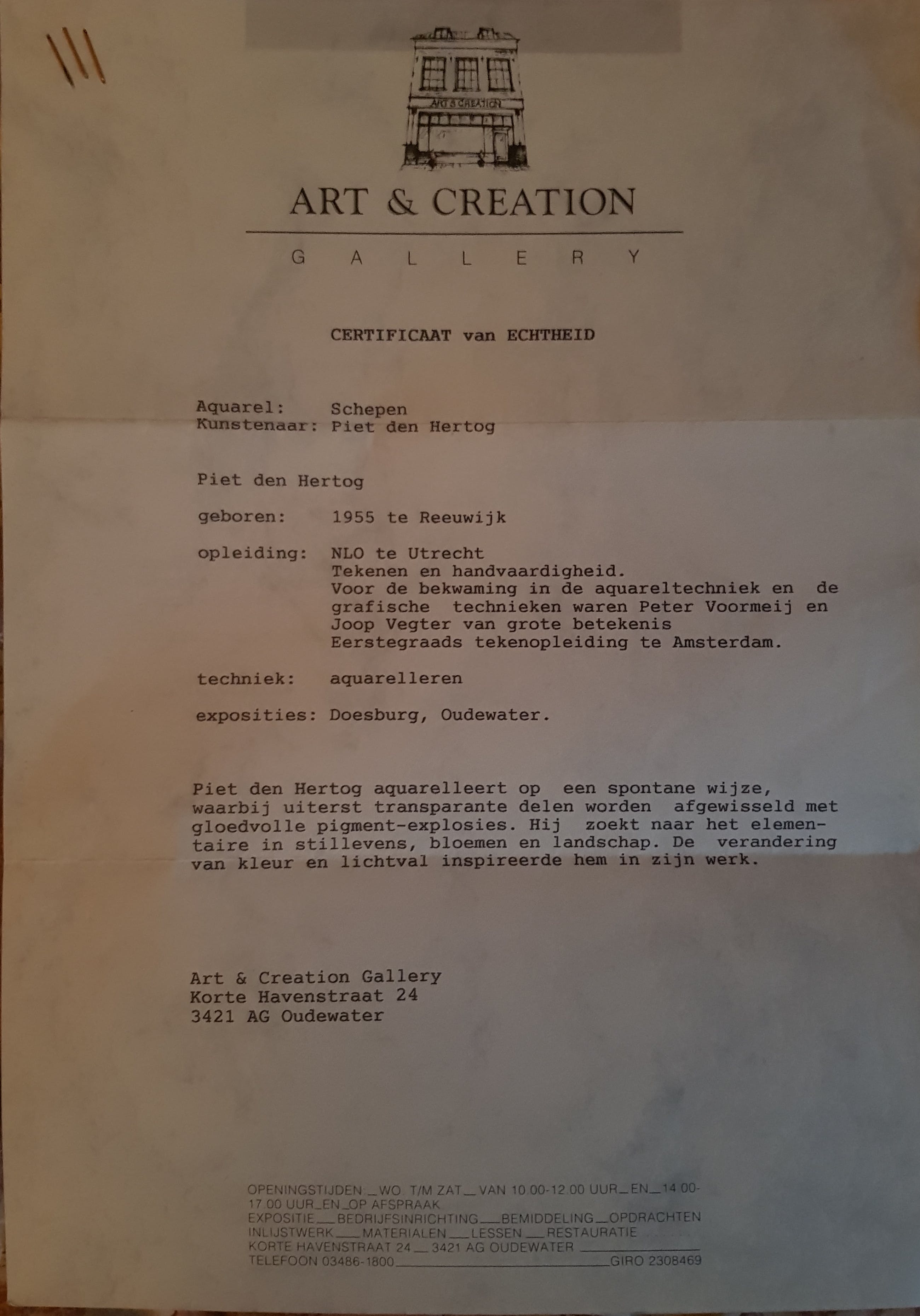 Certificaat van Echtheid Piet den Hertog geboren 1955 te Reeuwijk De verandering van kleur en lichtval inspireerde hem in zijn werk.