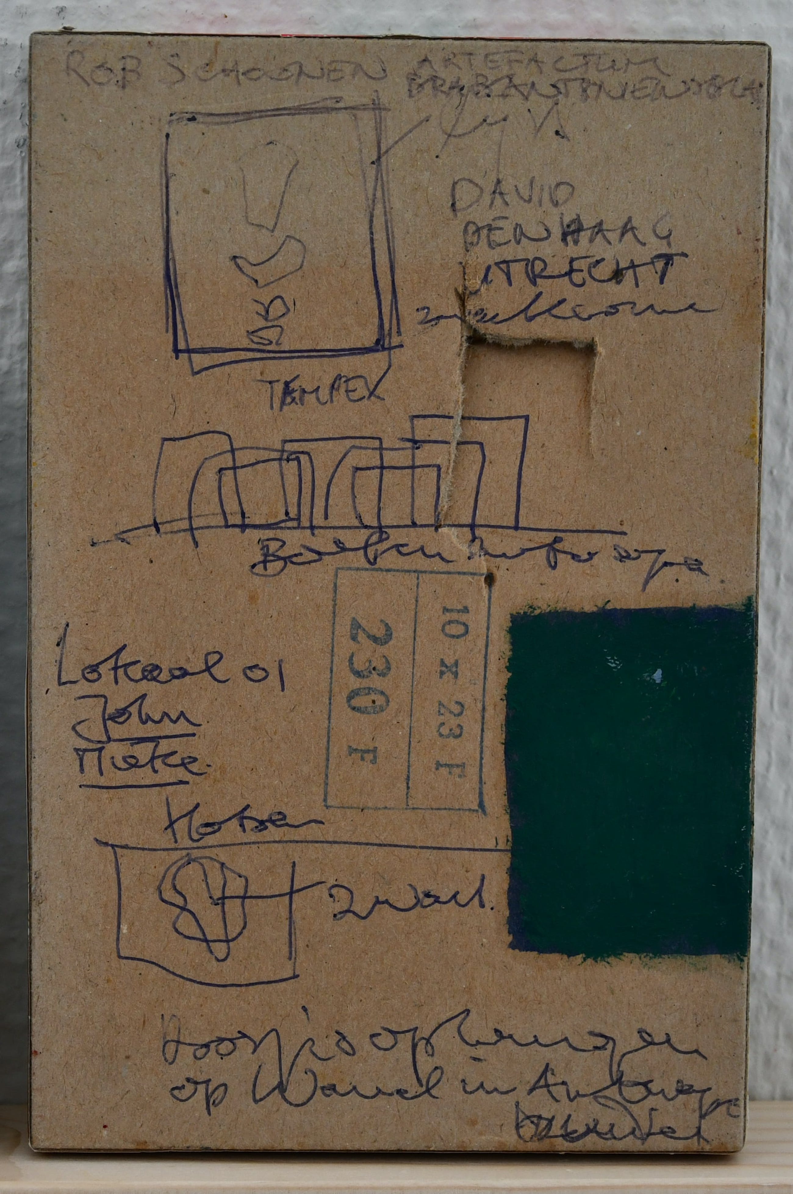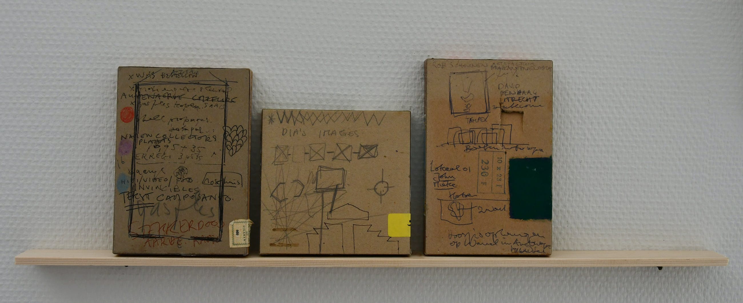 1995 heeft gemaakt. Kunstenaar: Piet Dirkx titel: Drie doosjes op lat techniek : gemengde techniek conditie : nm+ jaar; 1995 voor de installatie en ca. 1987 voor het ontstaan van de doosjes