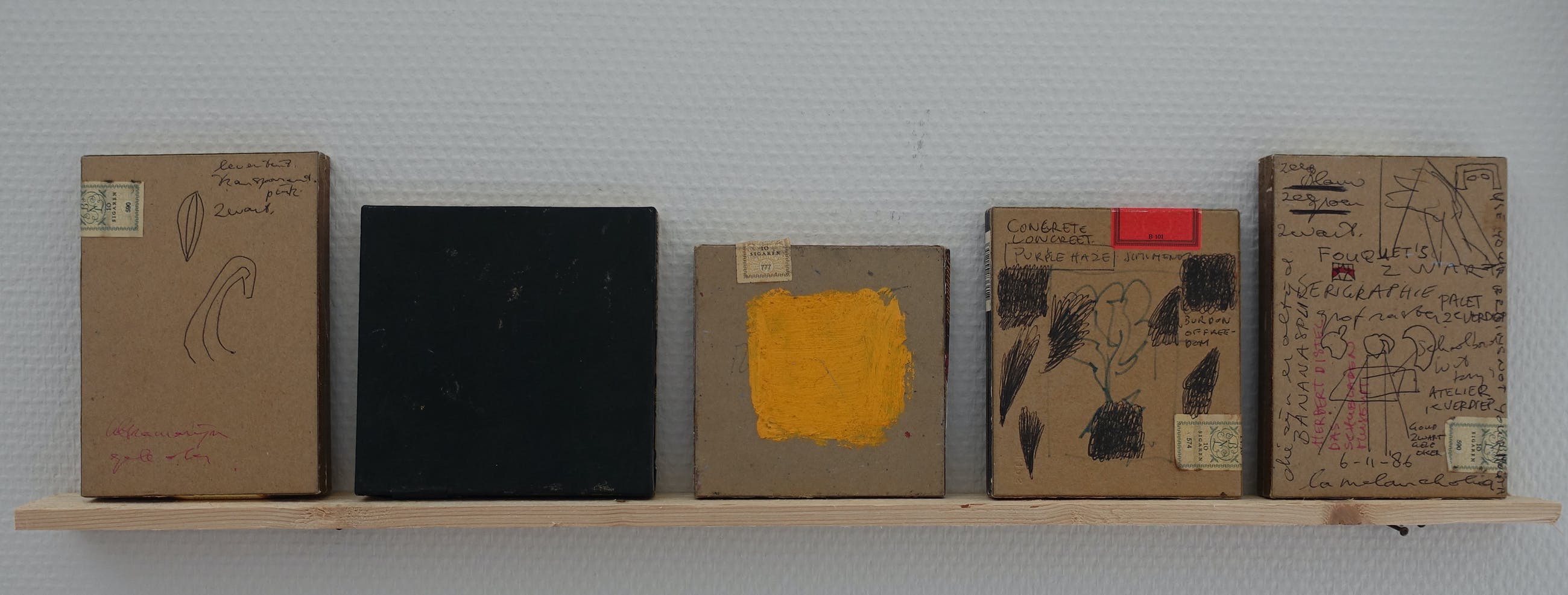 Deze vijf doosjes zijn een onderdeel geweest van de BIOTOOP installatie die Piet Dirkx in de projectenzaal van het Gemeentemuseum Den Haag in 1995 heeft gemaakt. Kunstenaar: Piet Dirkx titel: vijf doosjes op lat techniek : gemengde techniek conditie : nm+ jaar; 1995 voor de installatie en ca. 1986 voor het ontstaan van de doosjes