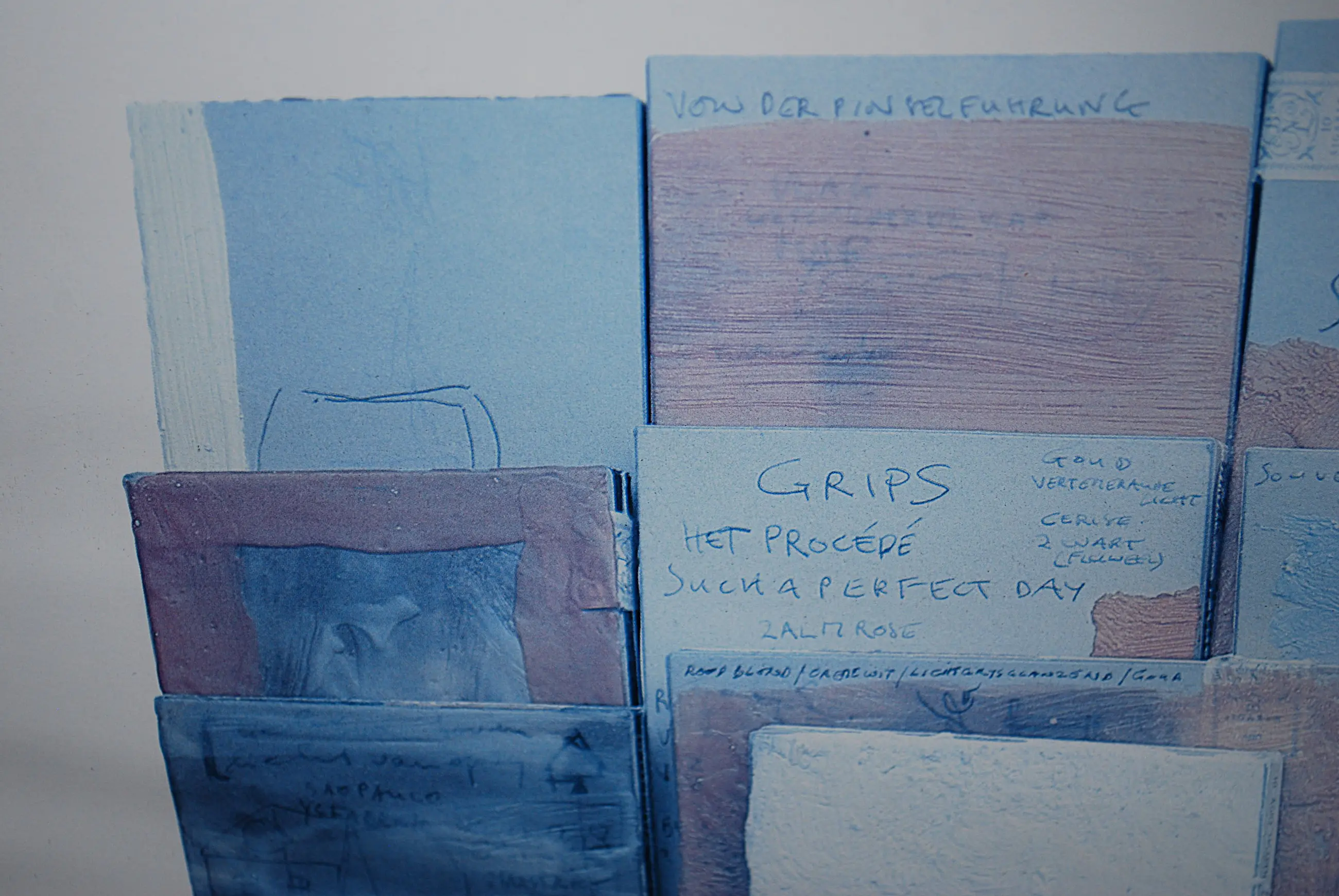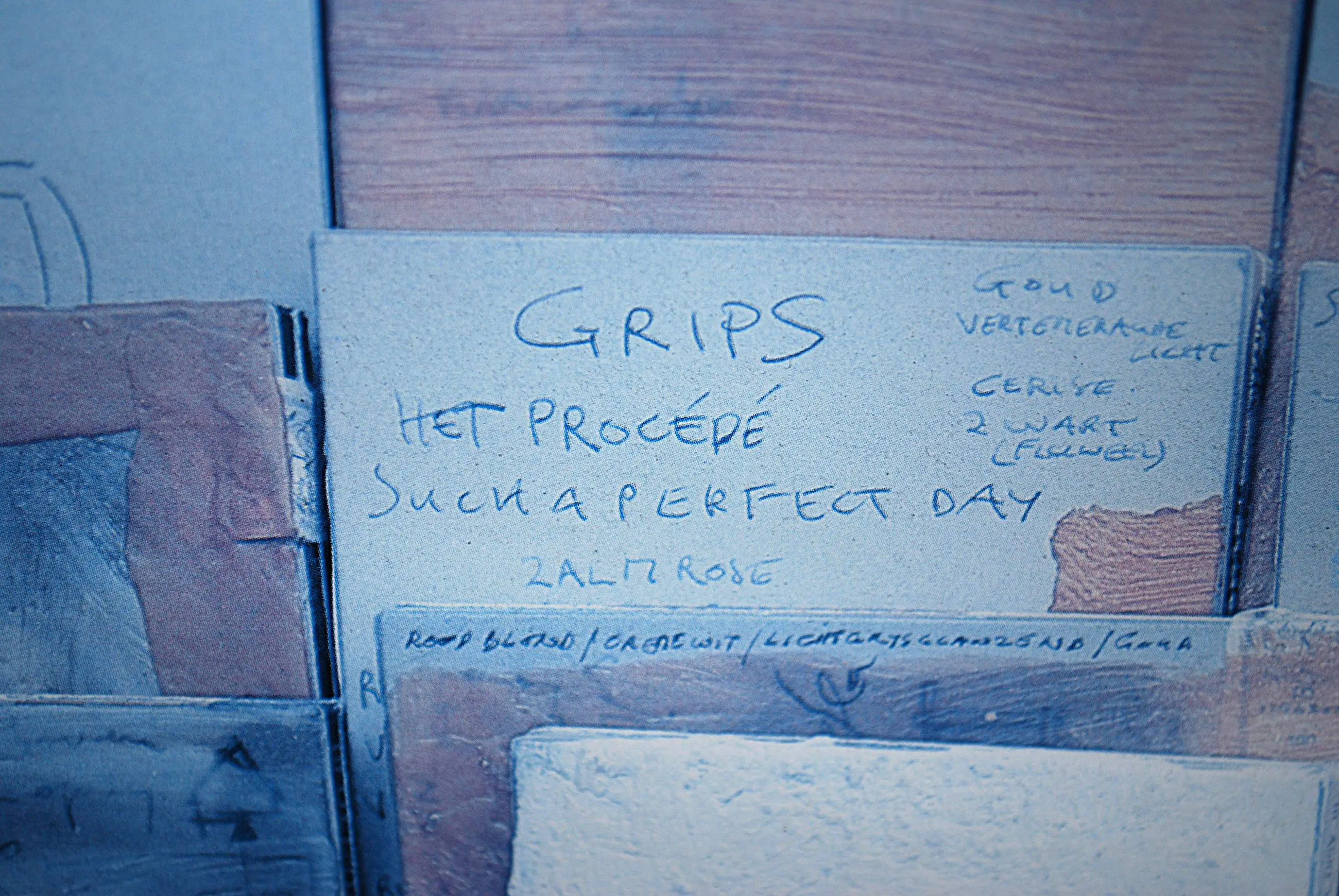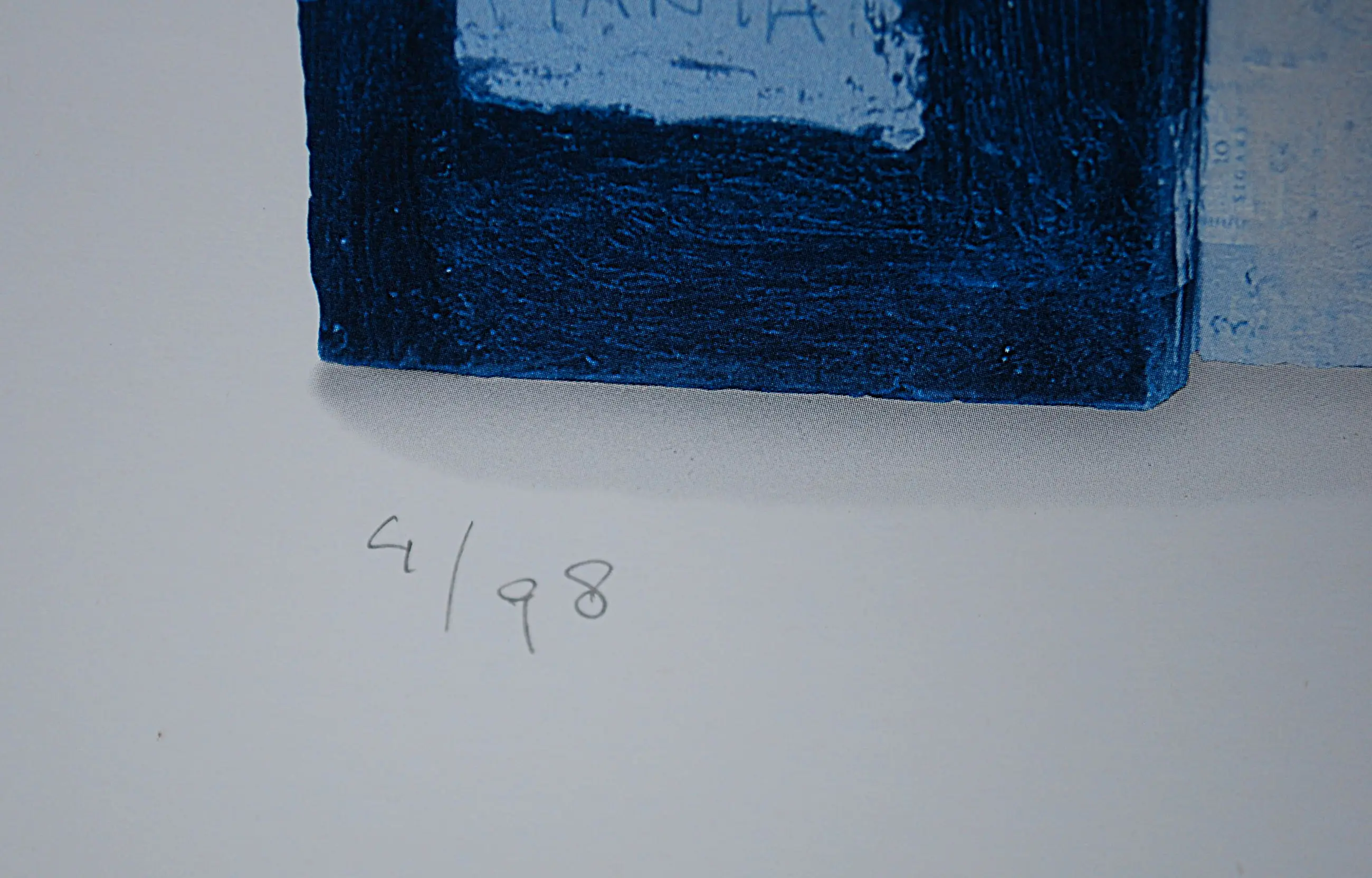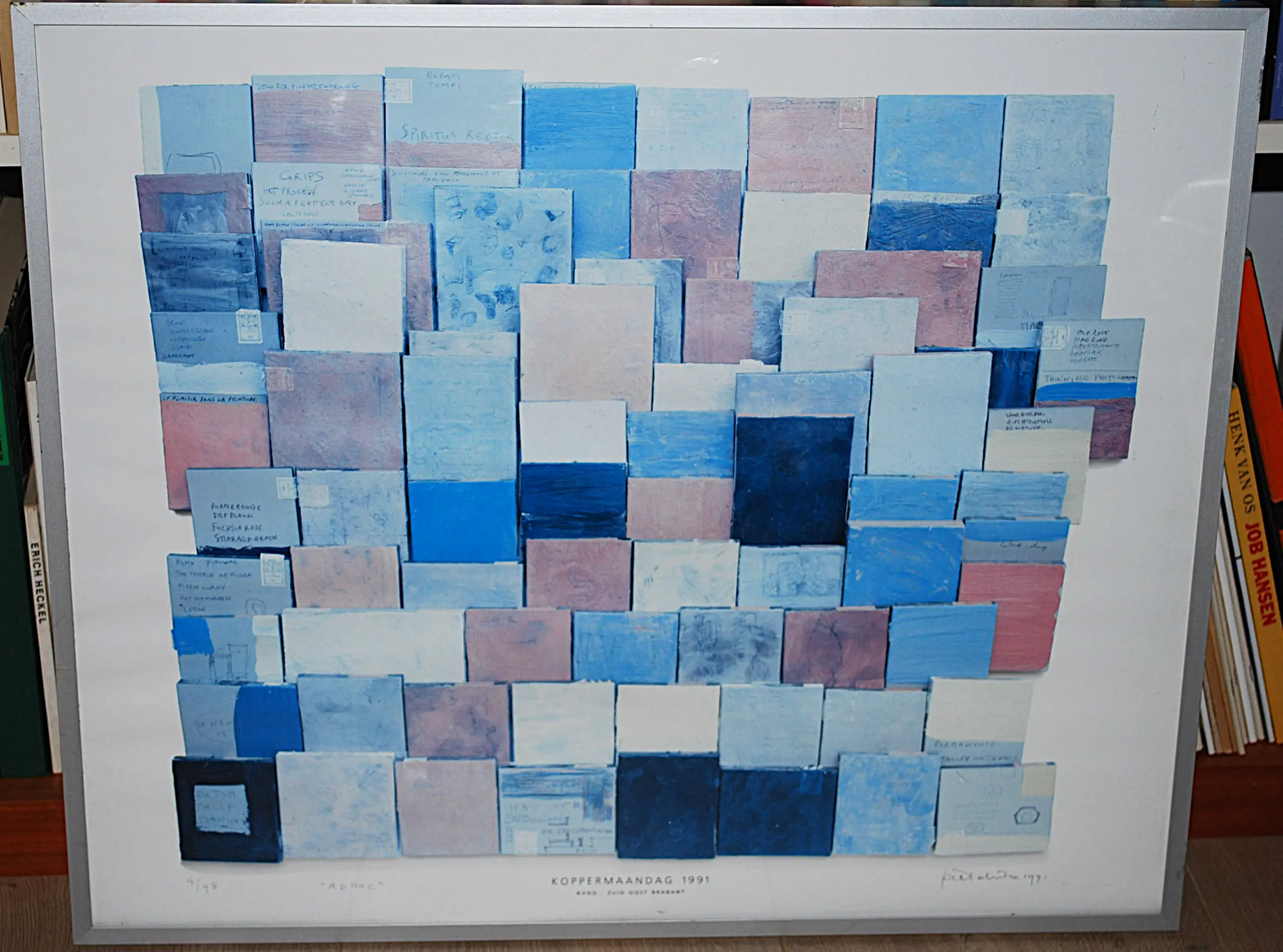 Los blad, 50x60 cm, geplaatst achter glas, in een alu lijst. Achterop de lijst is een verklaring van dit werk, zie foto. Let op: