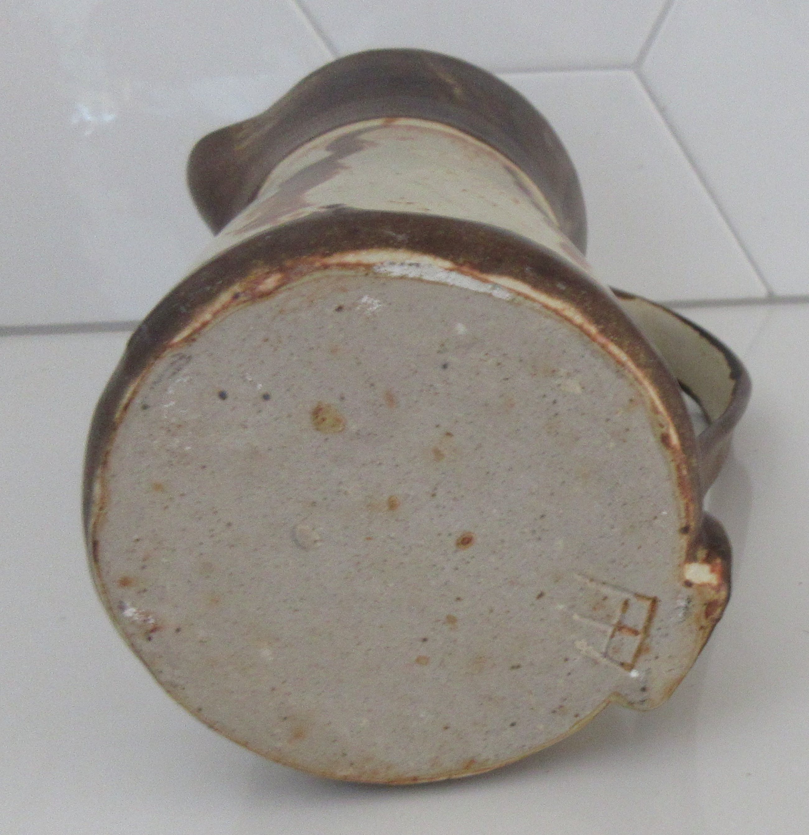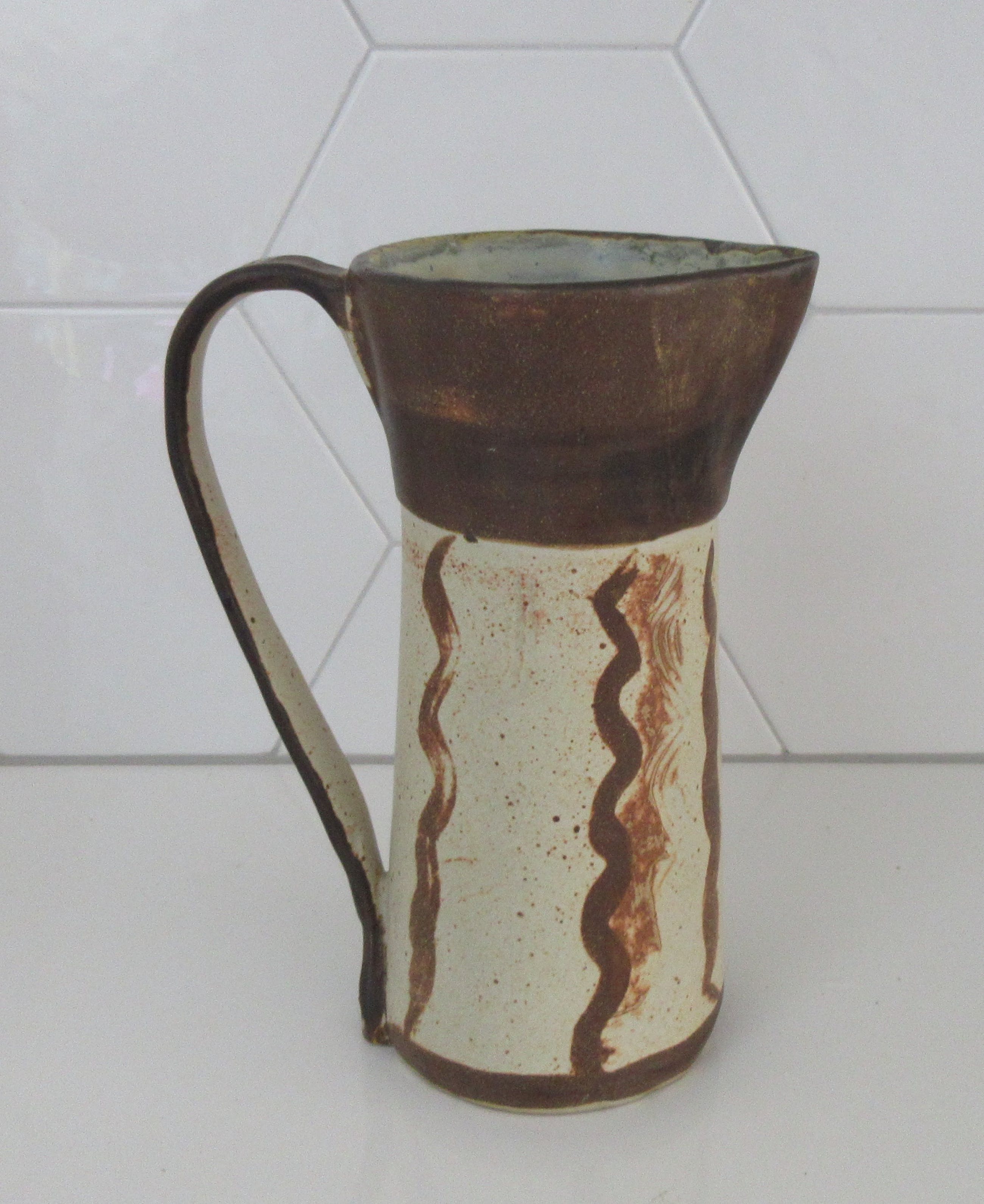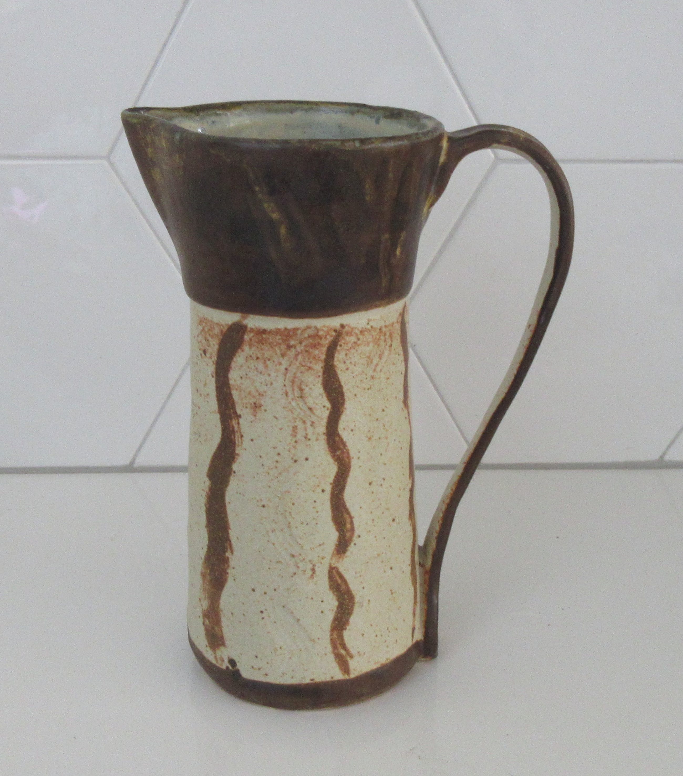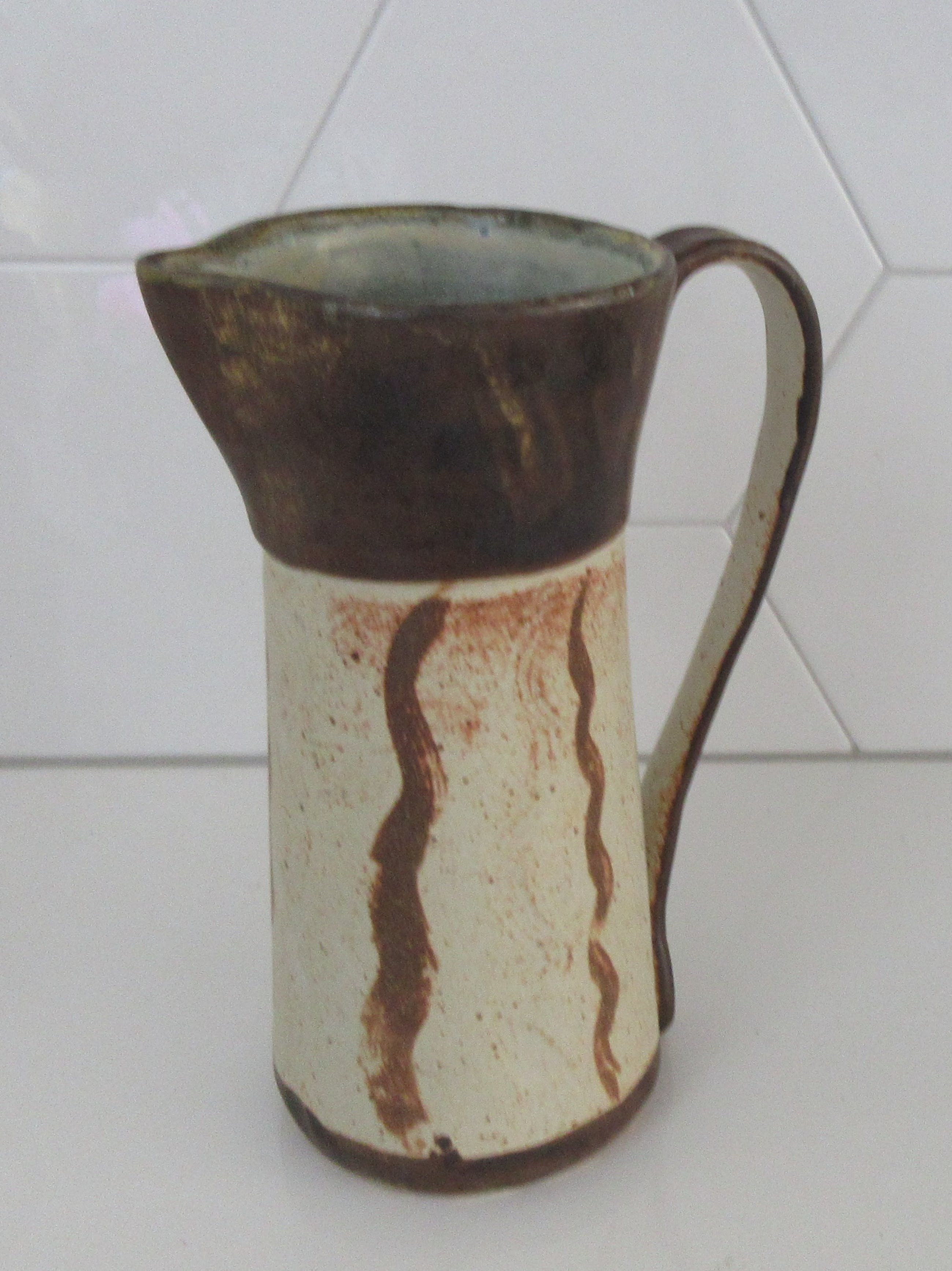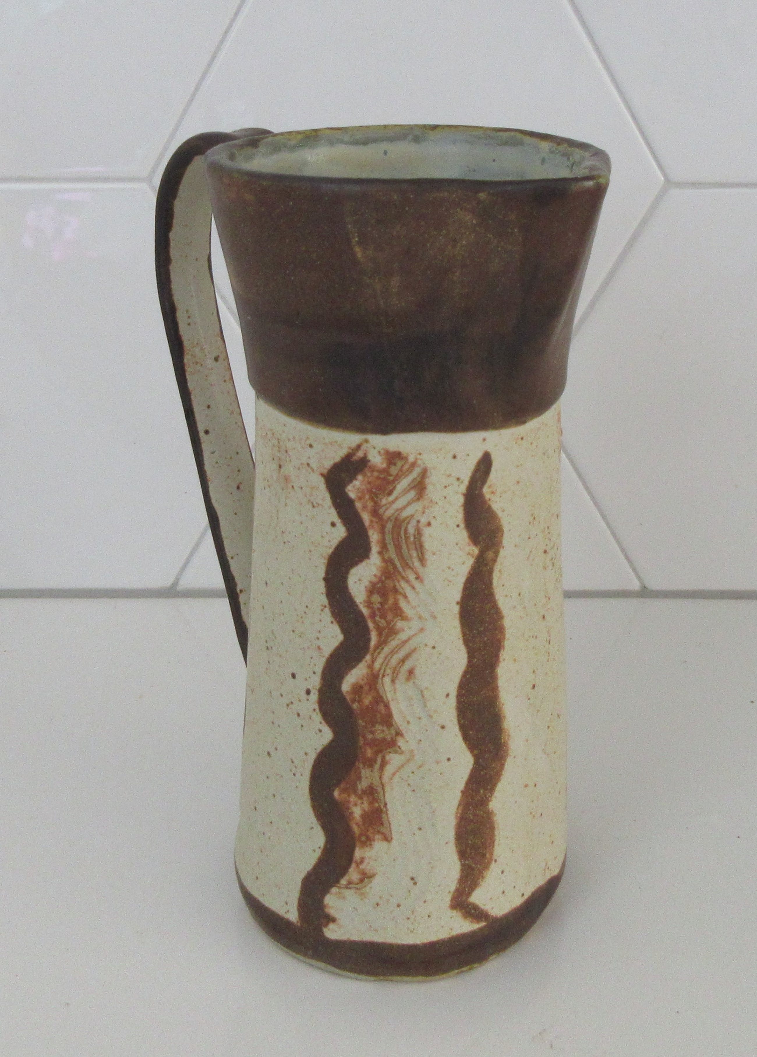 Studio Keramische Kan gemaakt door keramist Piet Ellens in zijn eigen atelier in Otterlo. Voorzien van van sgraffito techniek en decor en gemonogrammeerd aan de onderzijde. Afmetingen; 22 cm hoog, 15 cm breed (oor) en 9 cm diep.