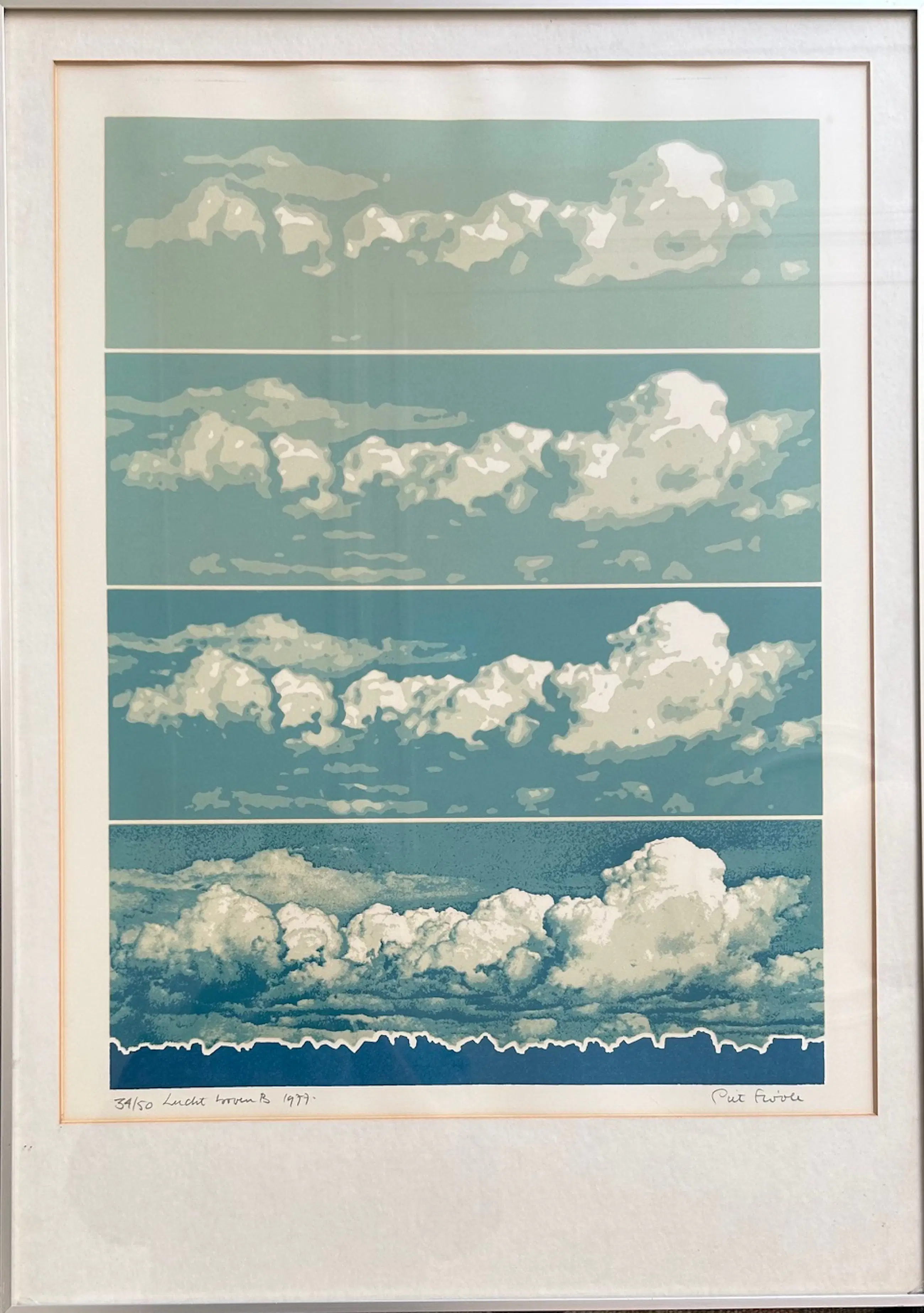 Prachtige zeefdruk van Piet Fioole uit 1977. Genummerd en gesigneerd in potlood. In metalen lijst, houten onderplaat en zwaar glas.