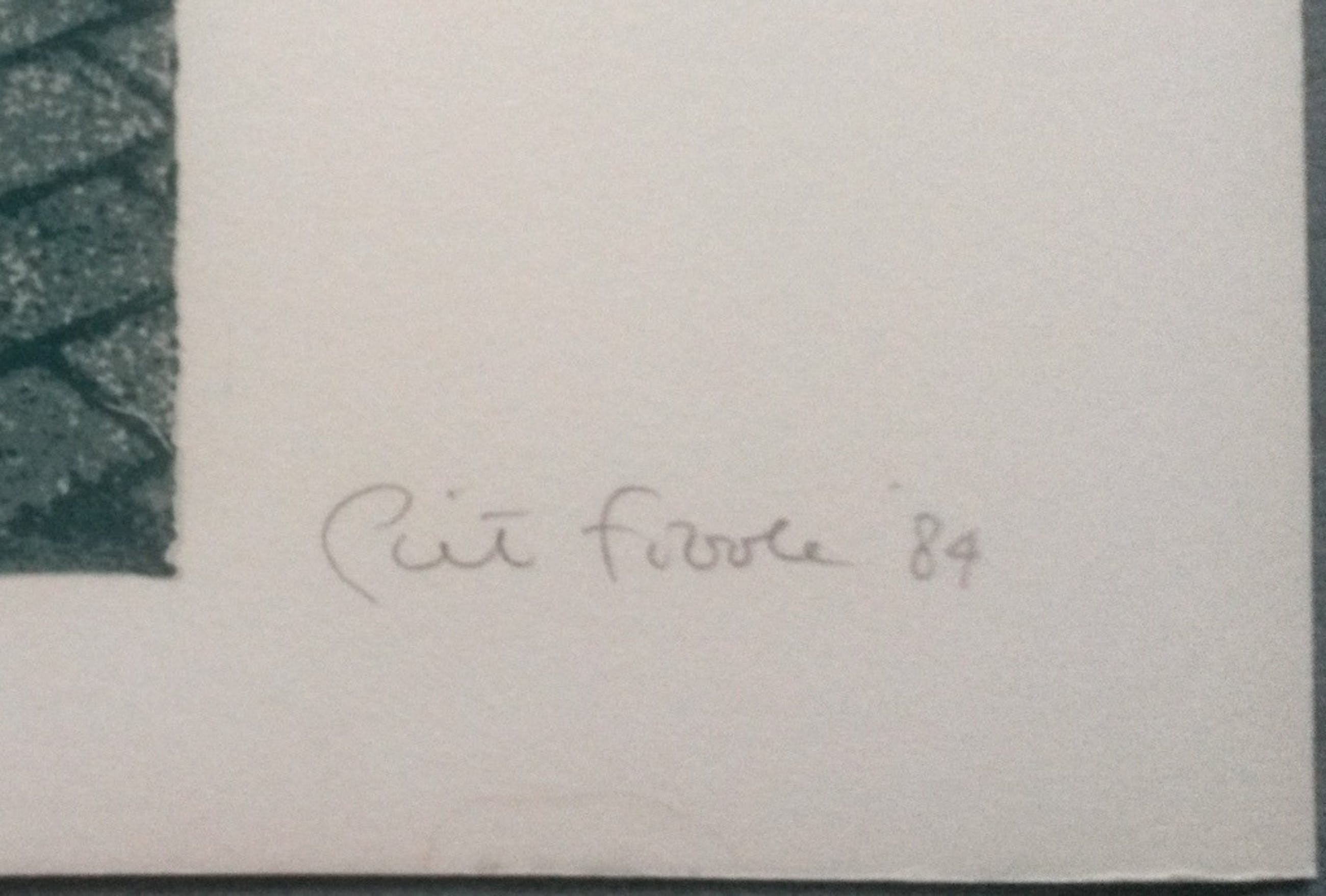 Zeefdruk van Piet Fioole uit 1984, getiteld Oost noord oost. Het werk is met potlood gesigneerd, voorzien van titel, jaartal en oplage (25/30). De zeefdruk is op zwaar papier afgedrukt. Het blad is 50 x 65 cm, de afbeelding 44,5 x 56 cm. Het werk is in prima conditie, een kleine vochtvlek in de marge bij de signatuur (zie foto).