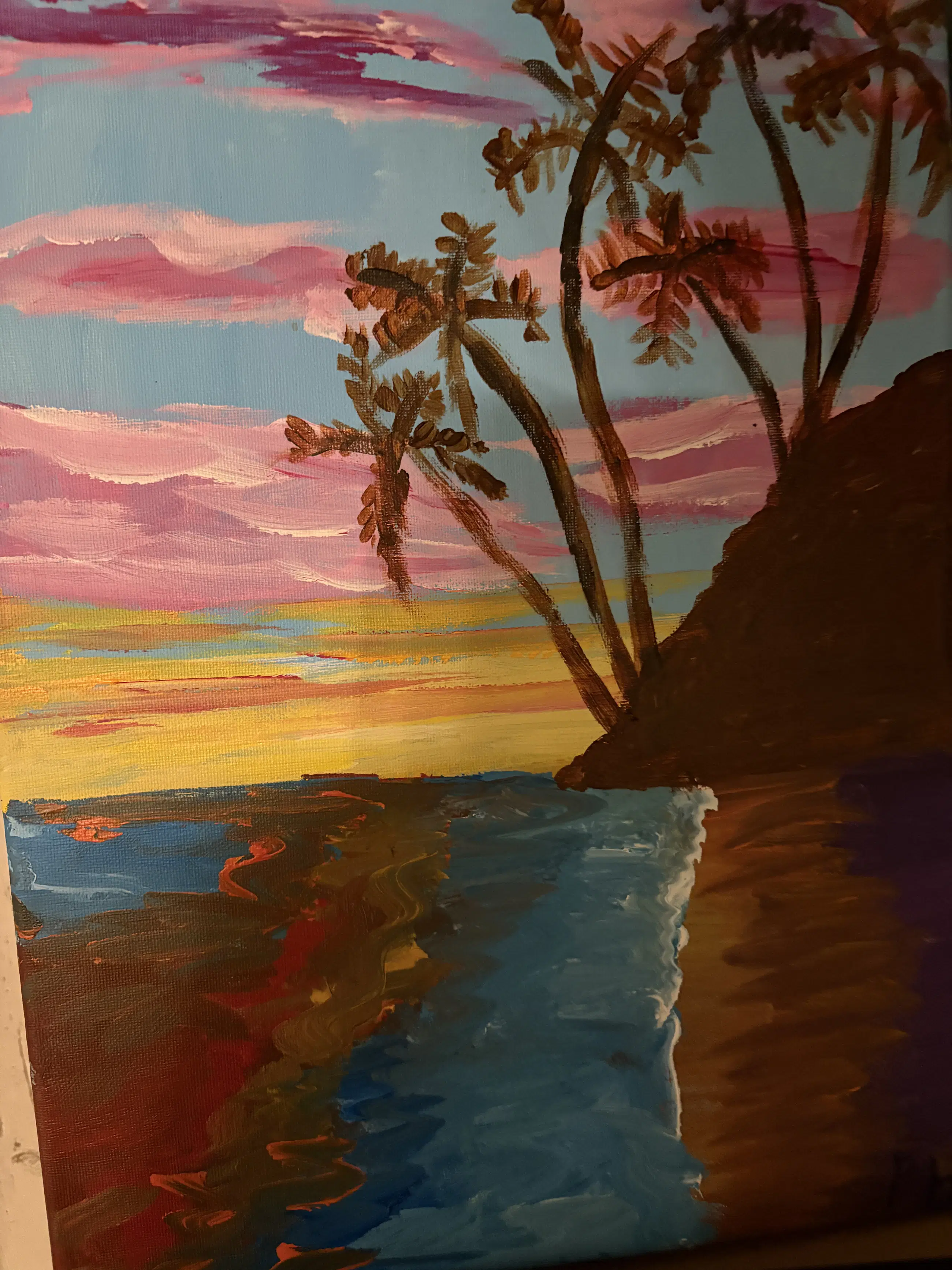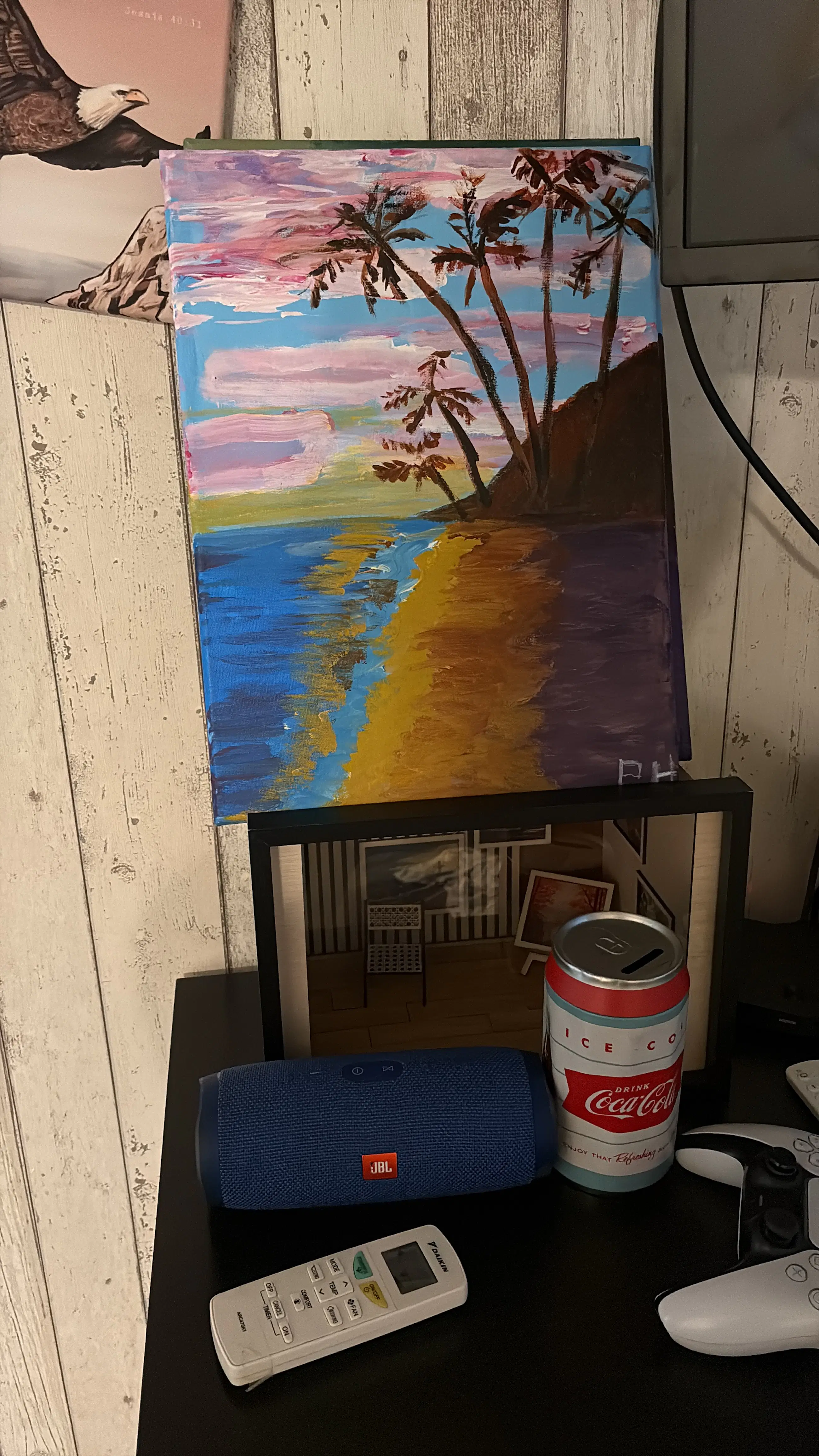 Prachtig schilderij met een kleurrijk tafereel van bloemen, zee en palmbomen. Het doek is speciaal ingespoten zodat het ook buiten opgehangen kan worden, maar staat binnen net zo mooi. Perfect voor tuin, veranda, woonkamer of kantoor.