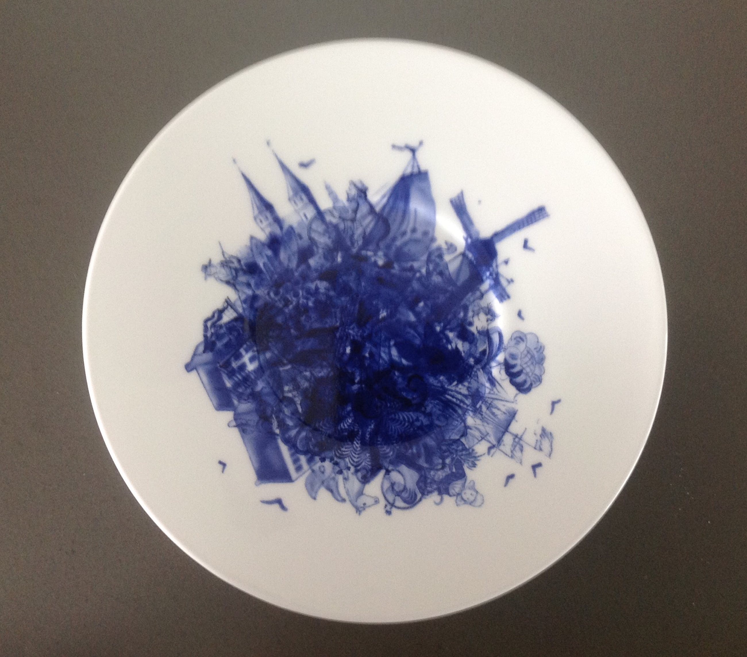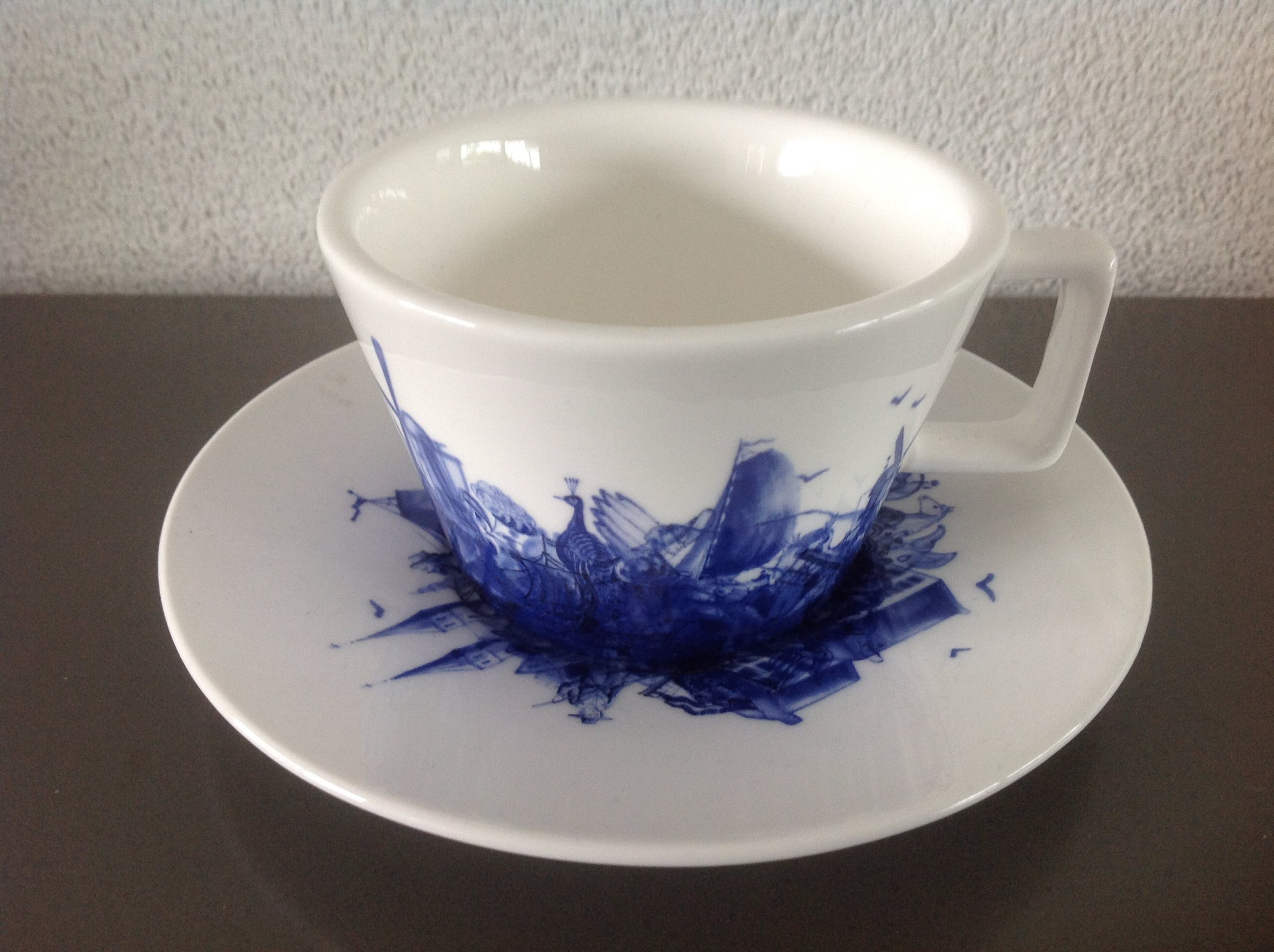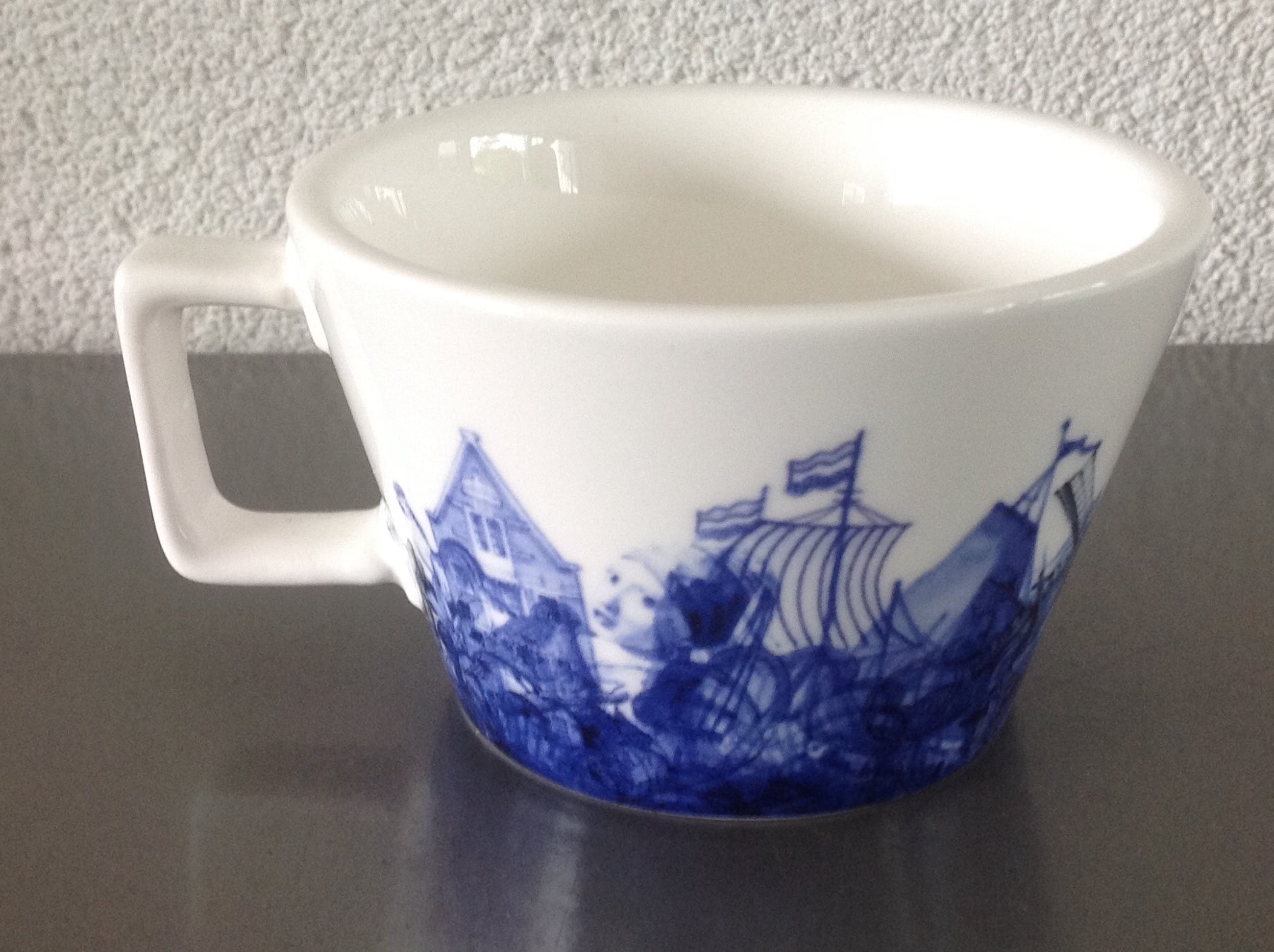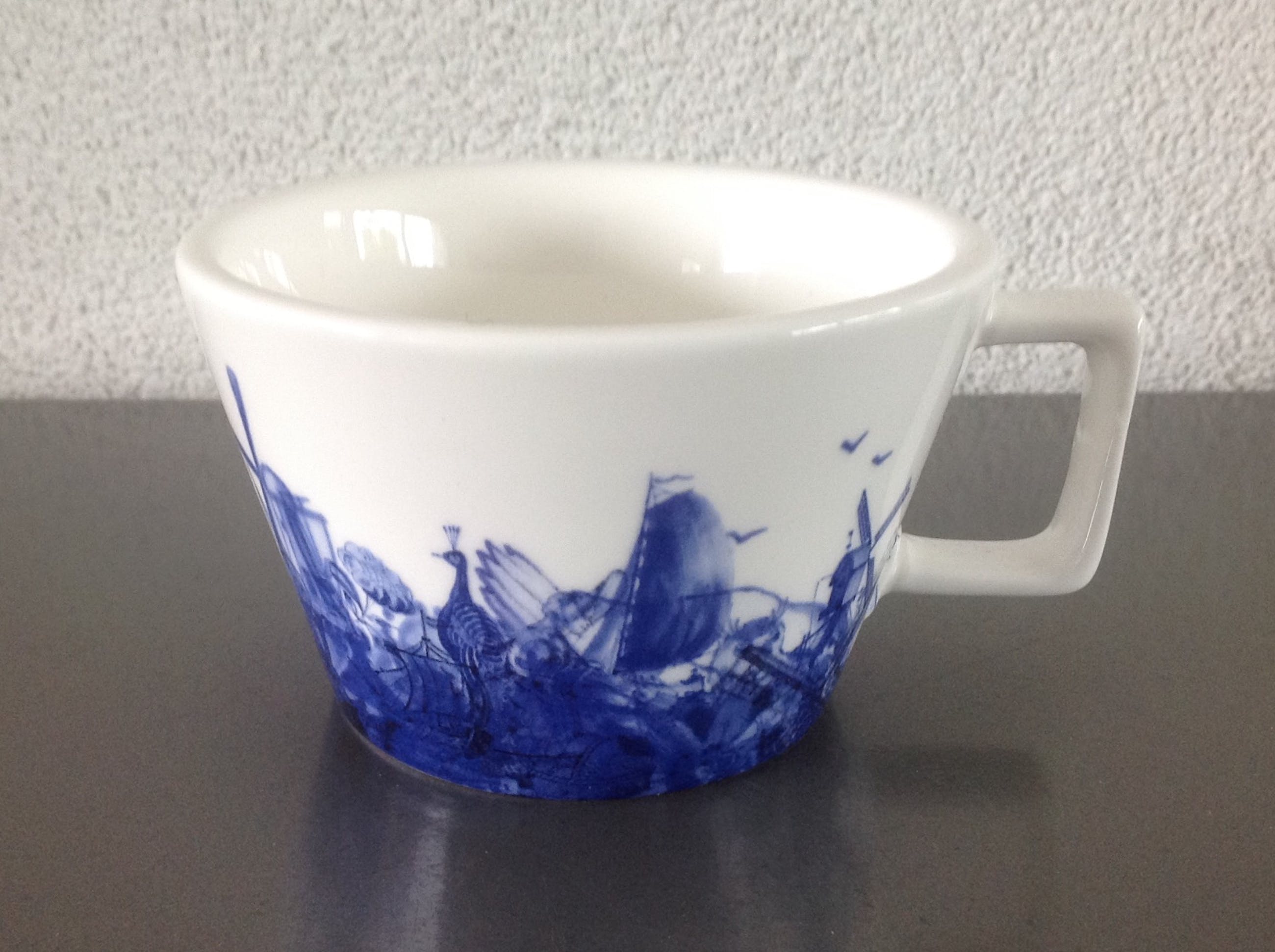 De kop en schotel van Piet Hein Eek heeft een boeiend oudhollands Delfts blauw motief.De bus "Ik hou van tijdschriften" heeft een tulpenmotief uit het wek van Jan Cremer uit 1996.