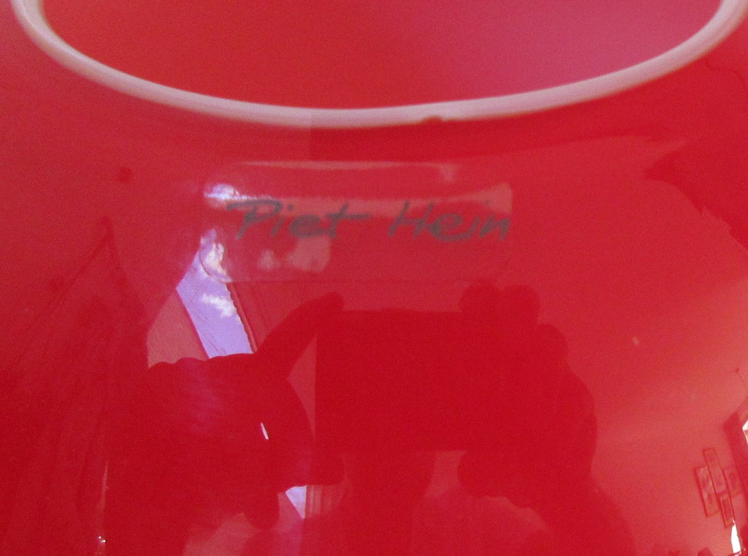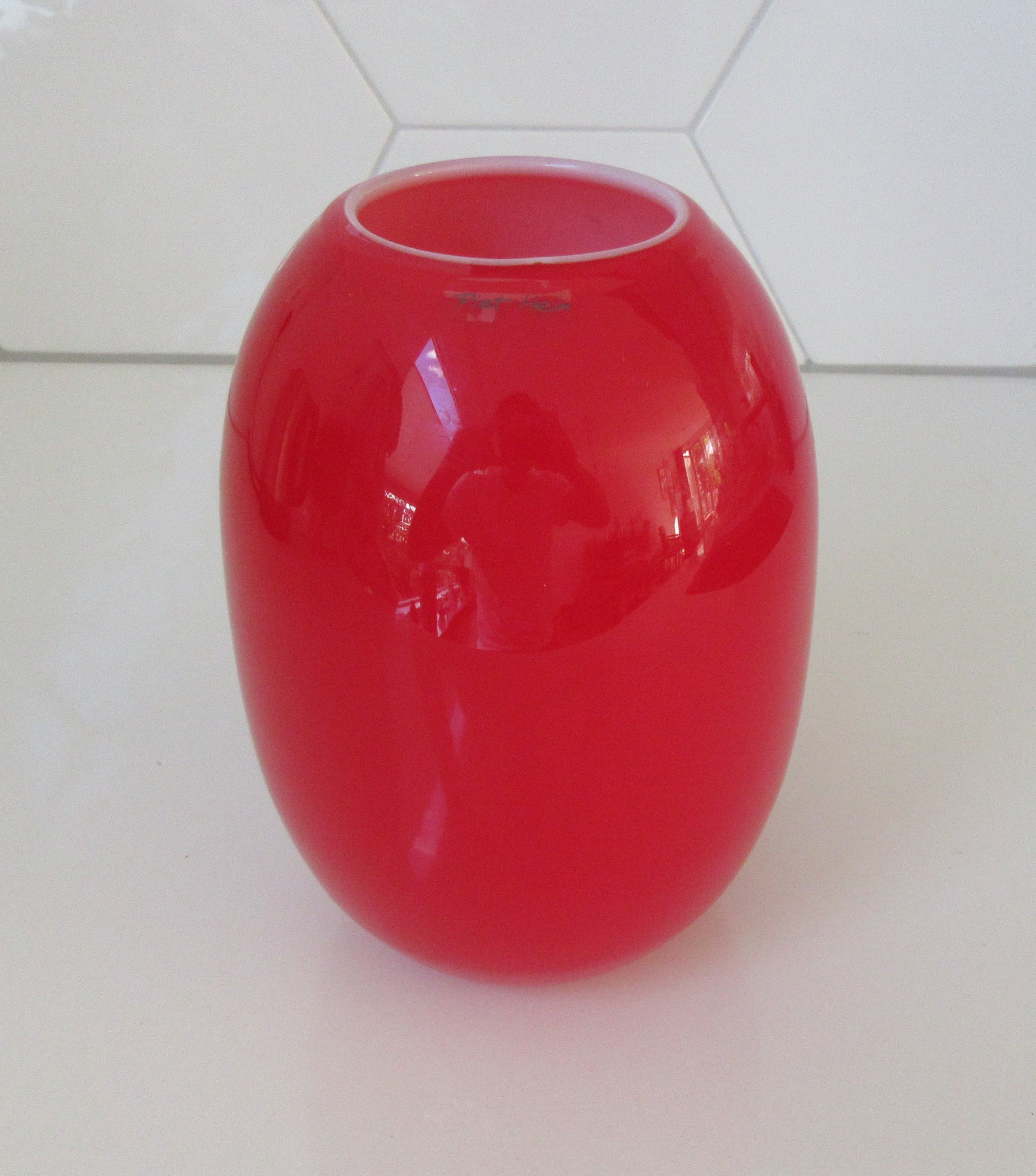 SUPER vase from Piet Hein in stained glass. Colour Red. The vase is opal white inside and red outside. The beautiful Piet Hein SUPER vases are shaped by the world-renowned SUPERELLIPSE. Marked with a sticker at the front and a etch mark at the bottom of the vase.