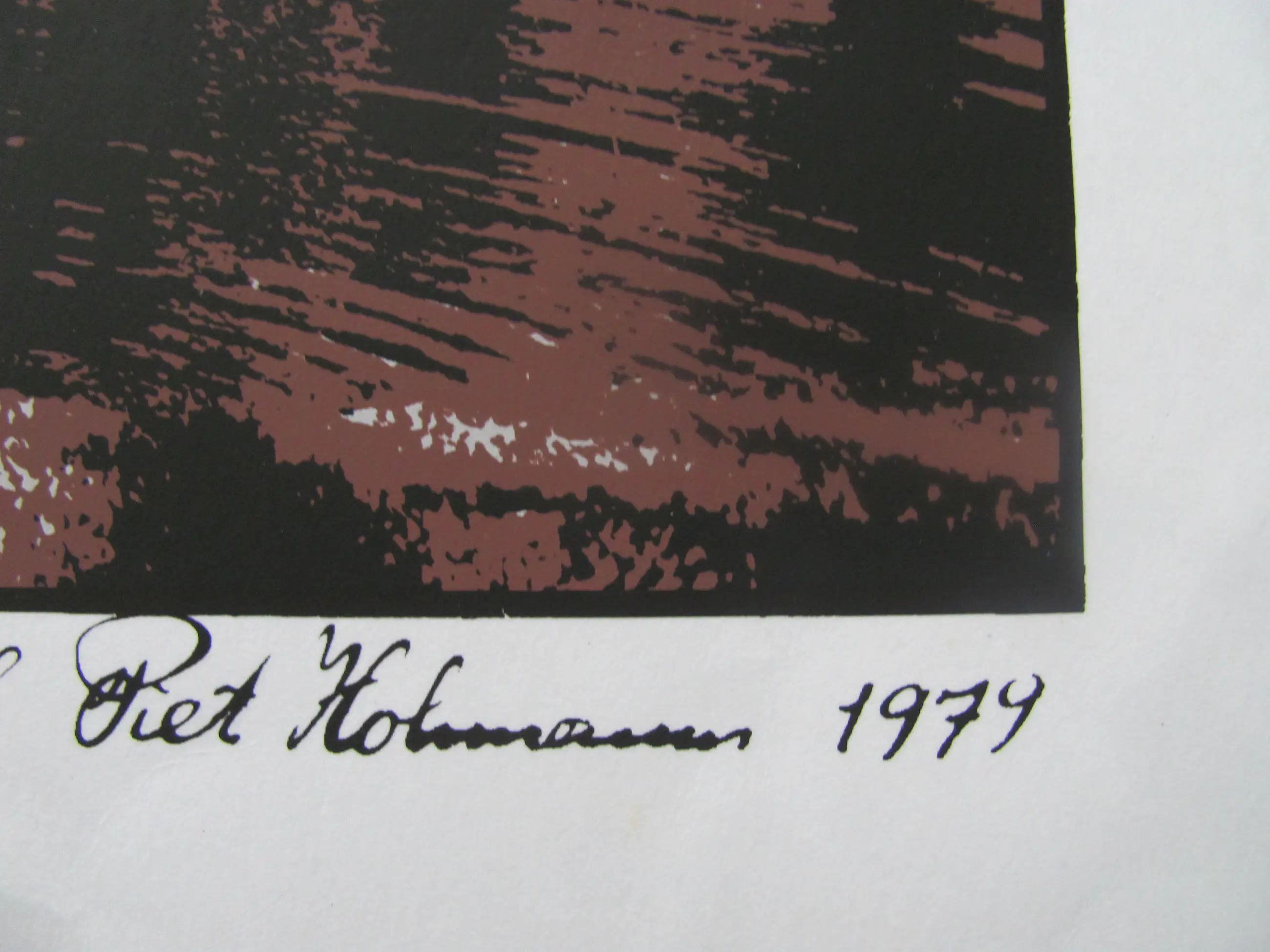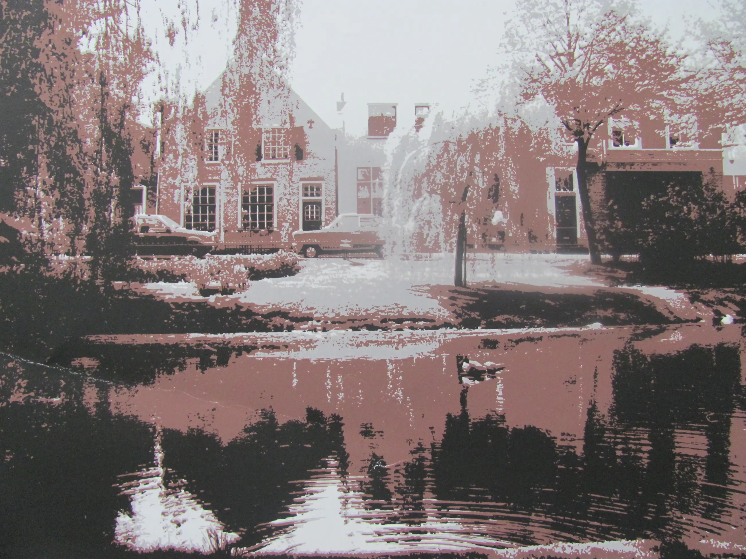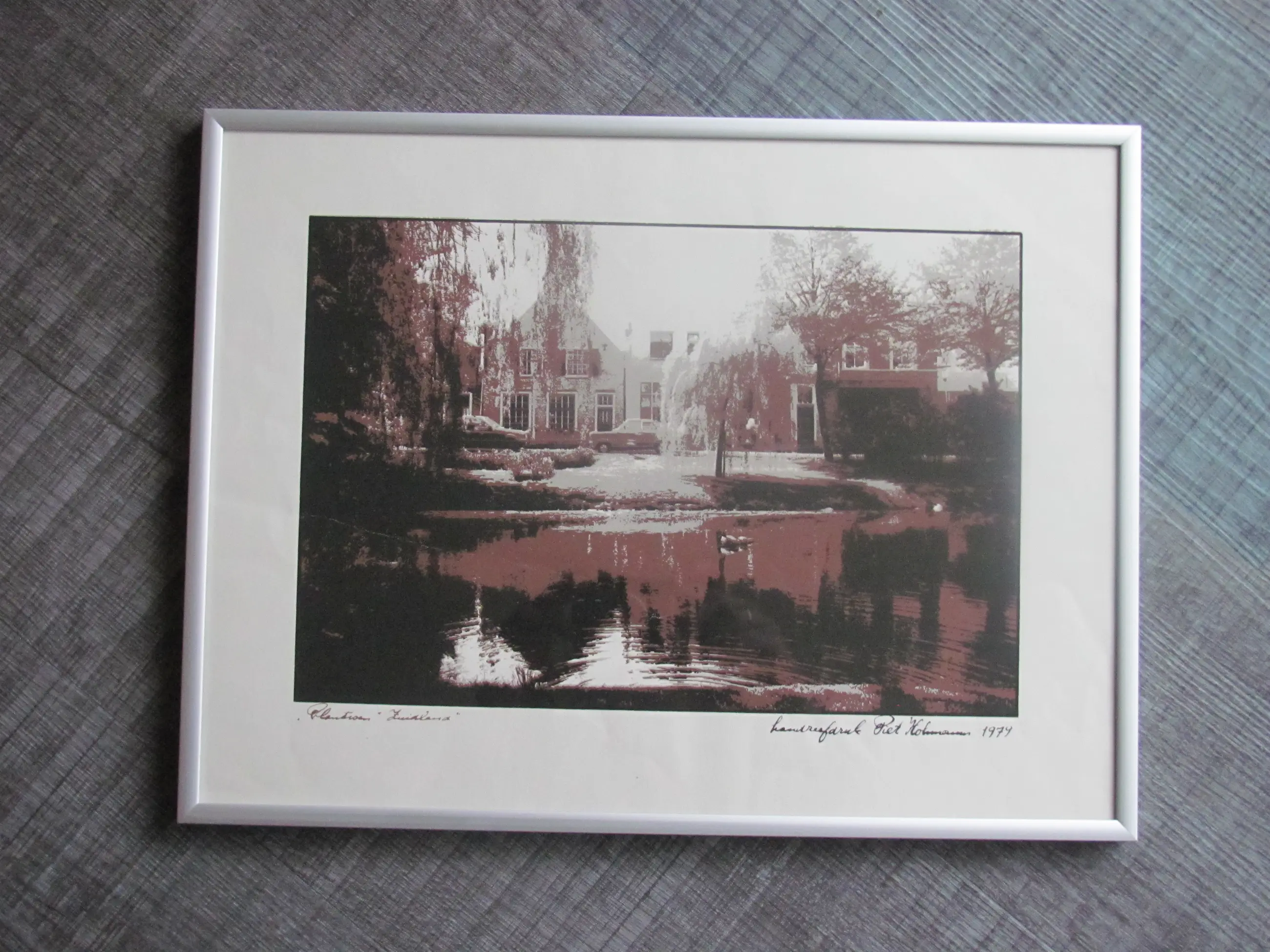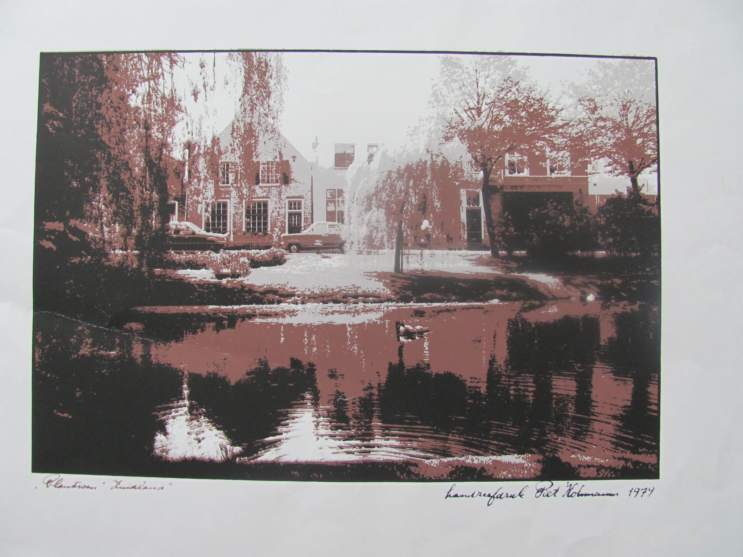 Zeefdruk van Piet Hohmann uit 1979 van "Plantsoen Zuidland". Ingelijst achter glas.