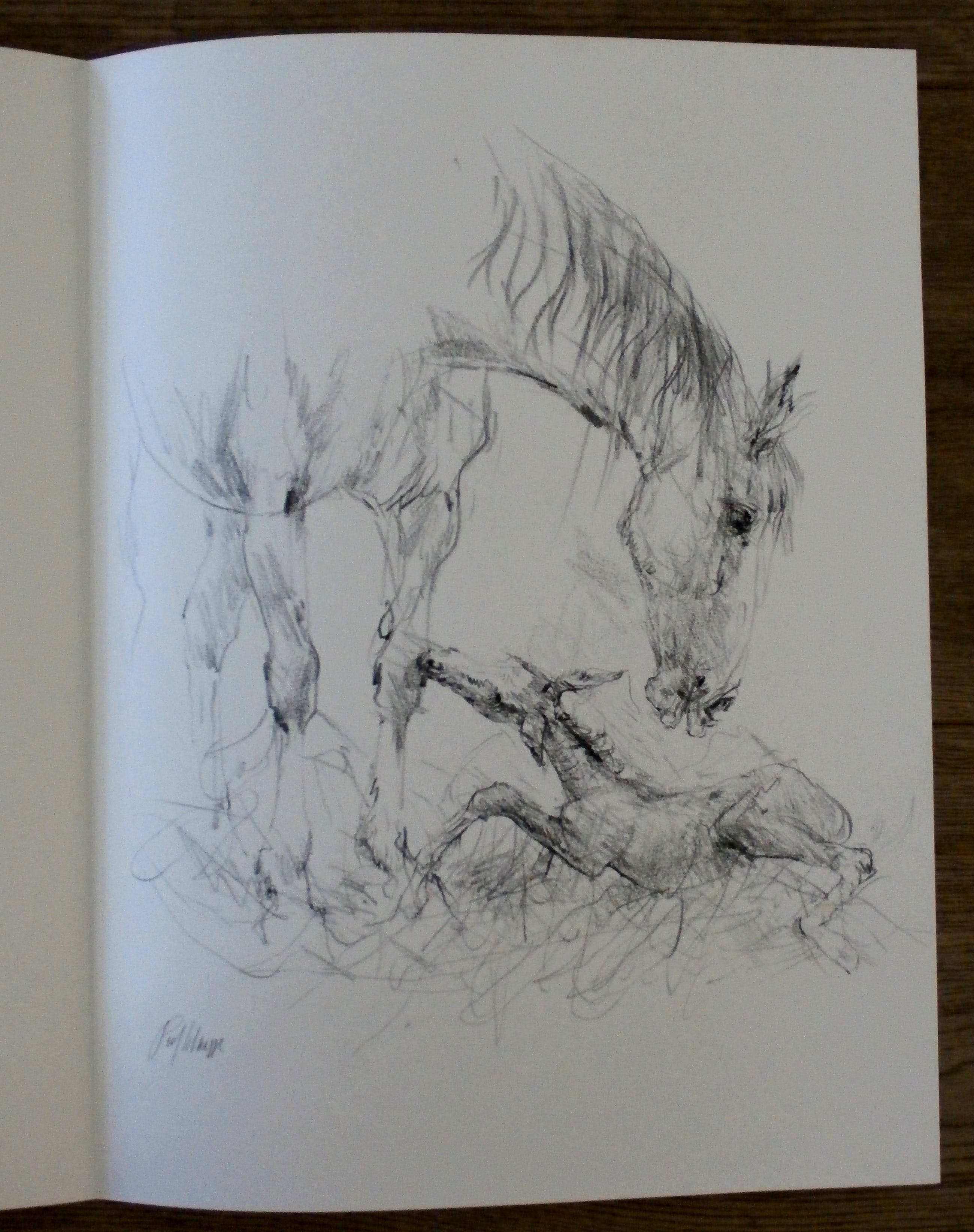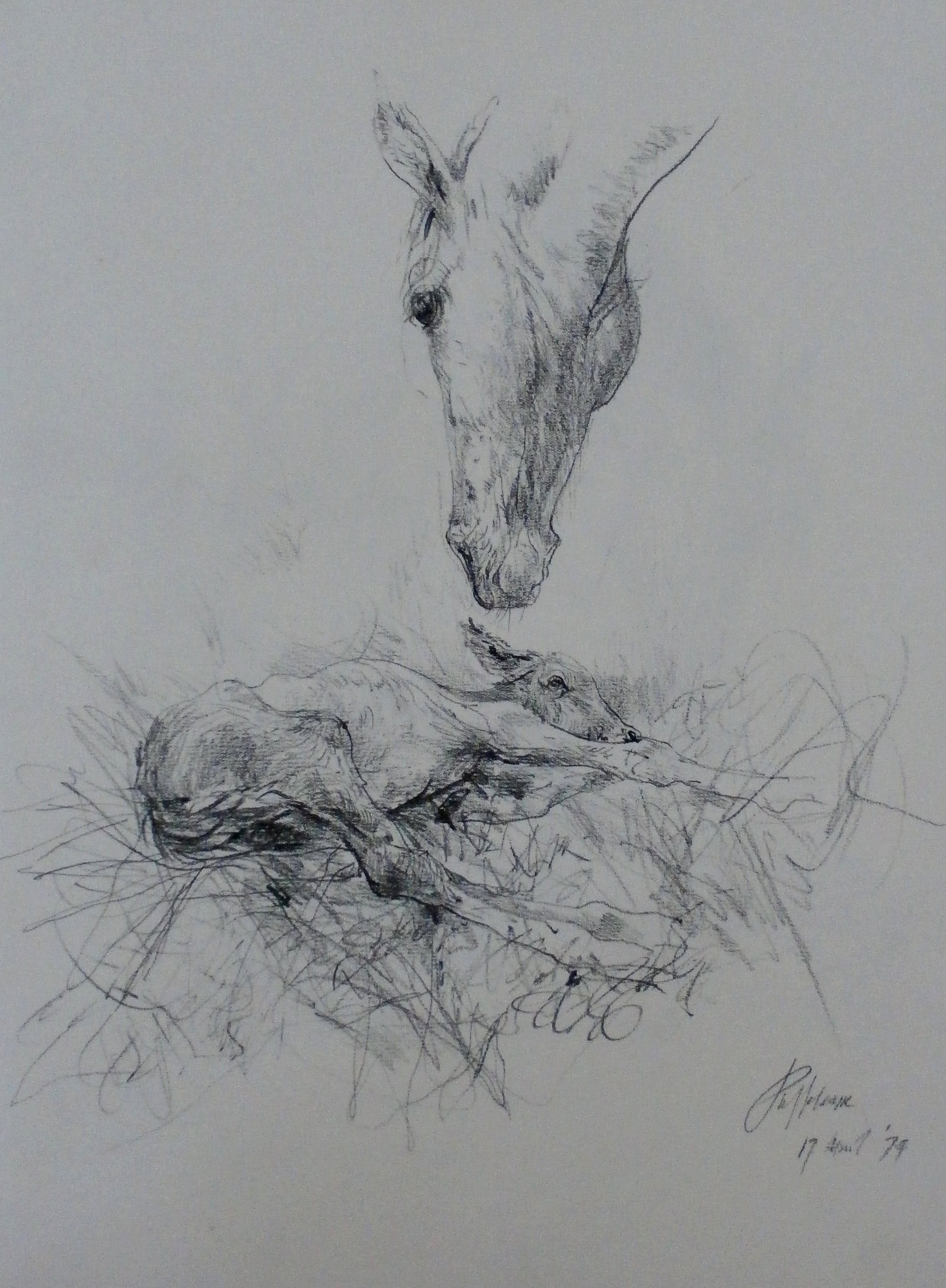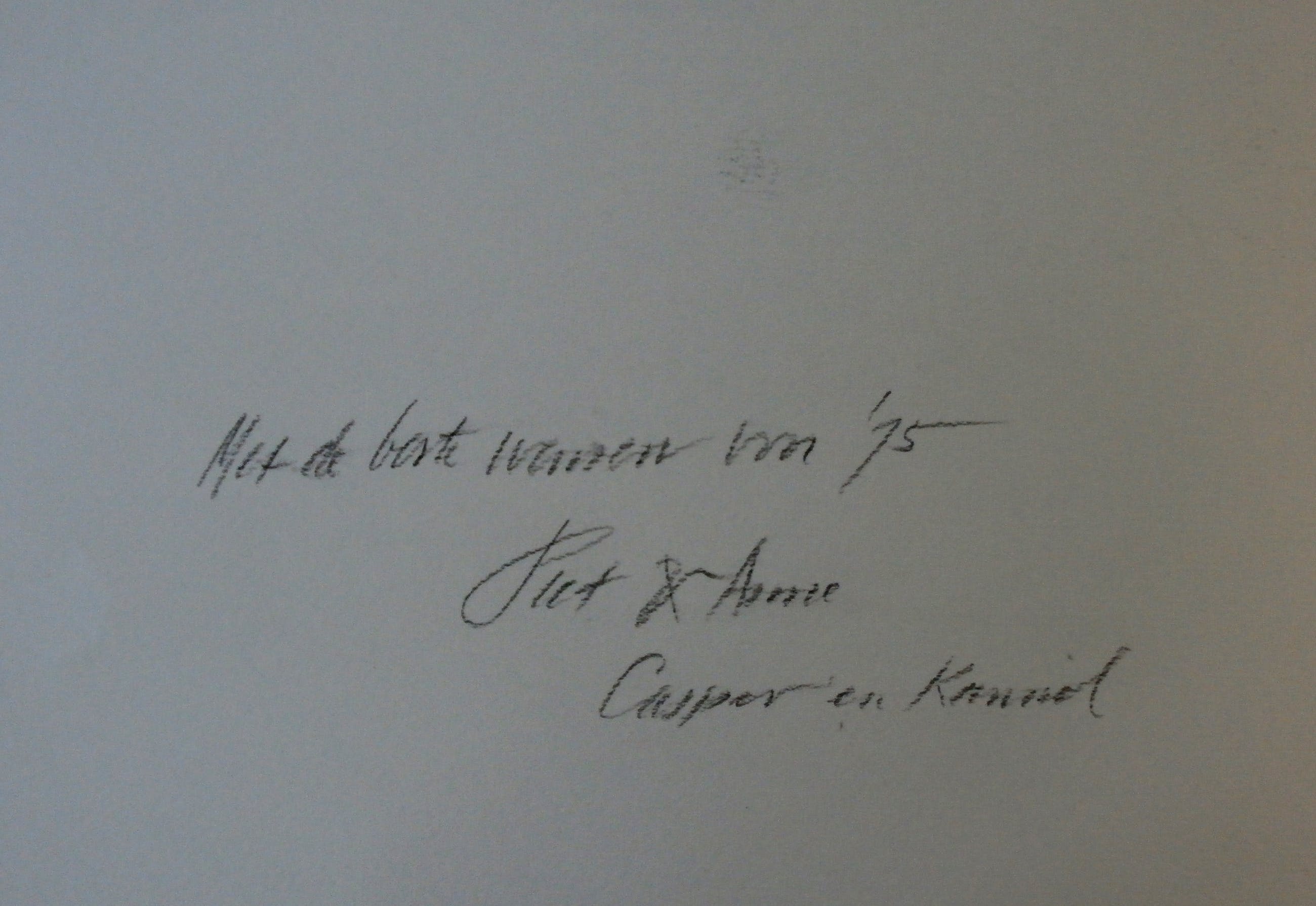 2 paardenlitho's van Piet Klaasse bij nieuwjaarswens. Tekst: Met de beste wensen voor '75. Piet & Anne, Casper en Kamiel.