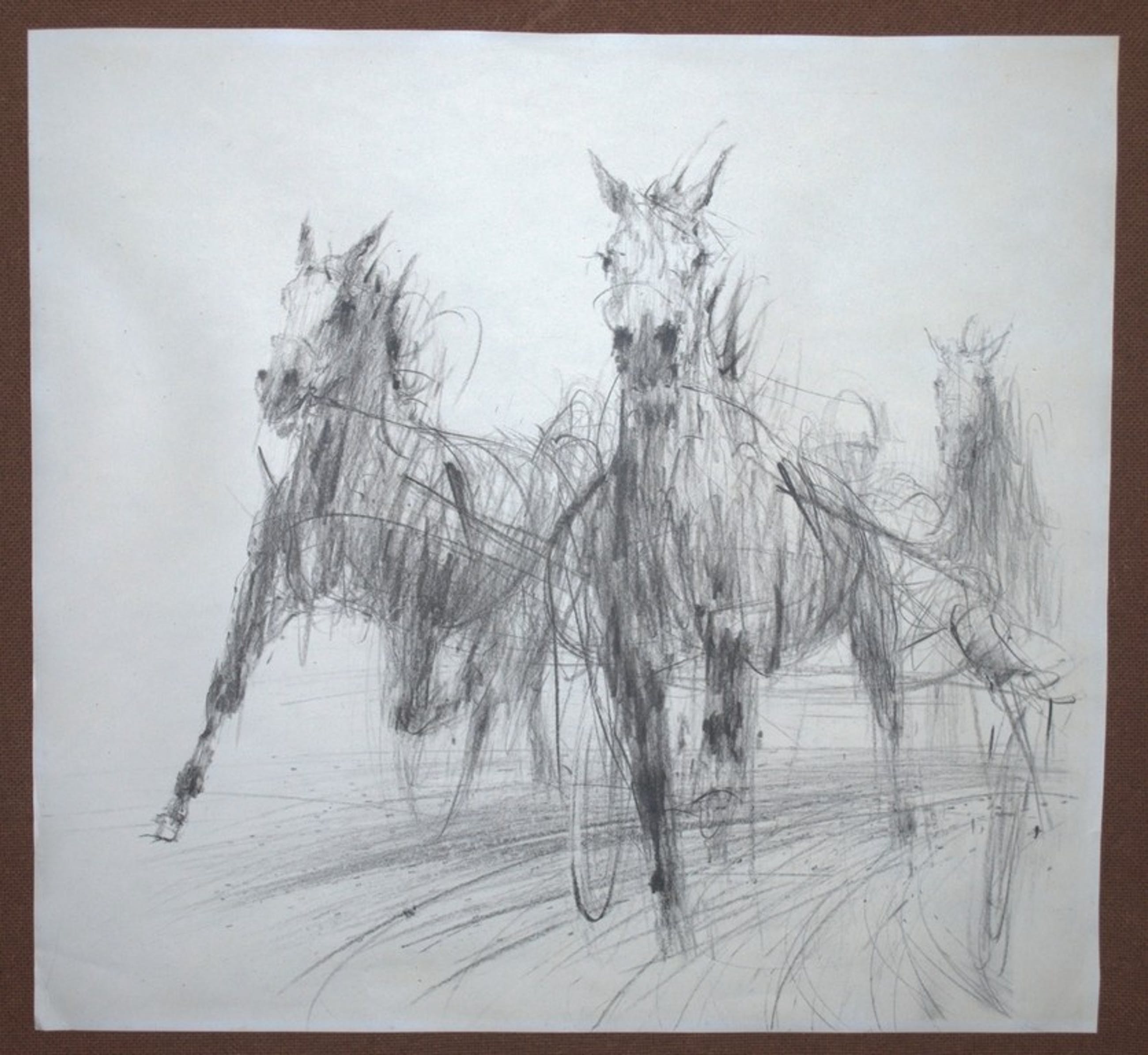 Daarbij de litho 'Paardenrace', papiermaat 41x44 cm, in goede staat, licht kreukelig, ezelsoortje l.o.