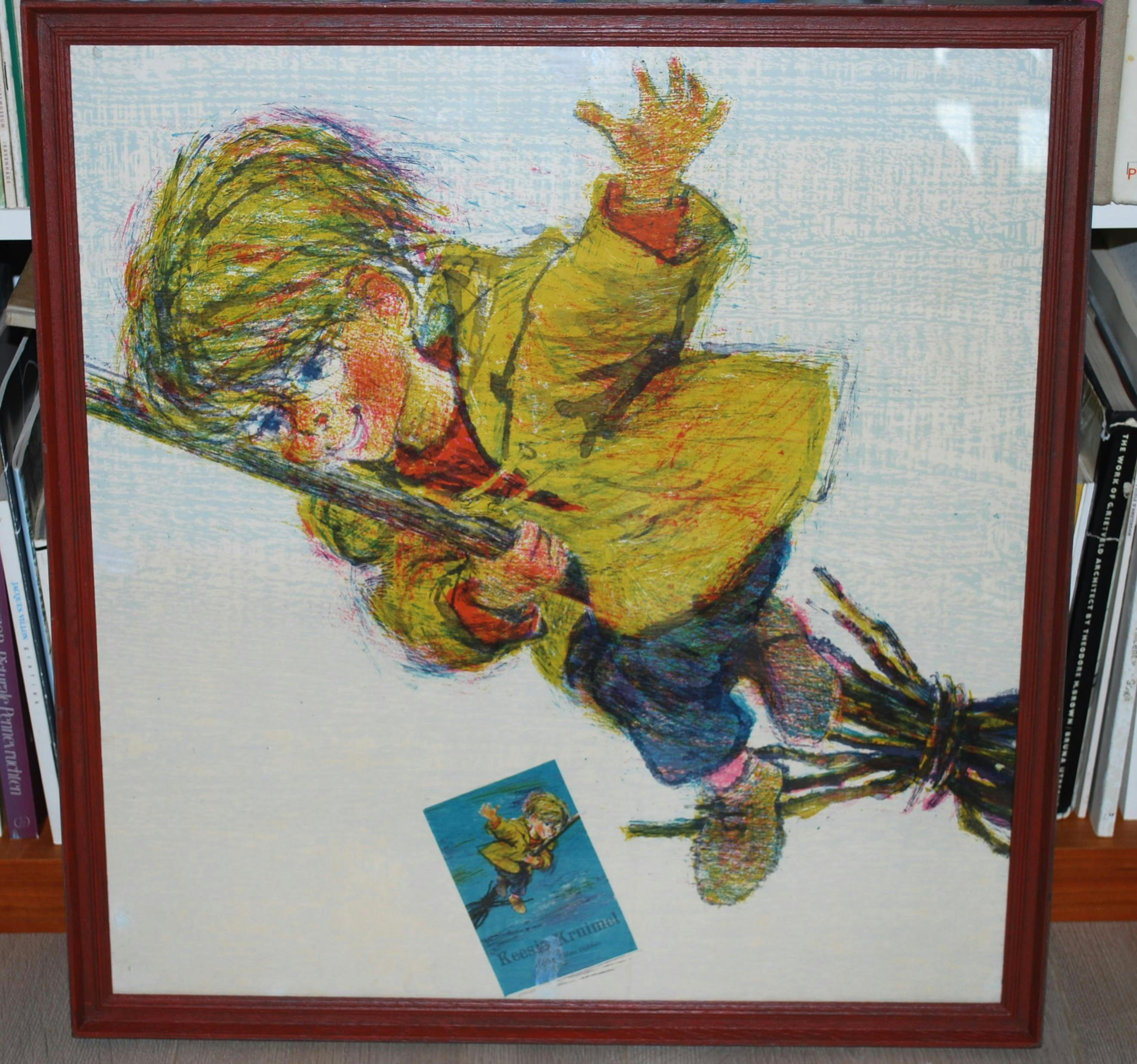 Zeer zeldzame affiche van de Kinderboekenweek (kleurenlithografie) uit 1962. De affiche is op enig moment in het verleden ingekort. De volledige versie is op de laatste foto te zien; de foto daarvóór is een foto met het colofon. De voorstelling van Keesje is in prima staat. Langs de randen zijn 3 plekken waar het papier dun is. Aan de onderrand is het kinderboek met enige potloodletters hersteld. Ondanks de geringe schade een mooi en vrolijk tijdsdocument. In een vernieuwde hardhouten lijst met goede kleurstelling. Achter glas. Let op: verzending buitenland zonder de lijst. Gerolde verzending in een koker.