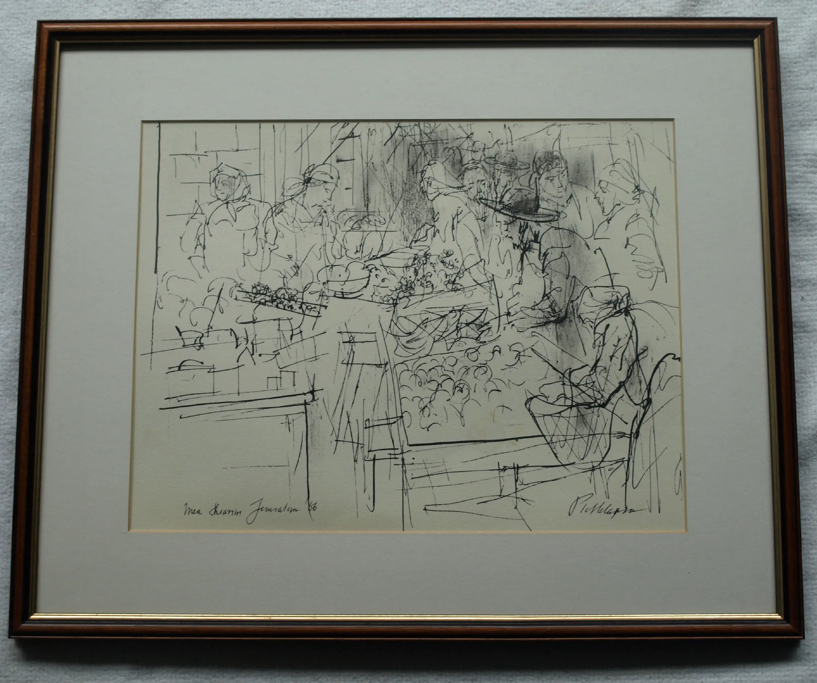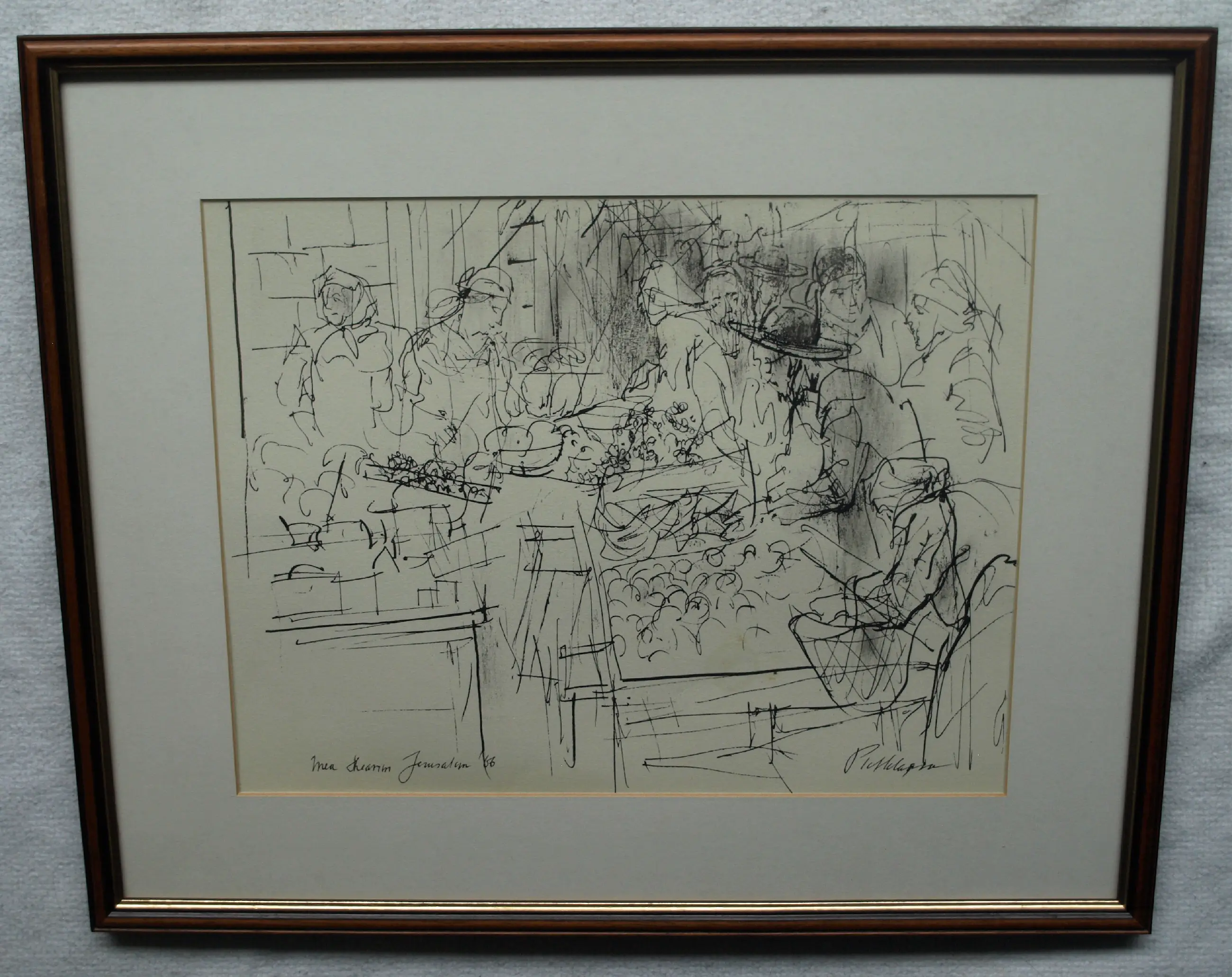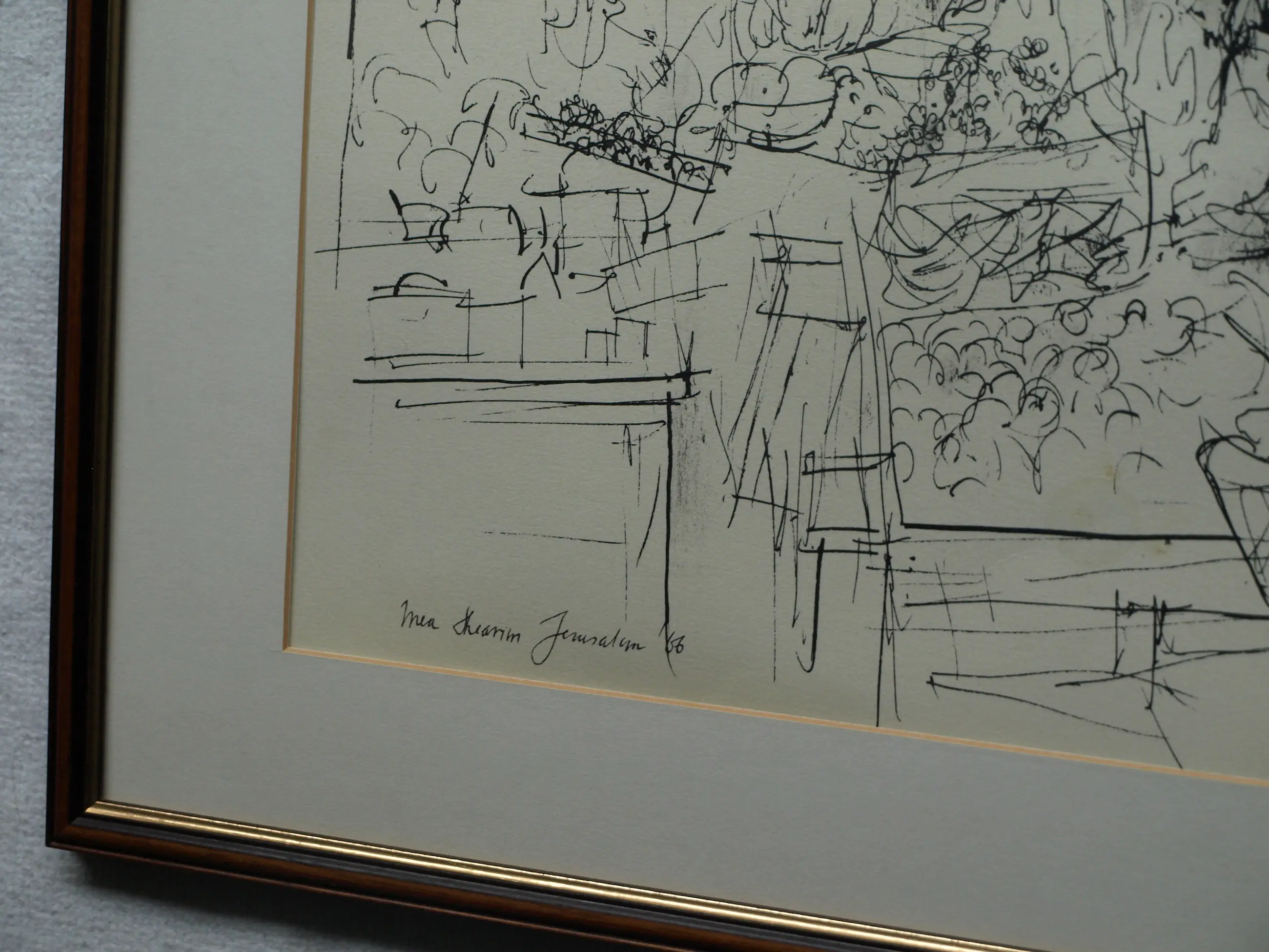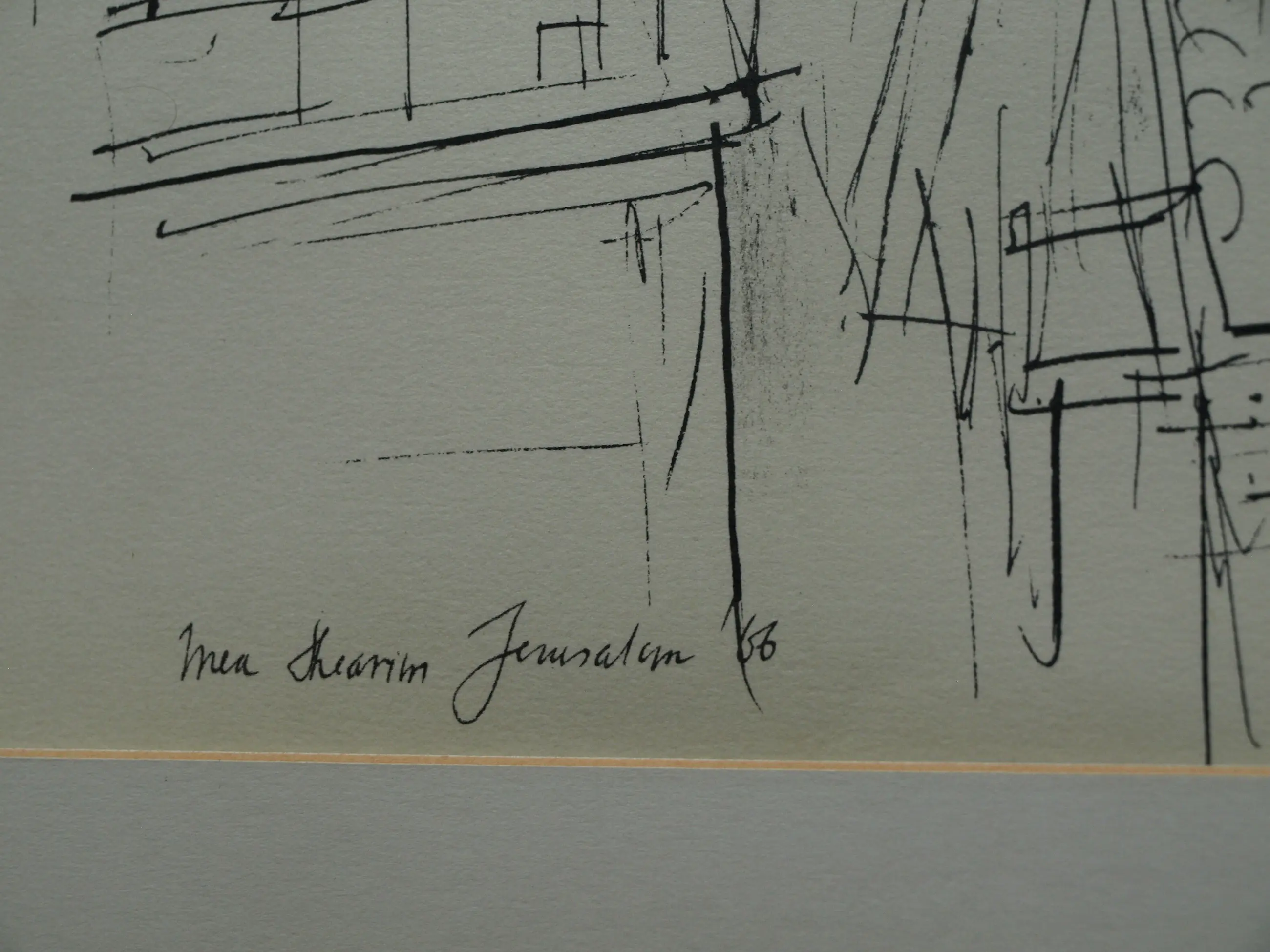 Een ingelijste litho (of toch een tekening?) uit 1966 van de Nederlandse kunstenaar Piet Klaase (1918-2001), getiteld: “Mea Sjearim Jerusalem”. Mea Sjearim (Hebreeuws: ‘honderd poorten’) is één van de oudste wijken van Jeruzalem. -Gesigneerd rechtsonder. Getiteld en gedateerd linksonder. -Ingelijst in een houten lijst met passe-partout en glasplaat. -Afmetingen: Lijst, 39 x 42 x 1½ cm. Beeld, 25½ x 33½ cm. -Herkomst: Uit een inboedel. -Conditie: De litho is in goede staat. Het papier van de litho is licht ‘vergeeld’. De kartonnen achterplaat is rechtsonder gedeeltelijk afgescheurd…. Zie ook alle foto’s voor een eigen indruk. Kan zo aan de muur.