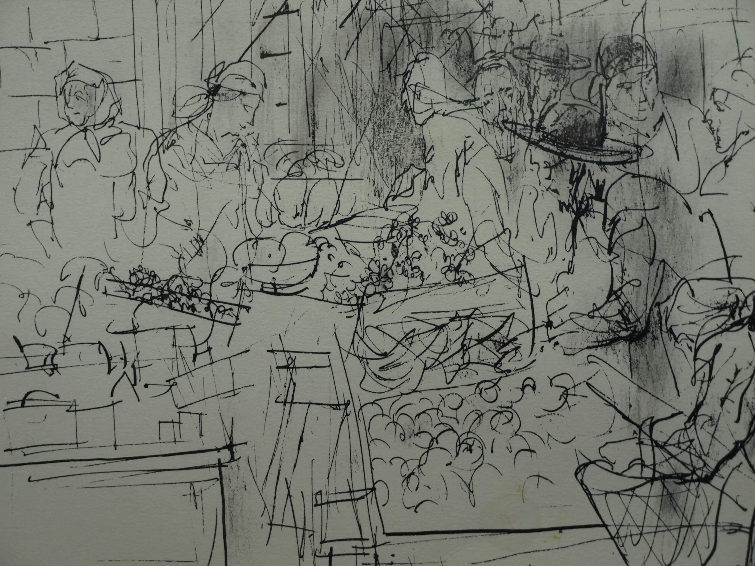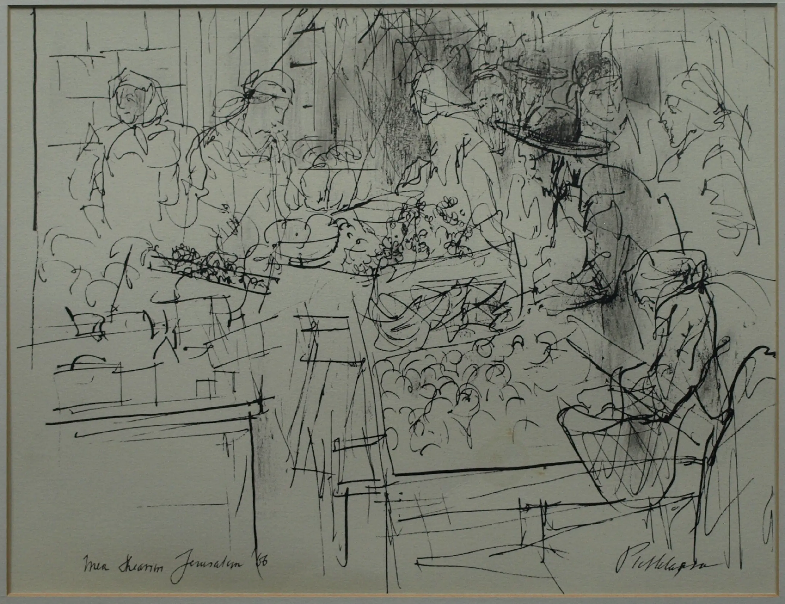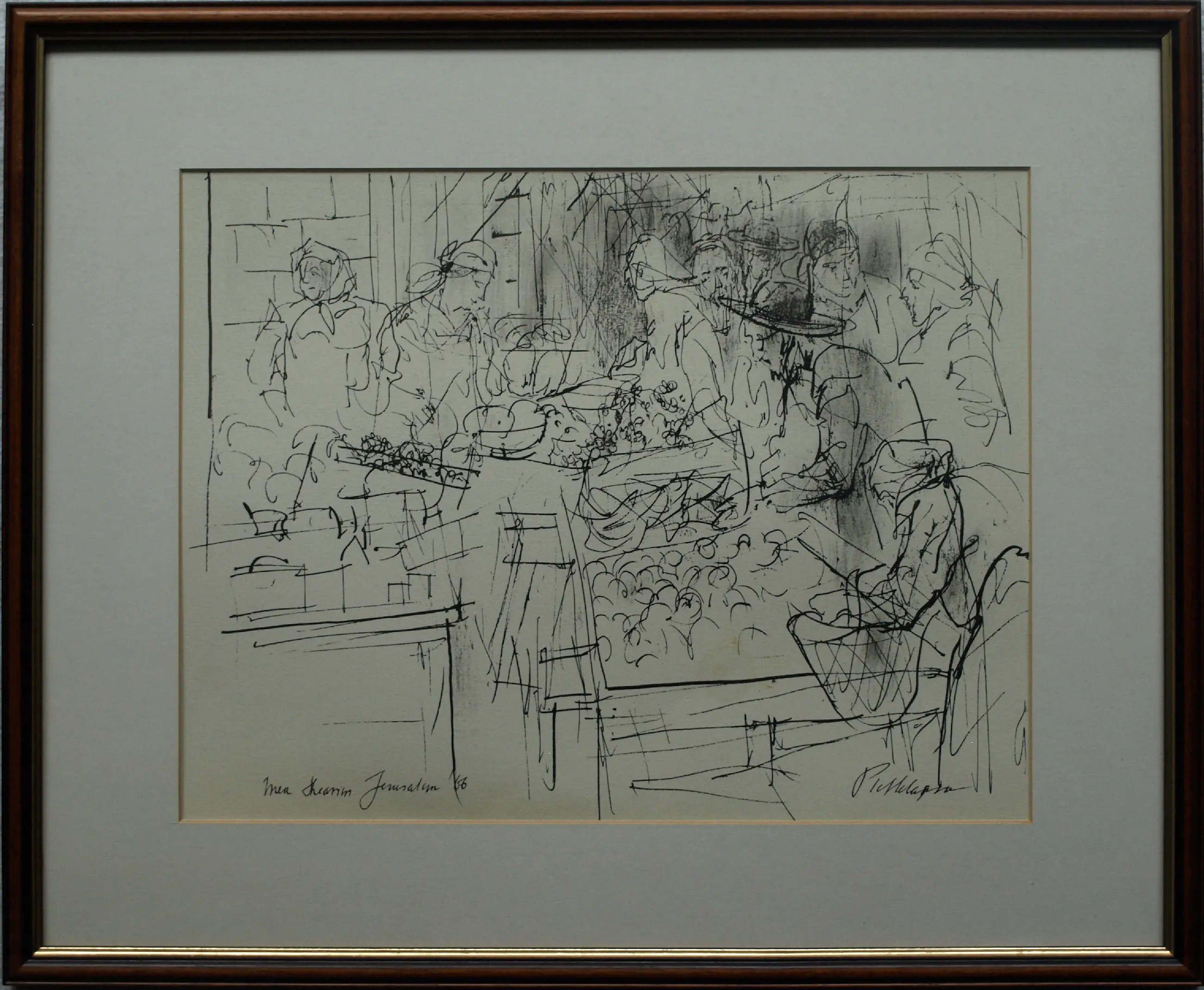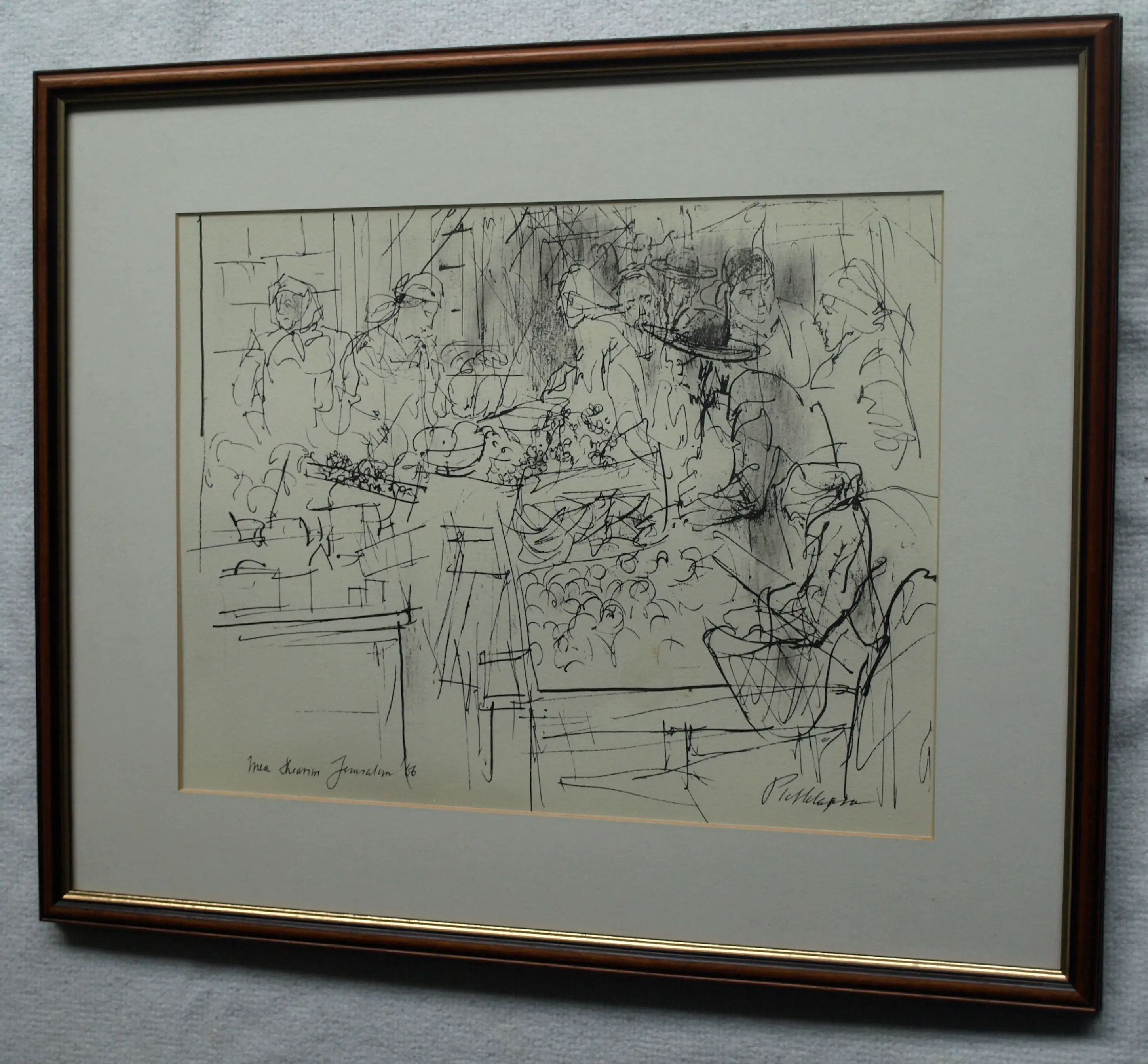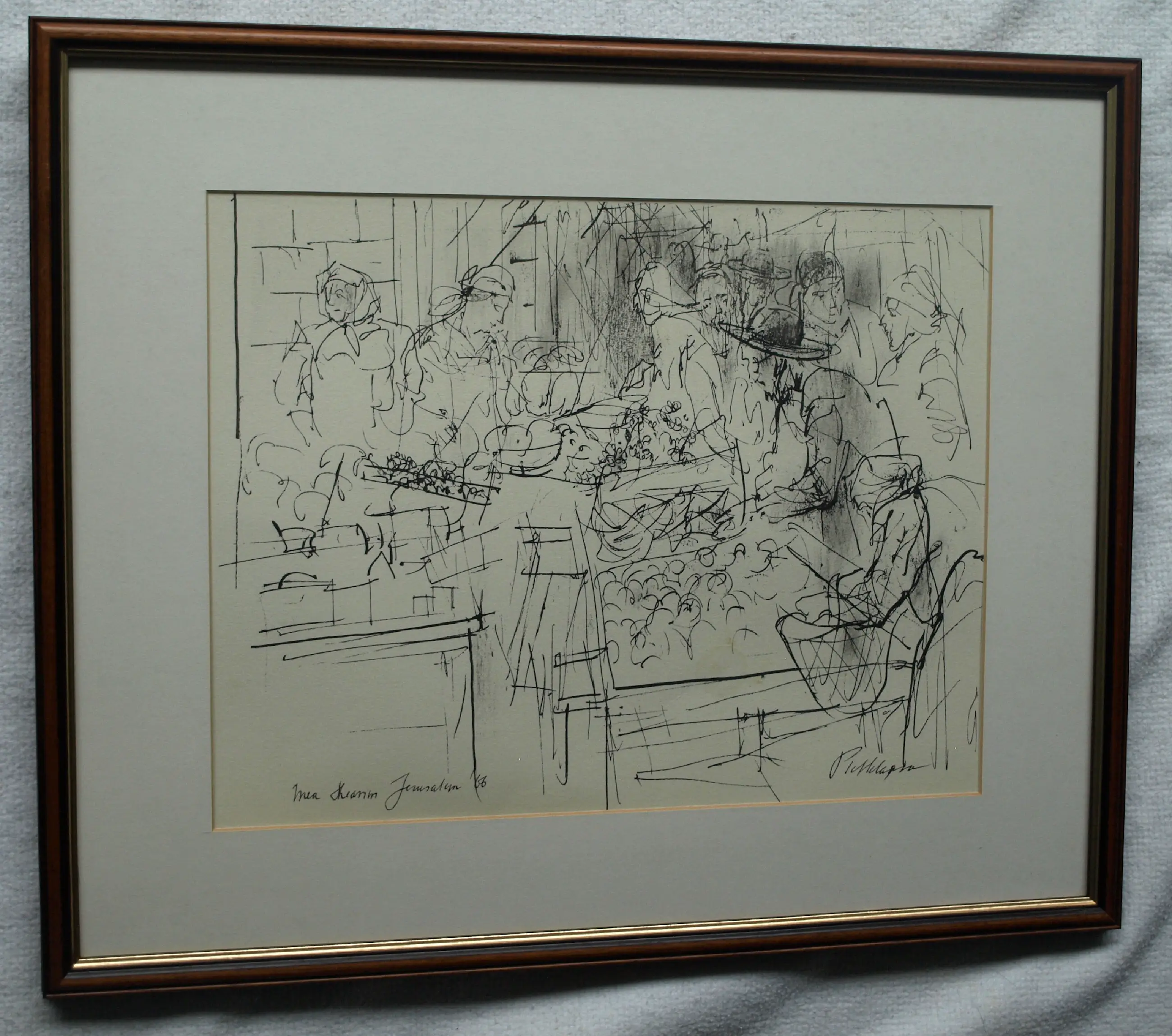 Een ingelijste litho (of toch een tekening?) uit 1966 van de Nederlandse kunstenaar Piet Klaase (1918-2001), getiteld: “Mea Sjearim Jerusalem”. Mea Sjearim (Hebreeuws: ‘honderd poorten’) is één van de oudste wijken van Jeruzalem. -Gesigneerd rechtsonder. Getiteld en gedateerd linksonder. -Ingelijst in een houten lijst met passe-partout en glasplaat. -Afmetingen: Lijst, 39 x 42 x 1½ cm. Beeld, 25½ x 33½ cm. -Herkomst: Uit een inboedel. -Conditie: De litho is in goede staat. Het papier van de litho is licht ‘vergeeld’. De kartonnen achterplaat is rechtsonder gedeeltelijk afgescheurd…. Zie ook alle foto’s voor een eigen indruk. Kan zo aan de muur.