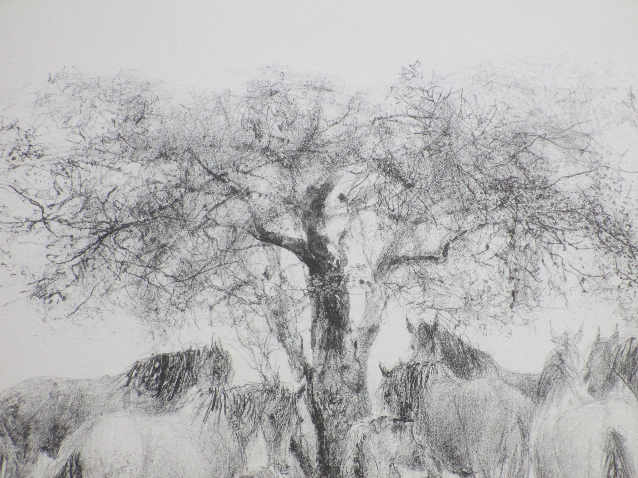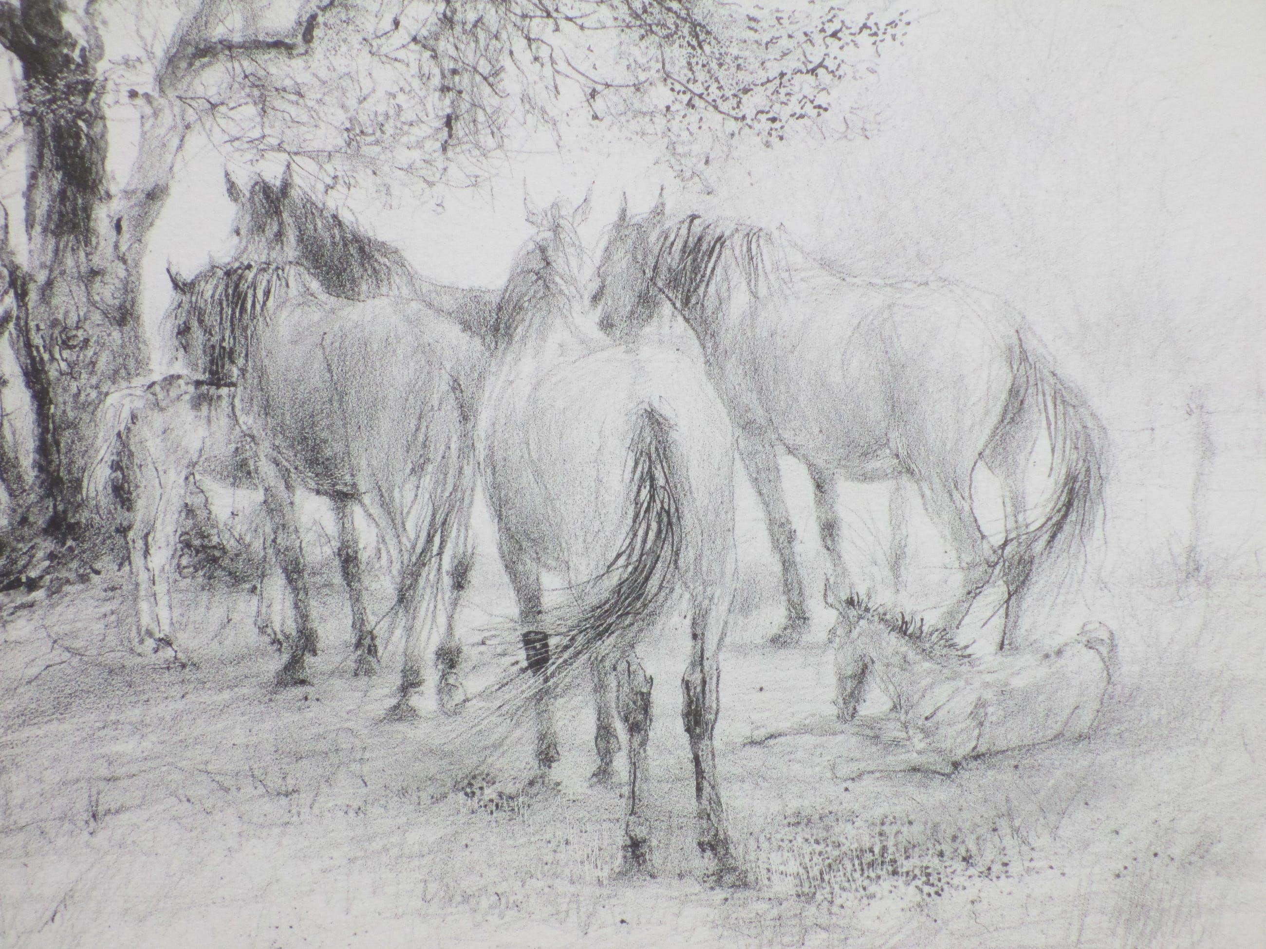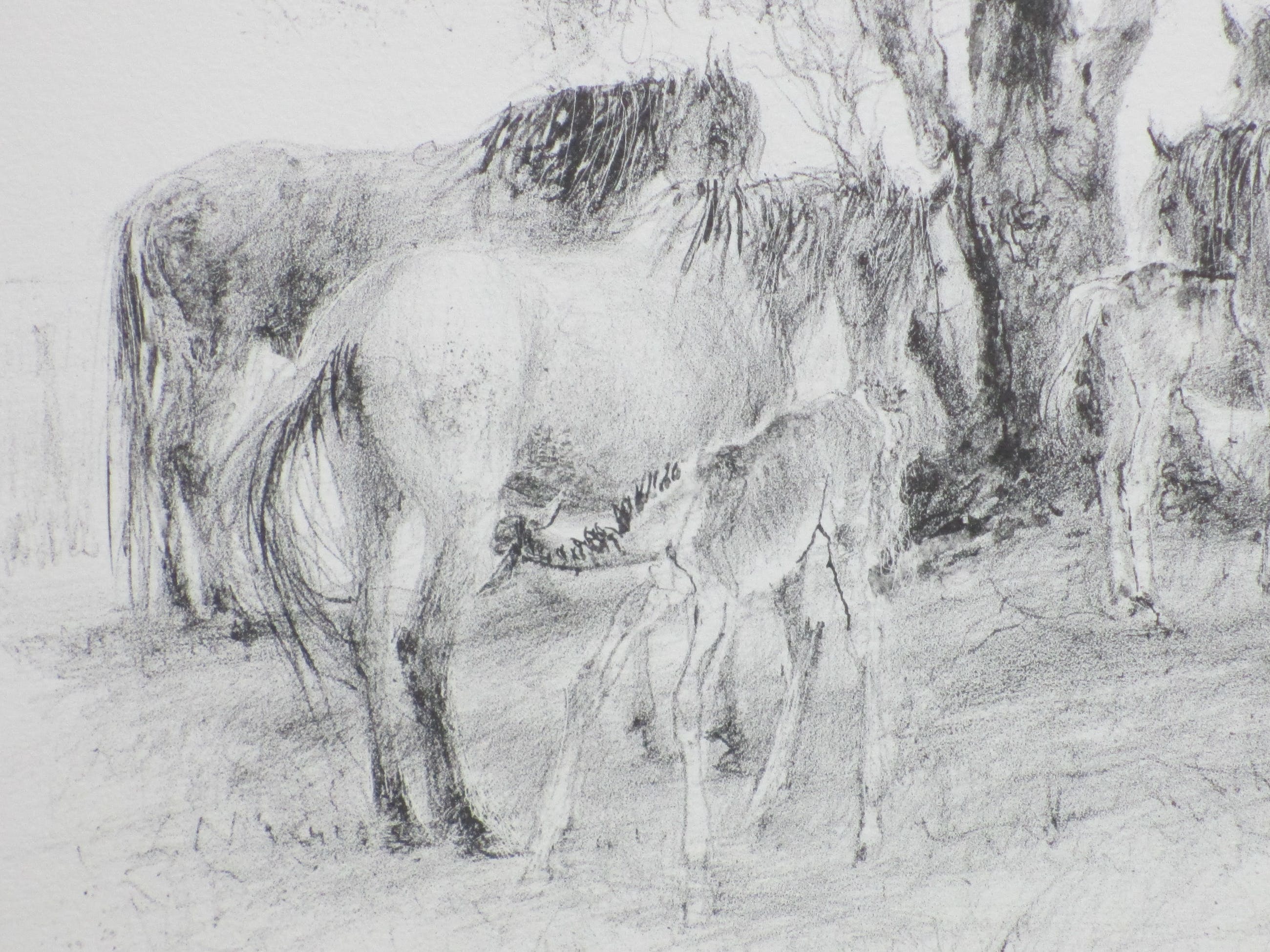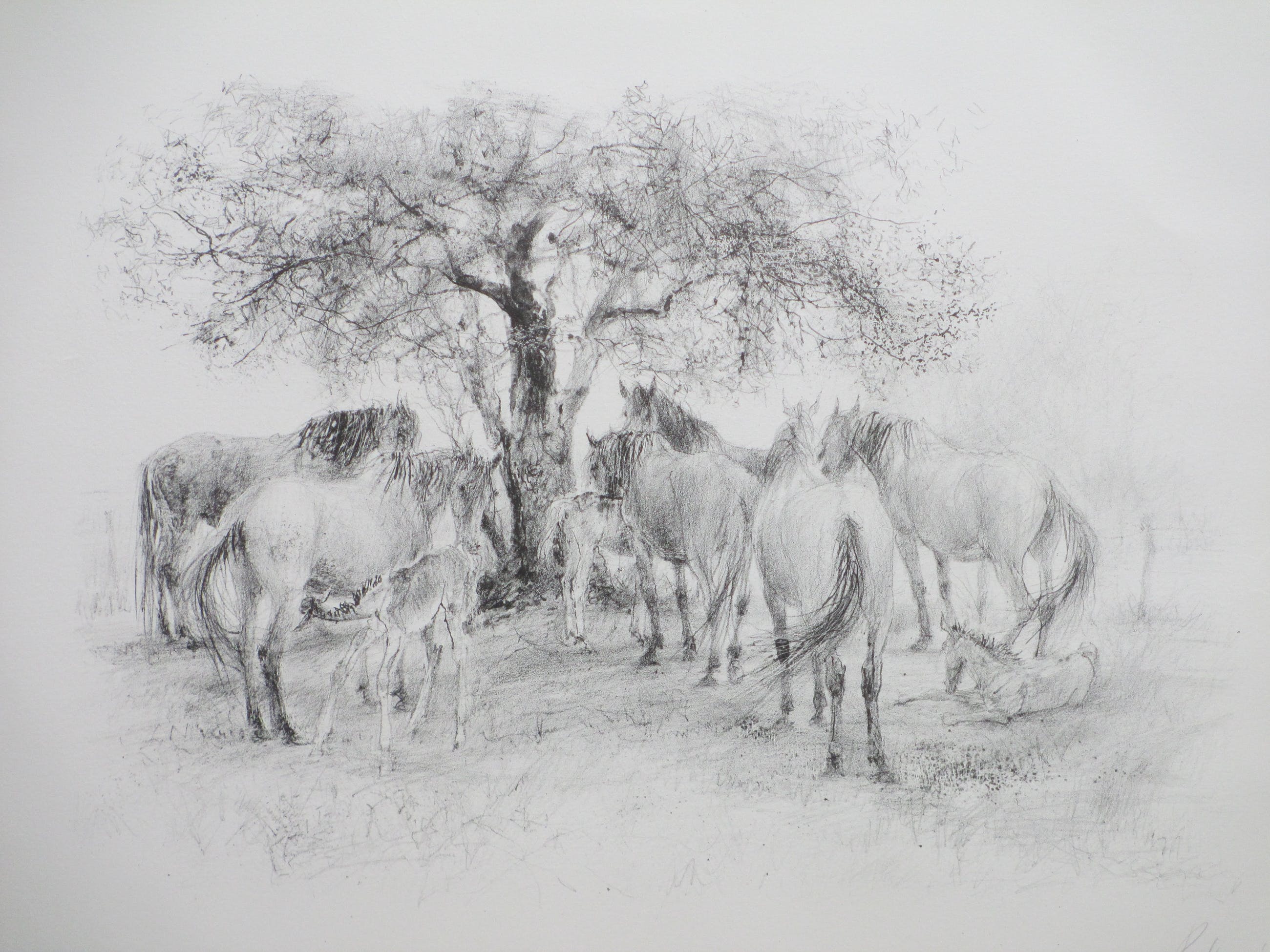Litho door Piet Klaasse Voorstelling van paarden en veulens bij een boom Losbladig, beeldmaat 26x36, bladmaat 38x49 Gesigneerd en gedateerd r.o.: 'Piet Klaasse '77' Genummerd l.o.: '21/200' Authenticiteit volledig gegarandeerd
