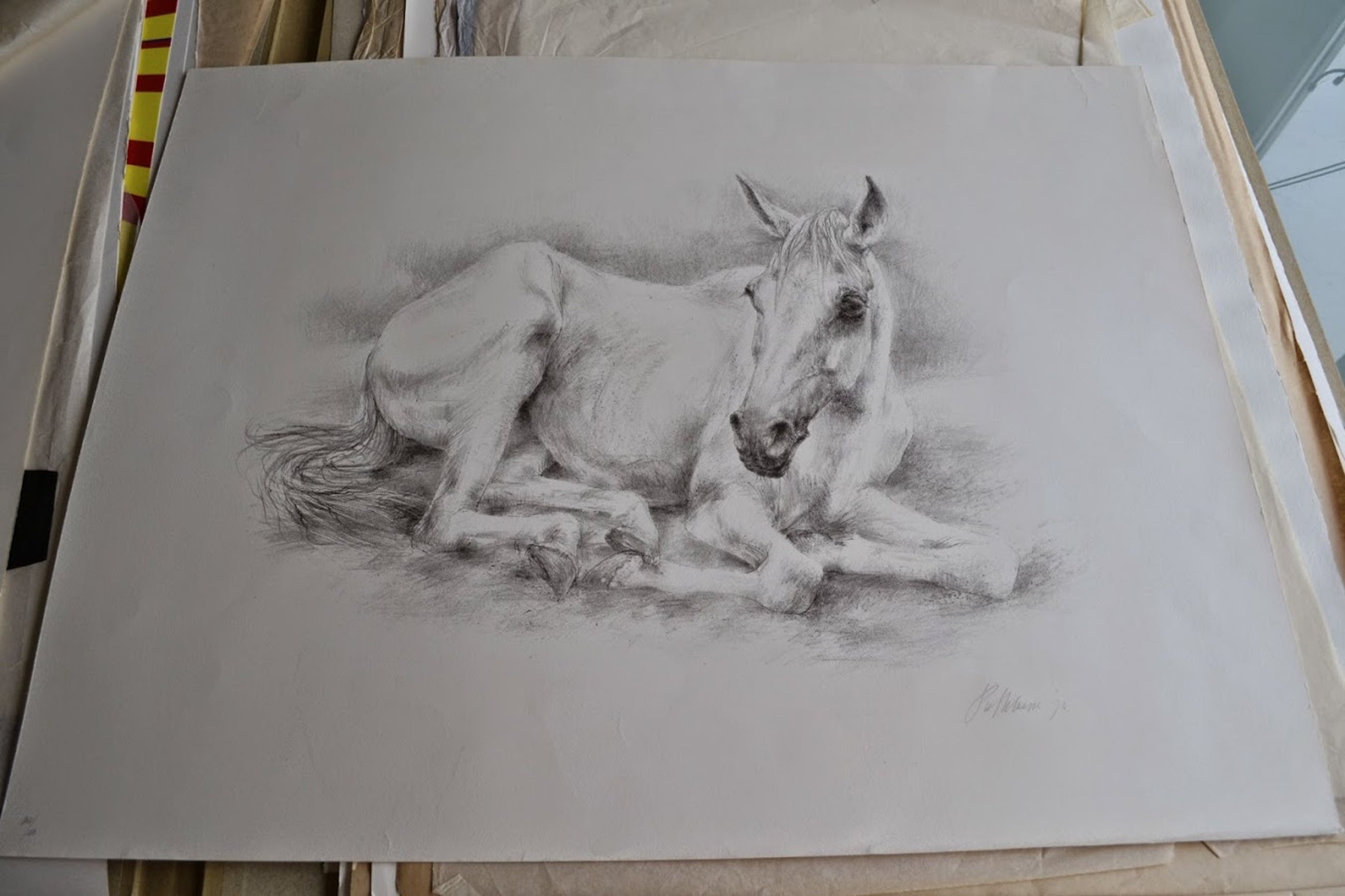 Typerende afbeelding van Piet Klaasse. Rustend paard. Litho.