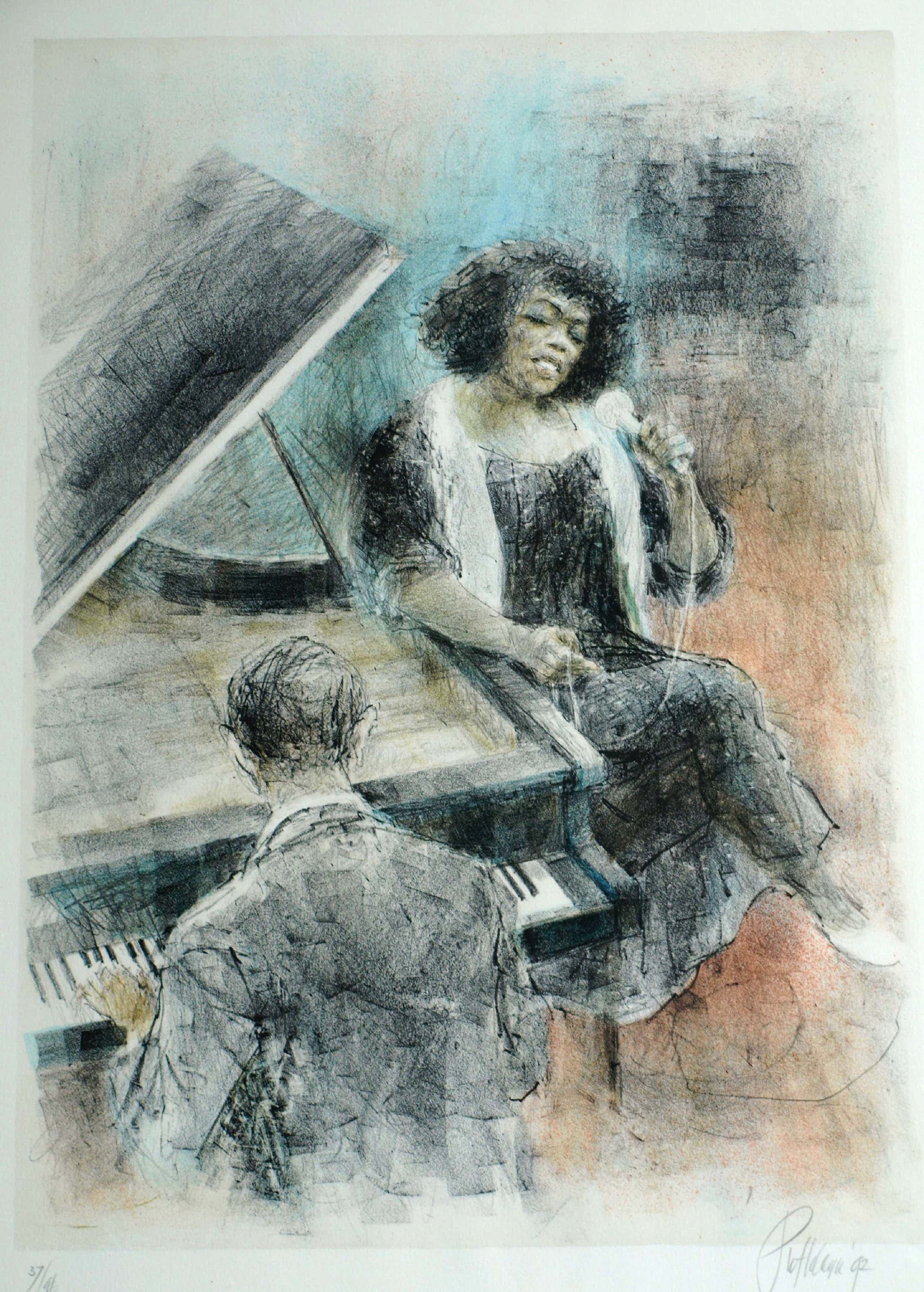 Litho van Piet Klaasse 1918-2001 uit 1992 met een voorstelling van de Jazz zangeres Sarah Vaughan 1924-1990 Ingelijst met een barst in de glasplaat, litho zelf heeft geen schade.