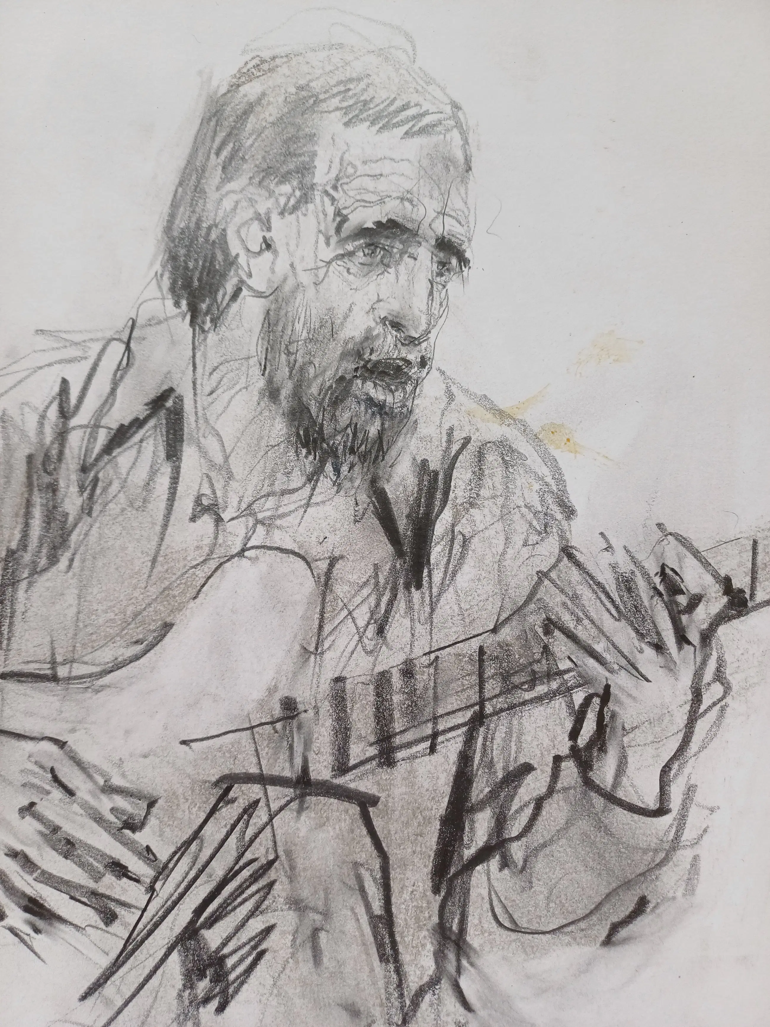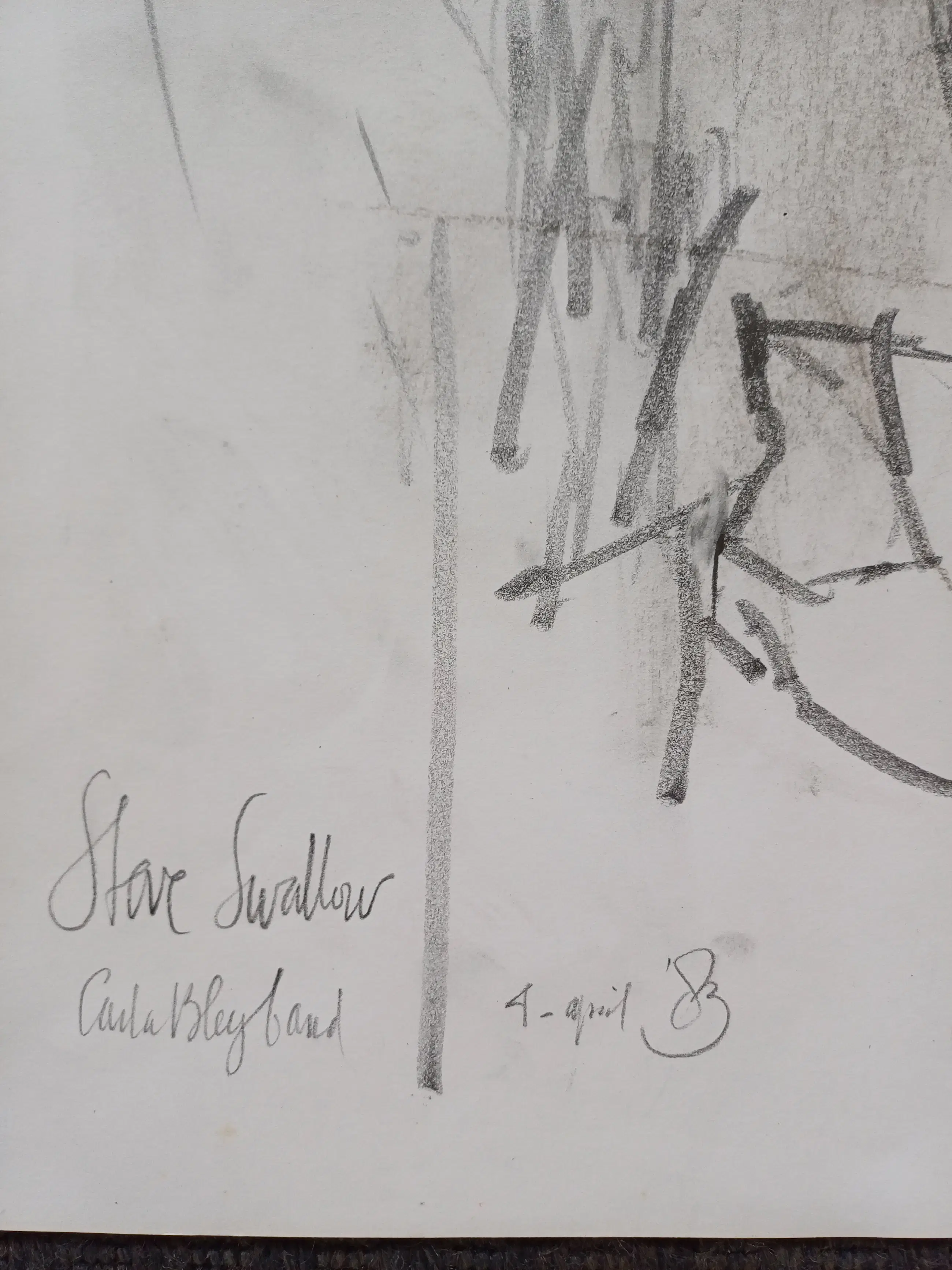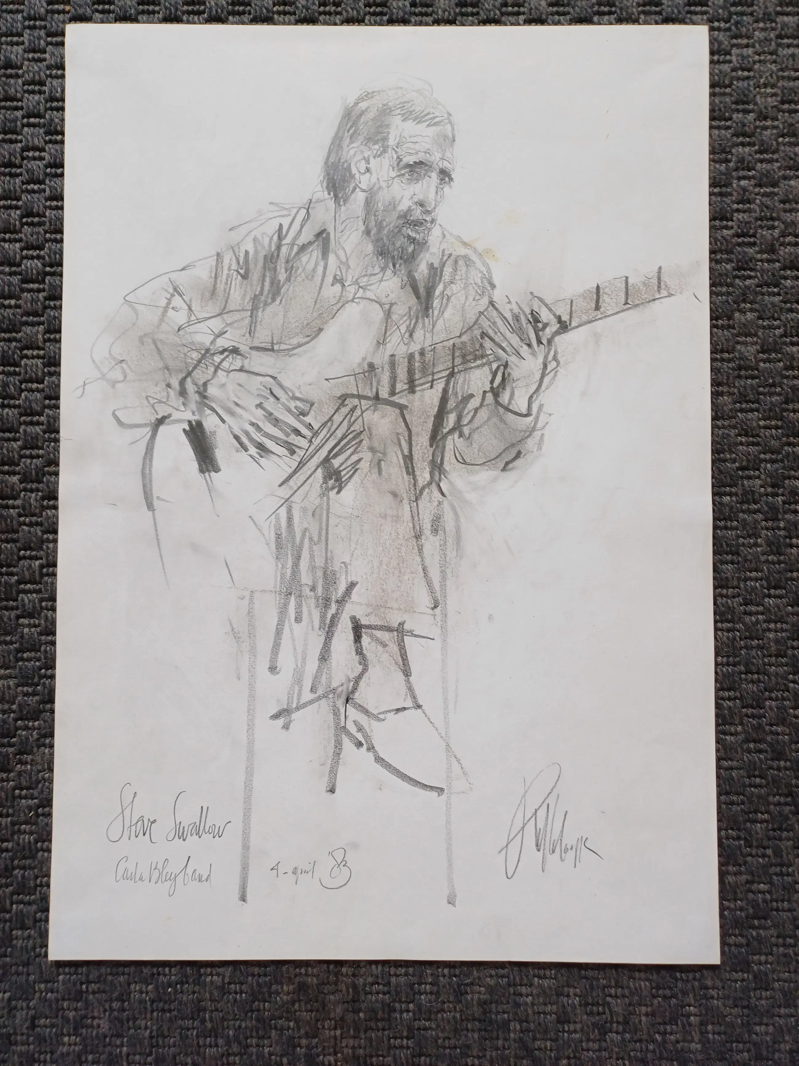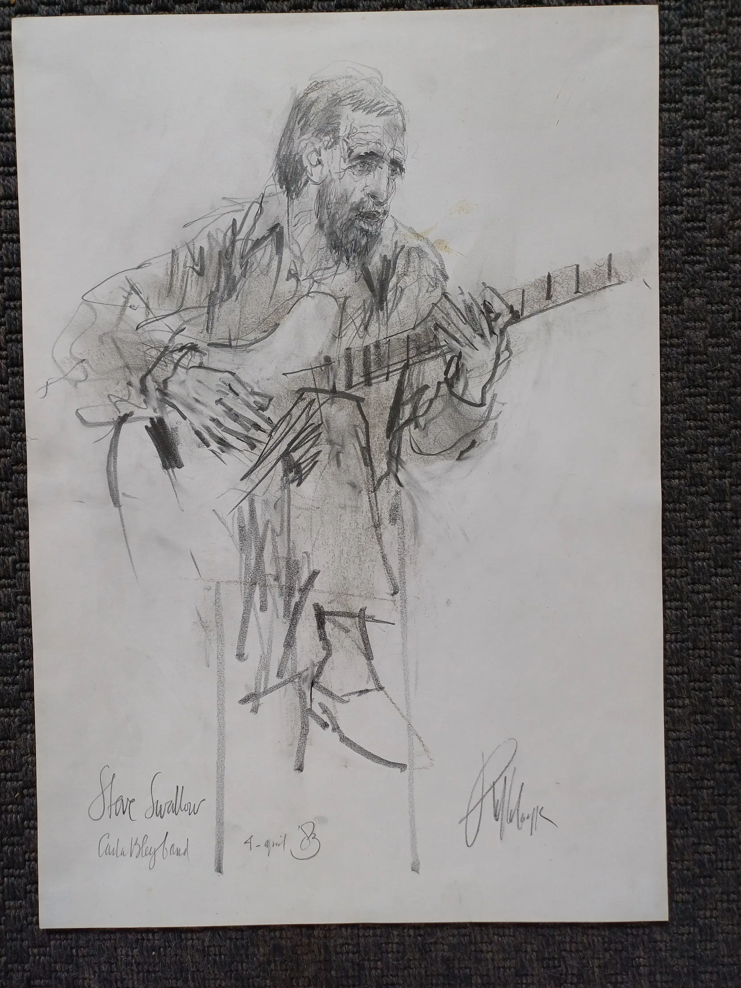 Mooie tekening van Piet Klaasse van de gitarist Steve Swallow tijdens een optreden met de Carla Bley Band op 4 April 1983.