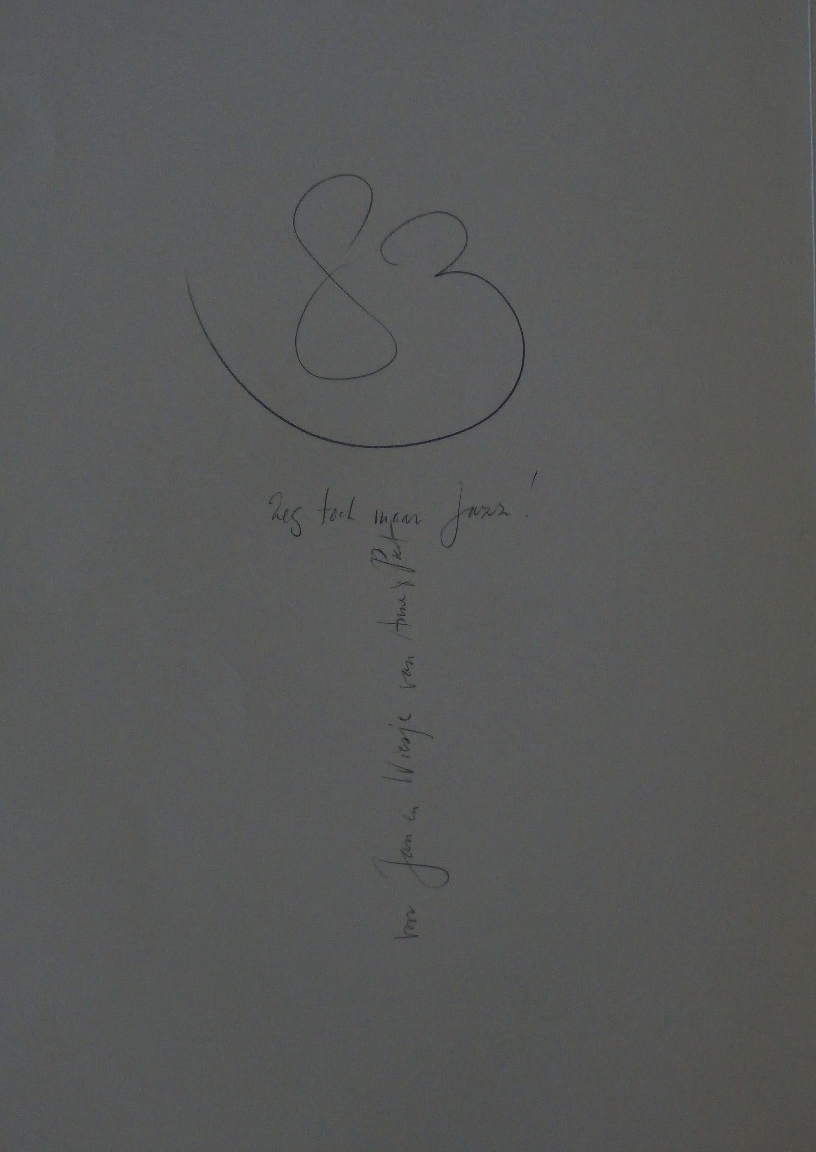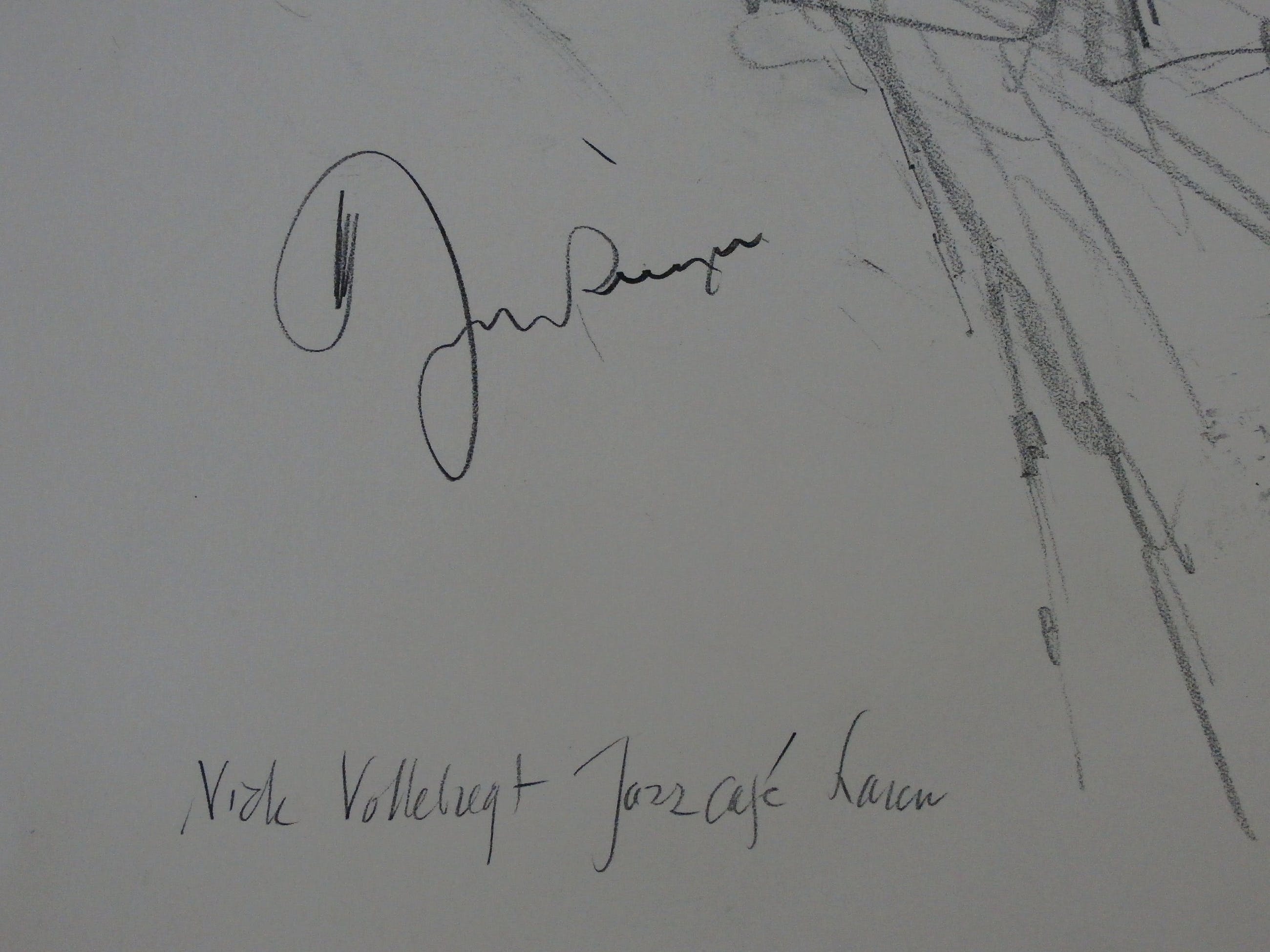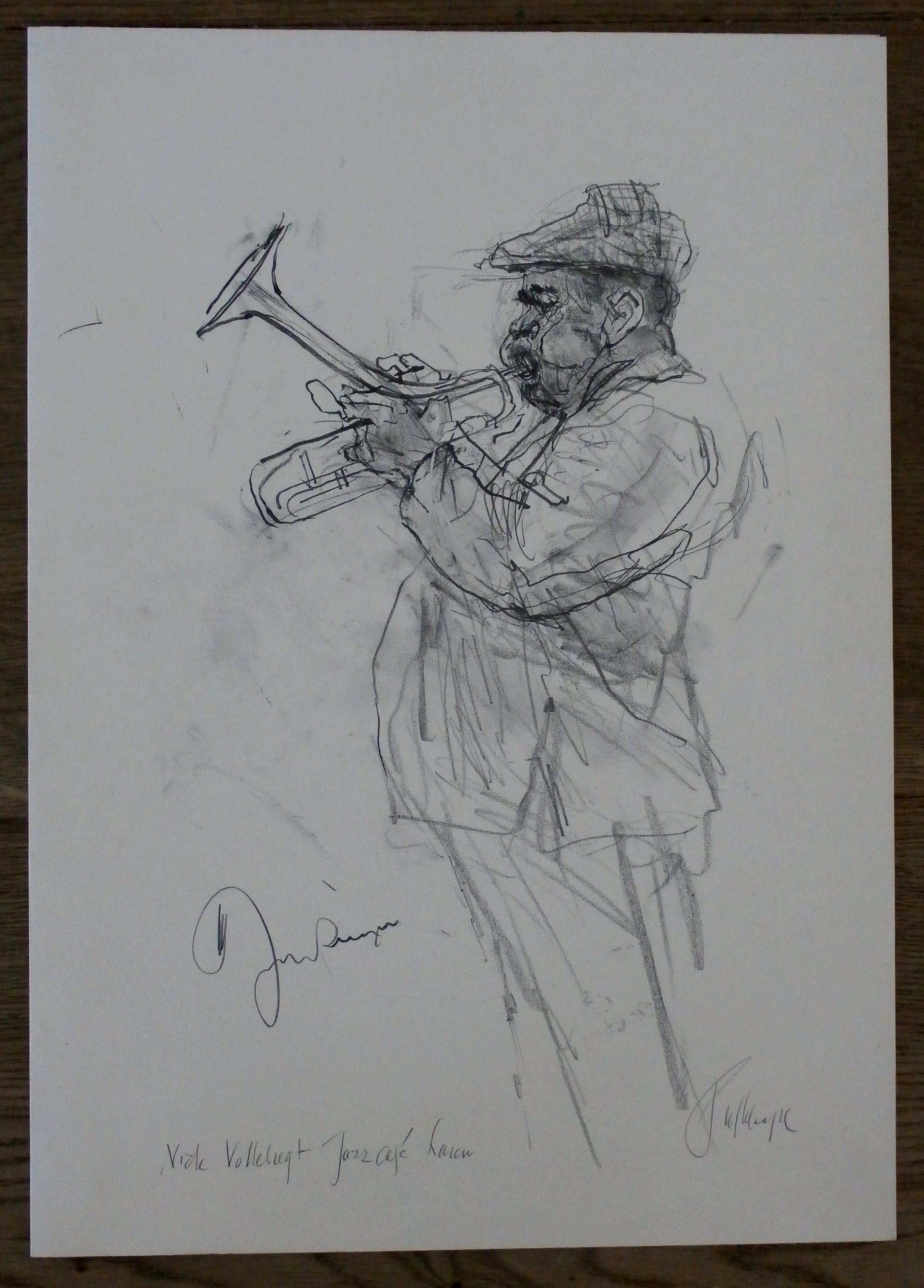 Tekening op voorblad van Piet Klaasse: Nick Vollebregt Jazzcafé Laren. Rechtsonder met potlood gesigneerd. Daarnaast is er op het 3e blad een litho afgedrukt. Deze litho is rechtsonder met potlood gesigneerd en gedateerd '82. Op het 2e blad staat Voor Jan en Wiesje van Anne & Piet. Zeg toch maar Jazz! 83.