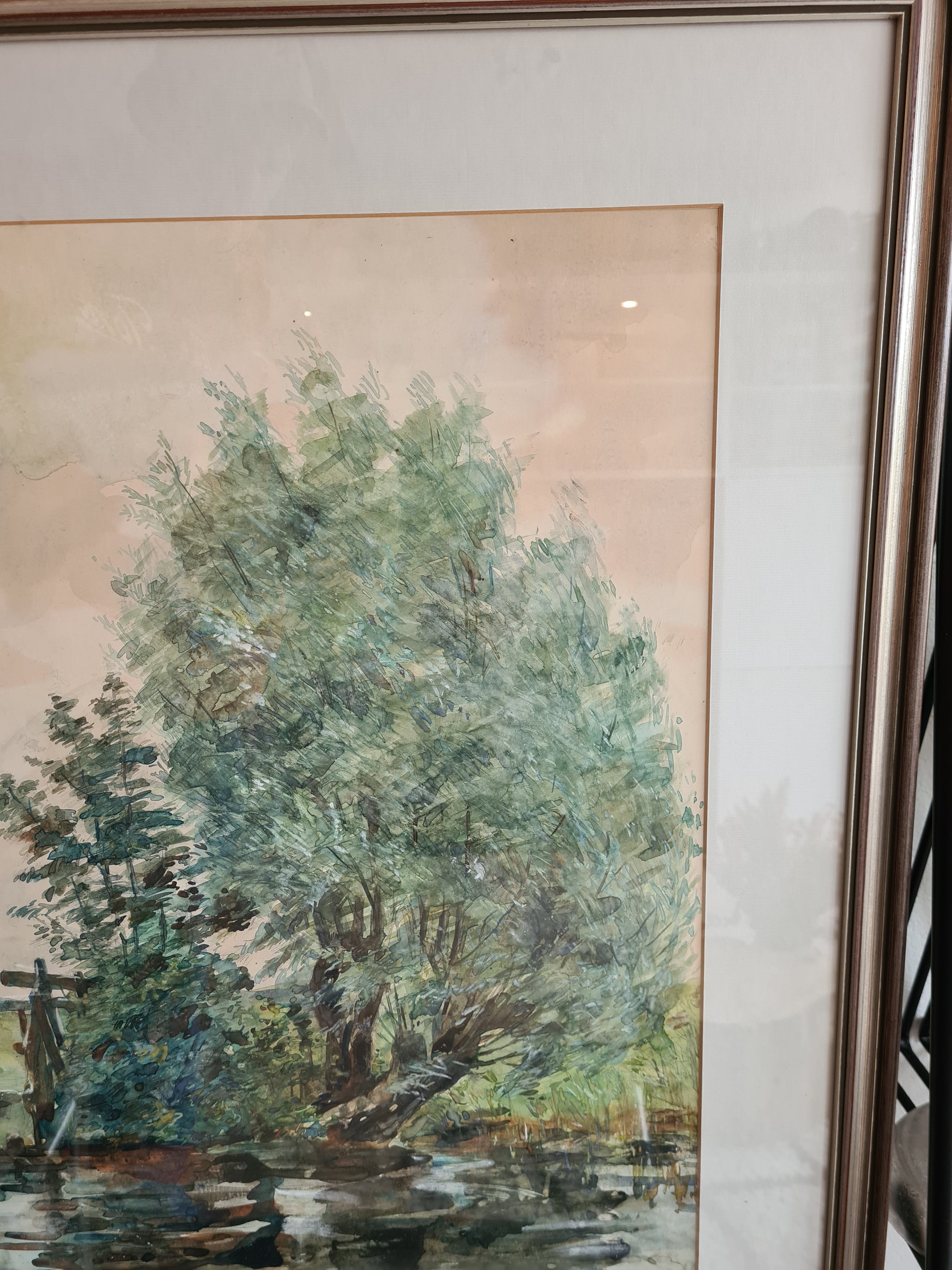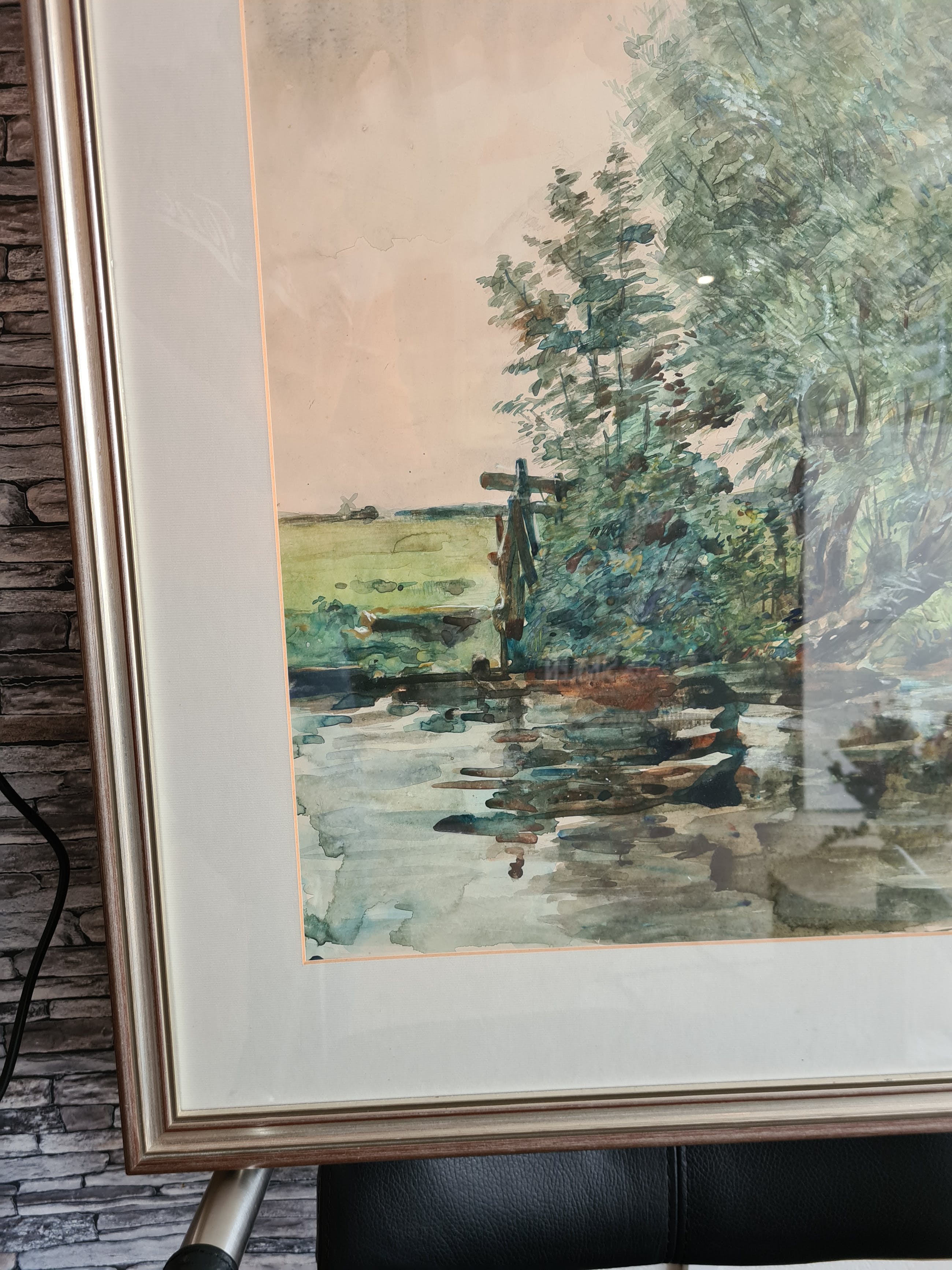 Mooie aquarel van de Delfse Schilder Pieter Cornelis Kramer 1879 - 1940, gesigneerd en gedateerd 1912, aquarel op papier of karton (niet na te gaan doordat het dichtgeniet is), maat van het passe partout is 63 x 48 cm, met lijst 85 x 68 cm. Dit werk toont een mooi polderlandschap met wilgen en water in de stijl van de Haagse school. Destijds aangekocht door vorige eigenaar bij de kunsthandel Muurtooi.